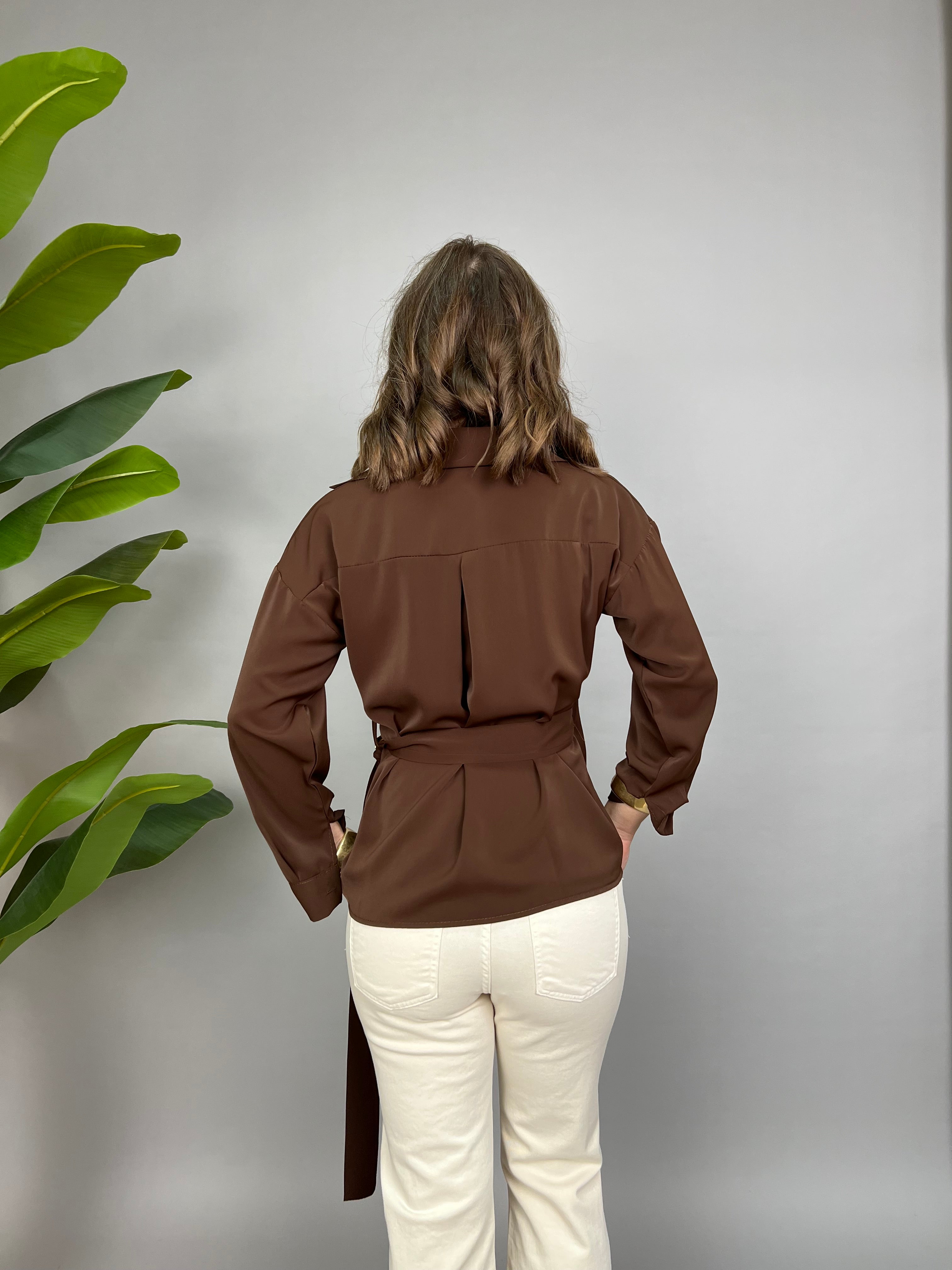Camicia a portafoglio con incrocio frontale e dettaglio dorato laterale. La chiusura può essere regolata.