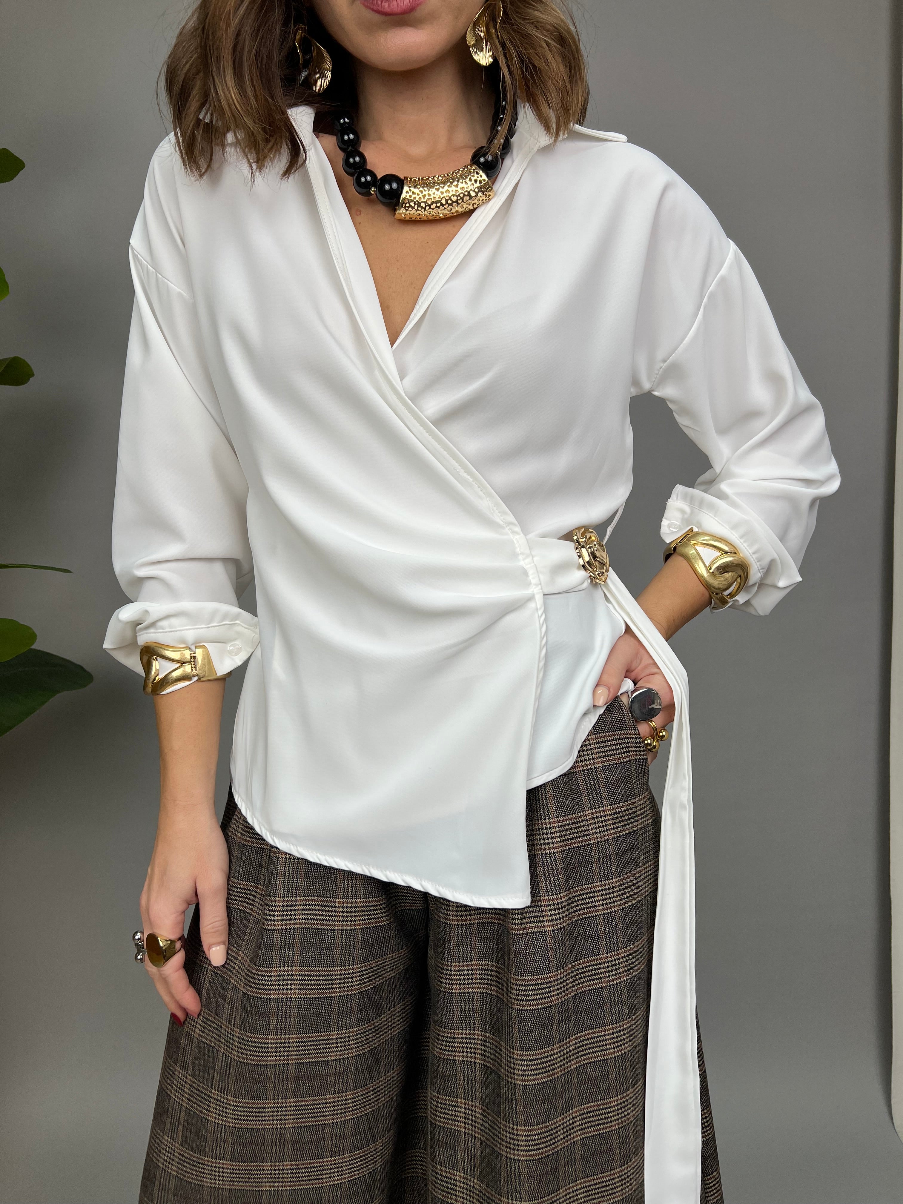 Camicia a portafoglio con incrocio frontale e dettaglio dorato laterale. La chiusura può essere regolata.