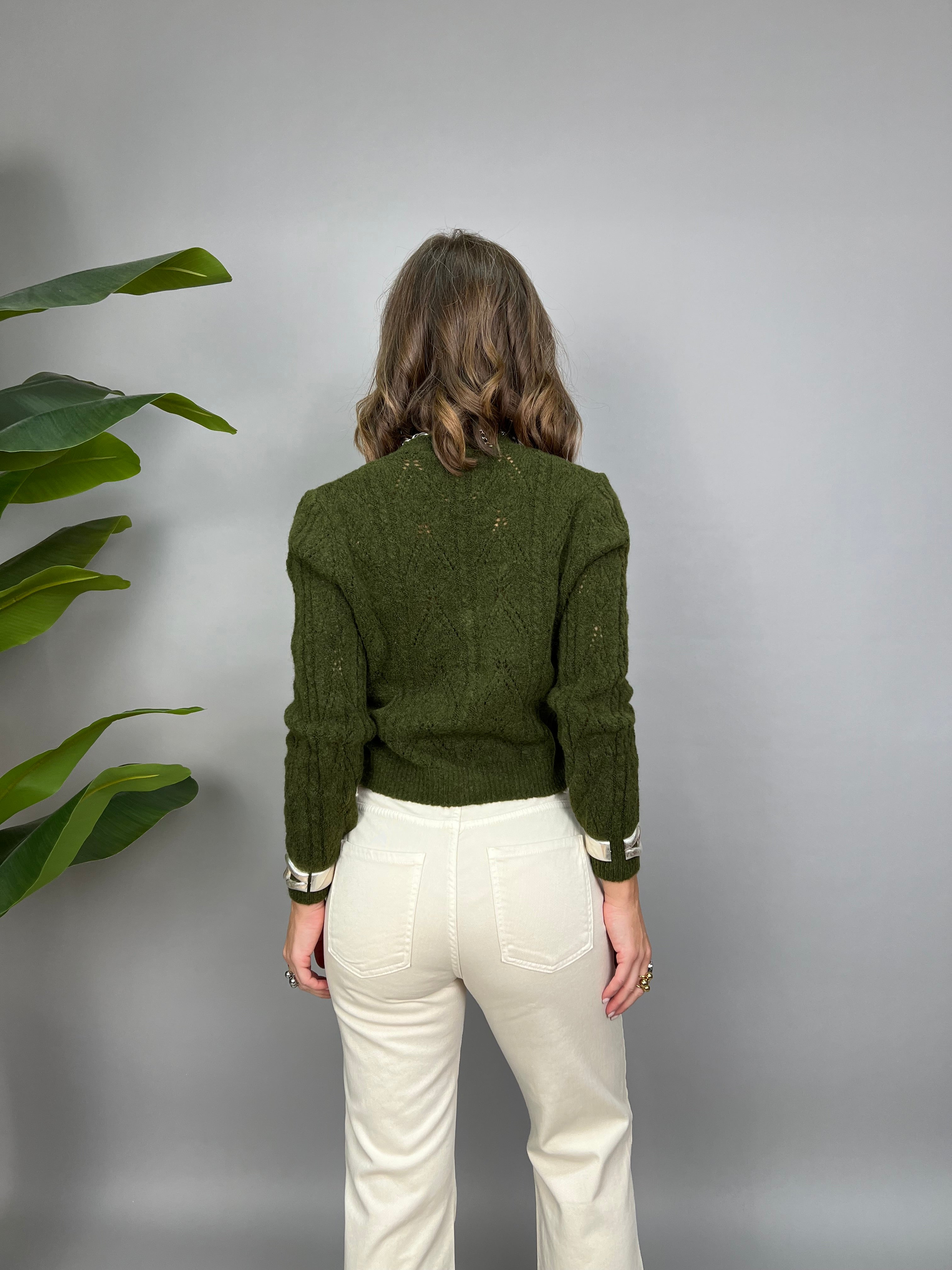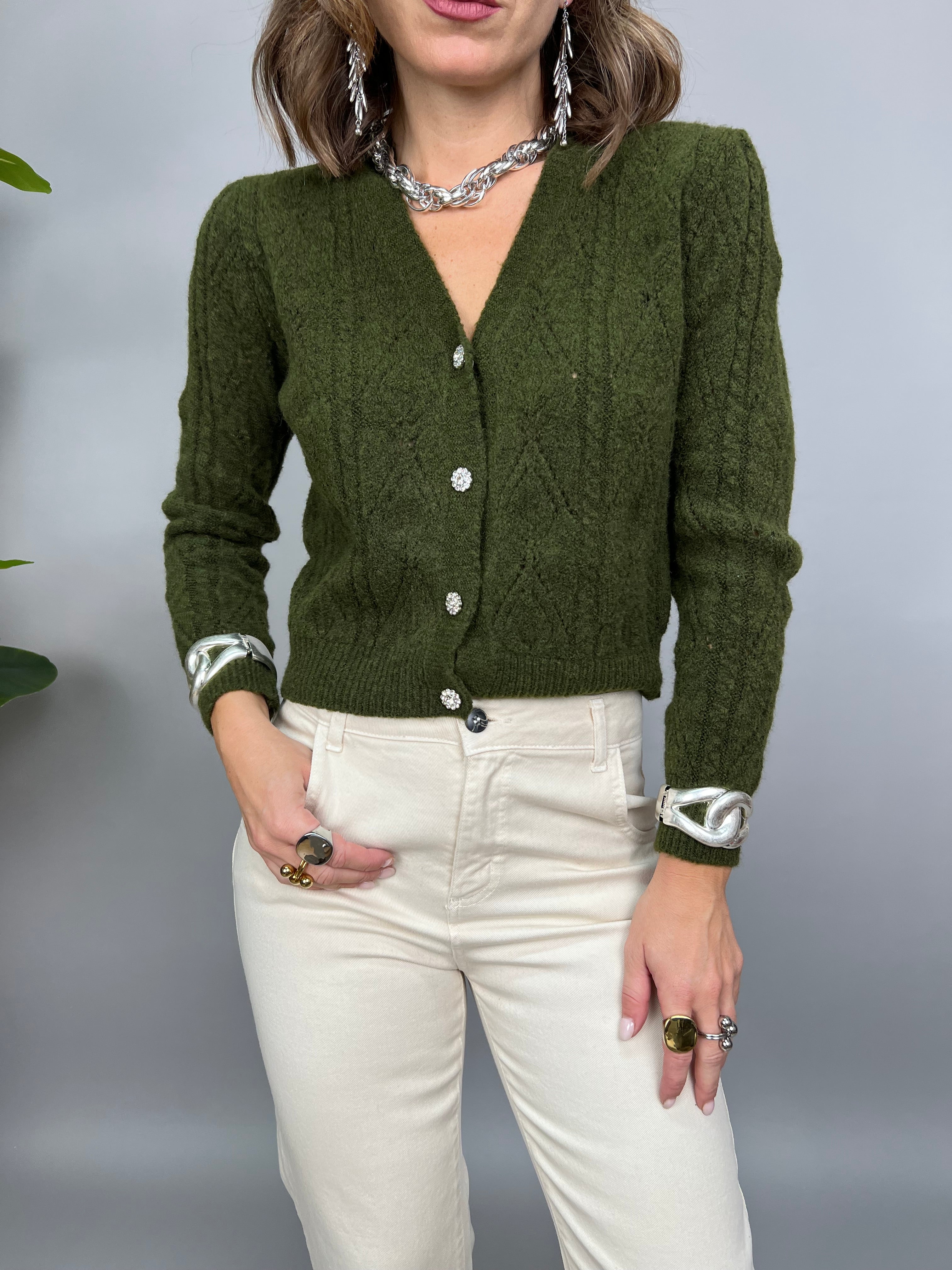 Cardigan morbido con lavorazione traforata e bottoni gioiello. La vestibilità è comoda
