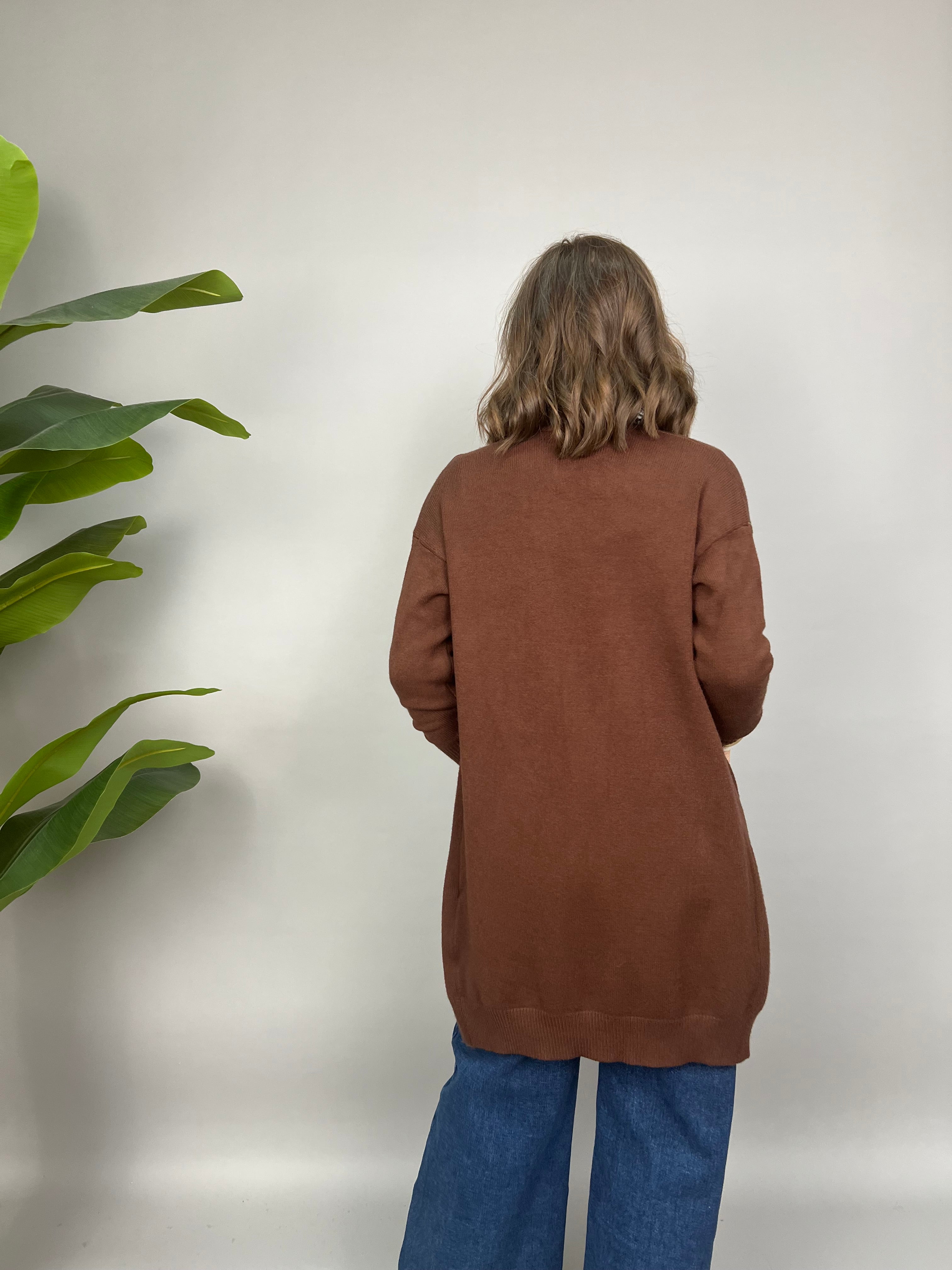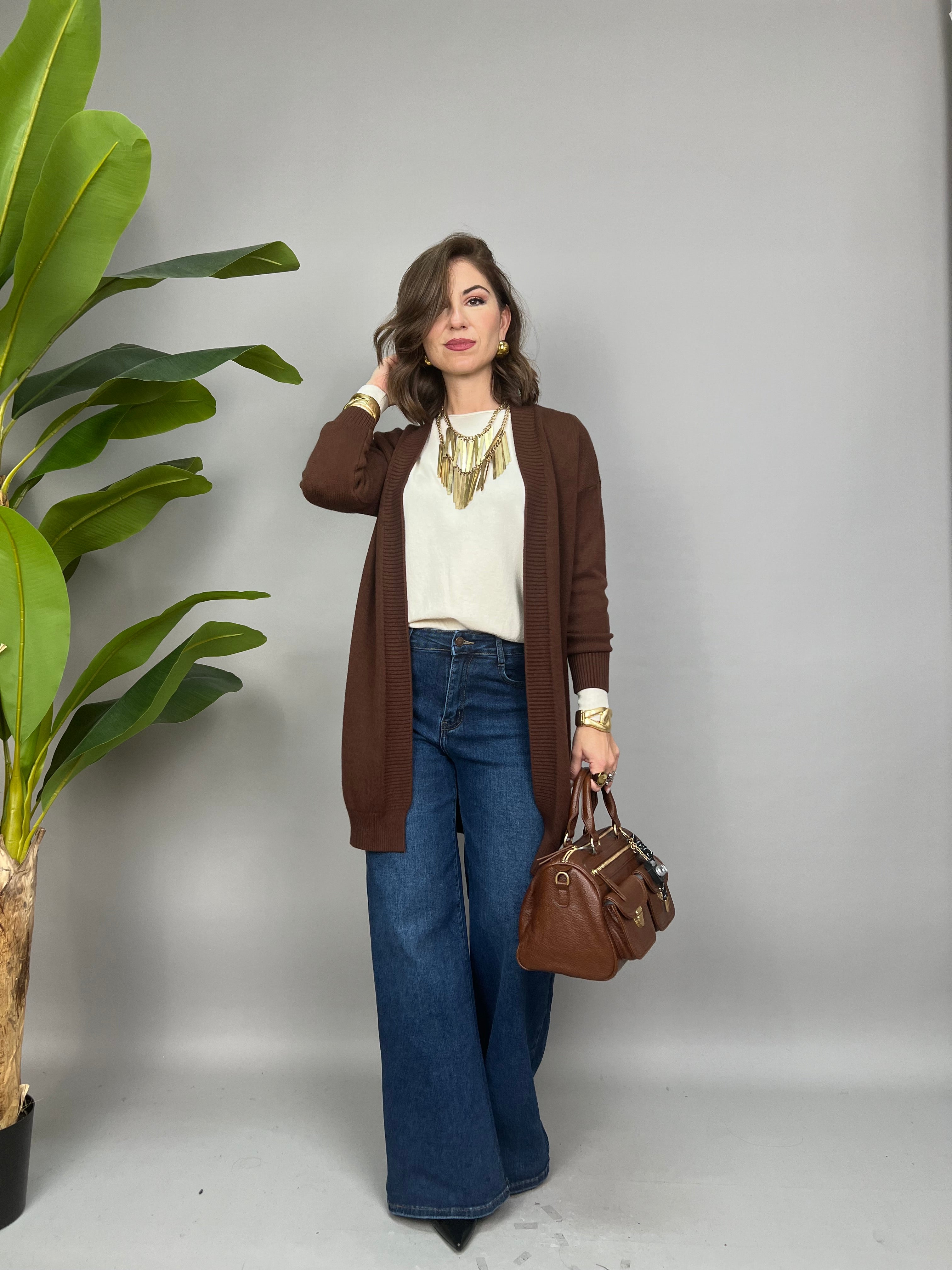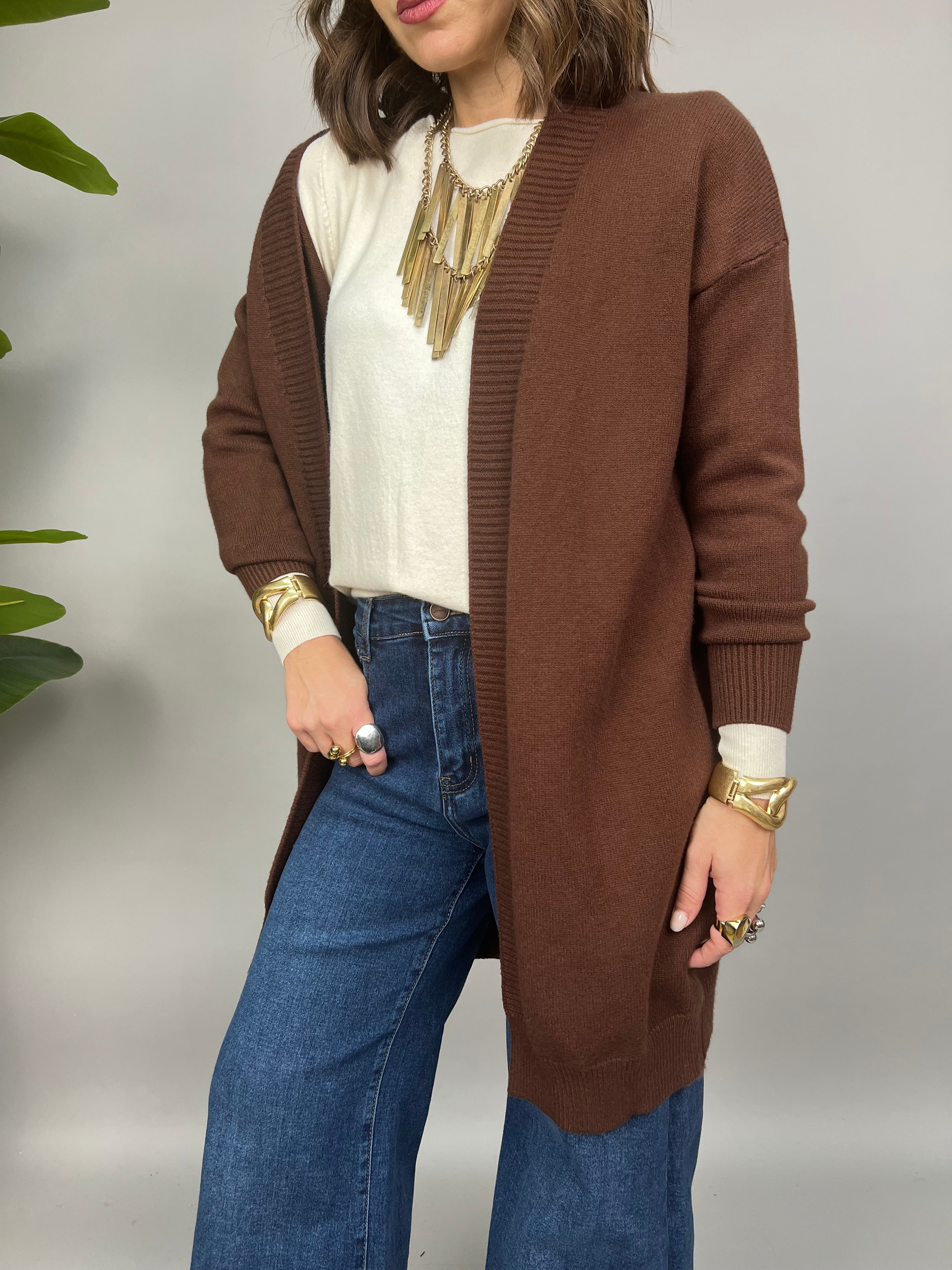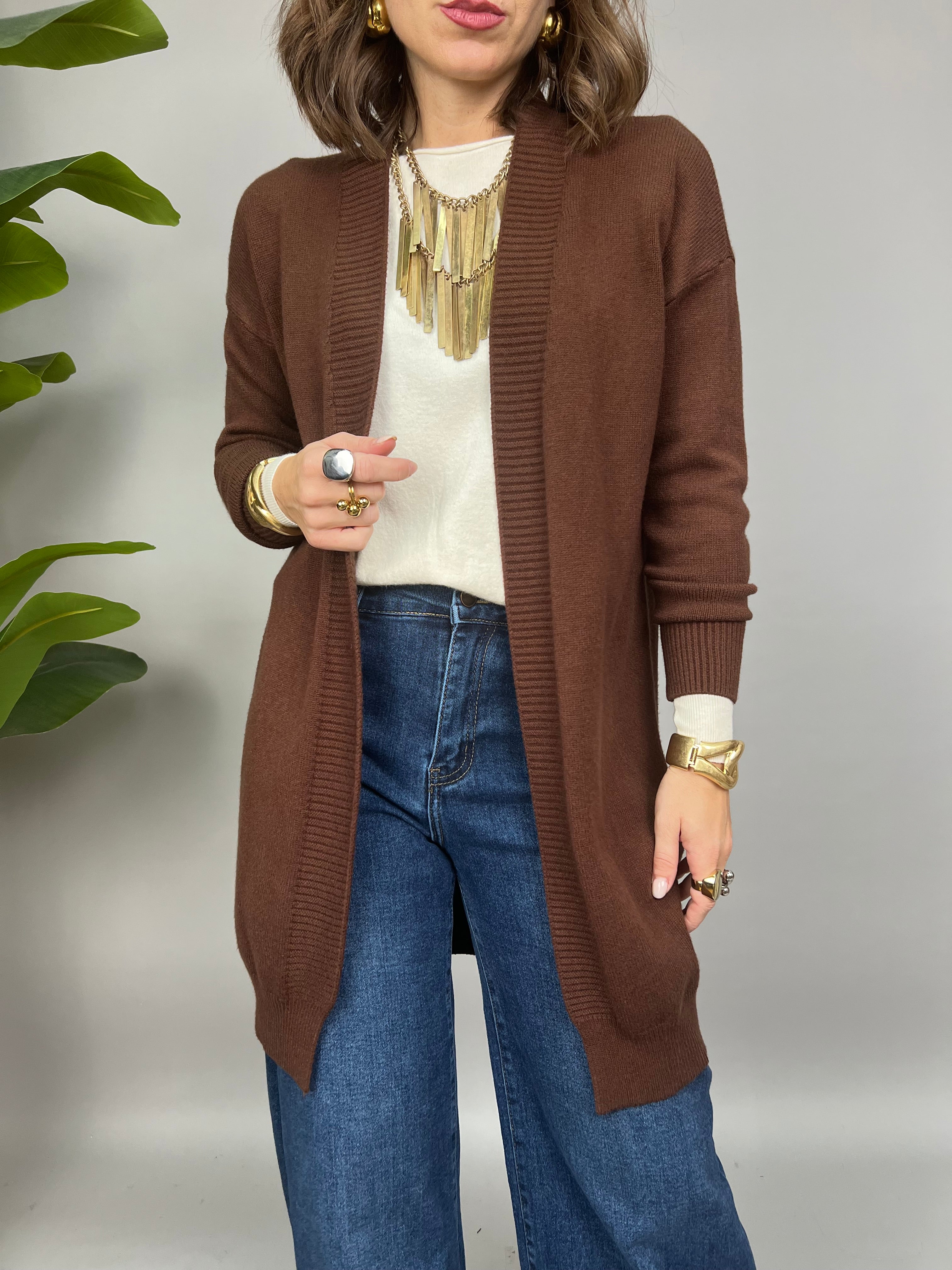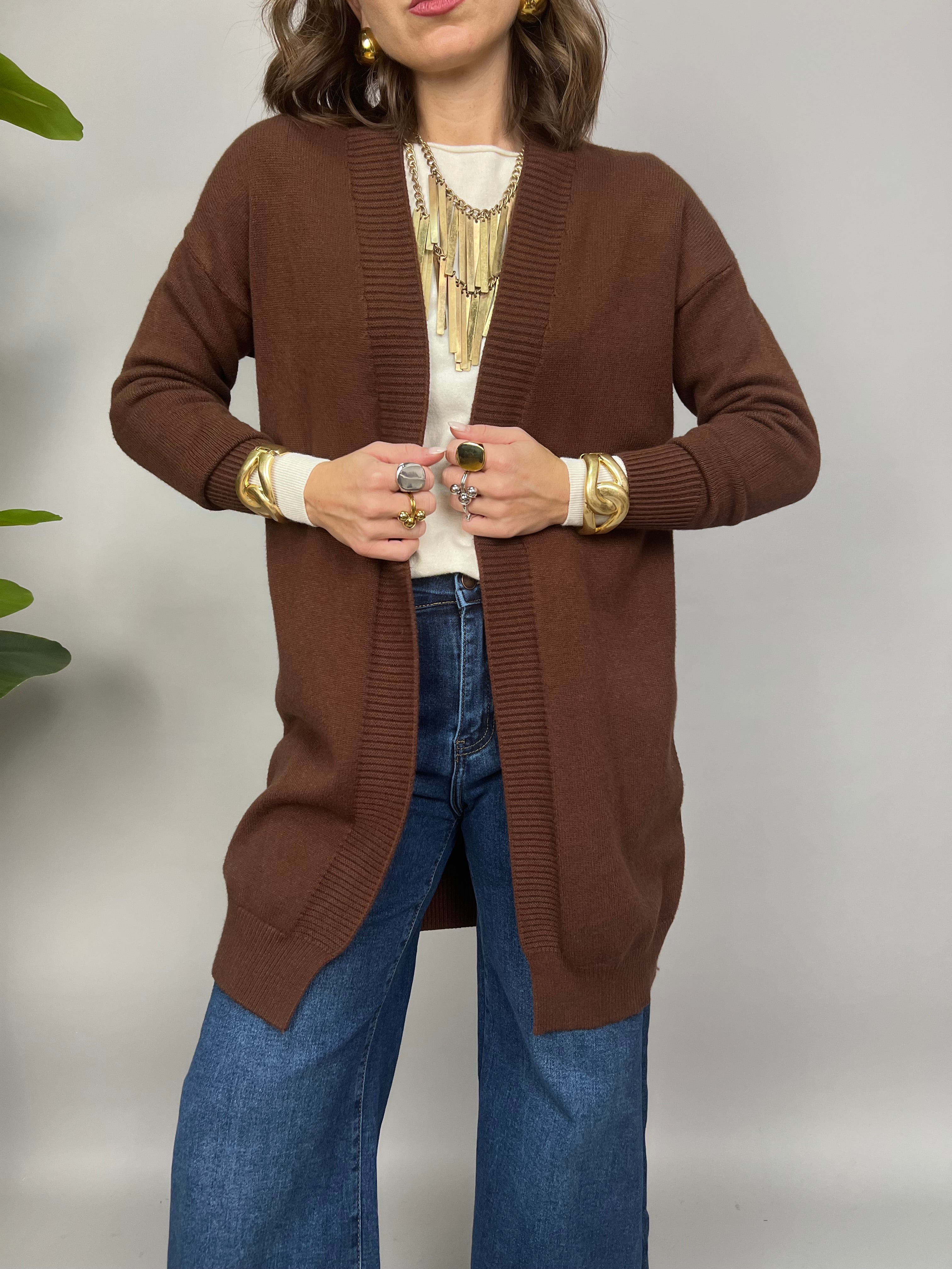 Cardigan in maglia doppia elasticizzata con lunghezza fino a sopra le caviglie.