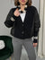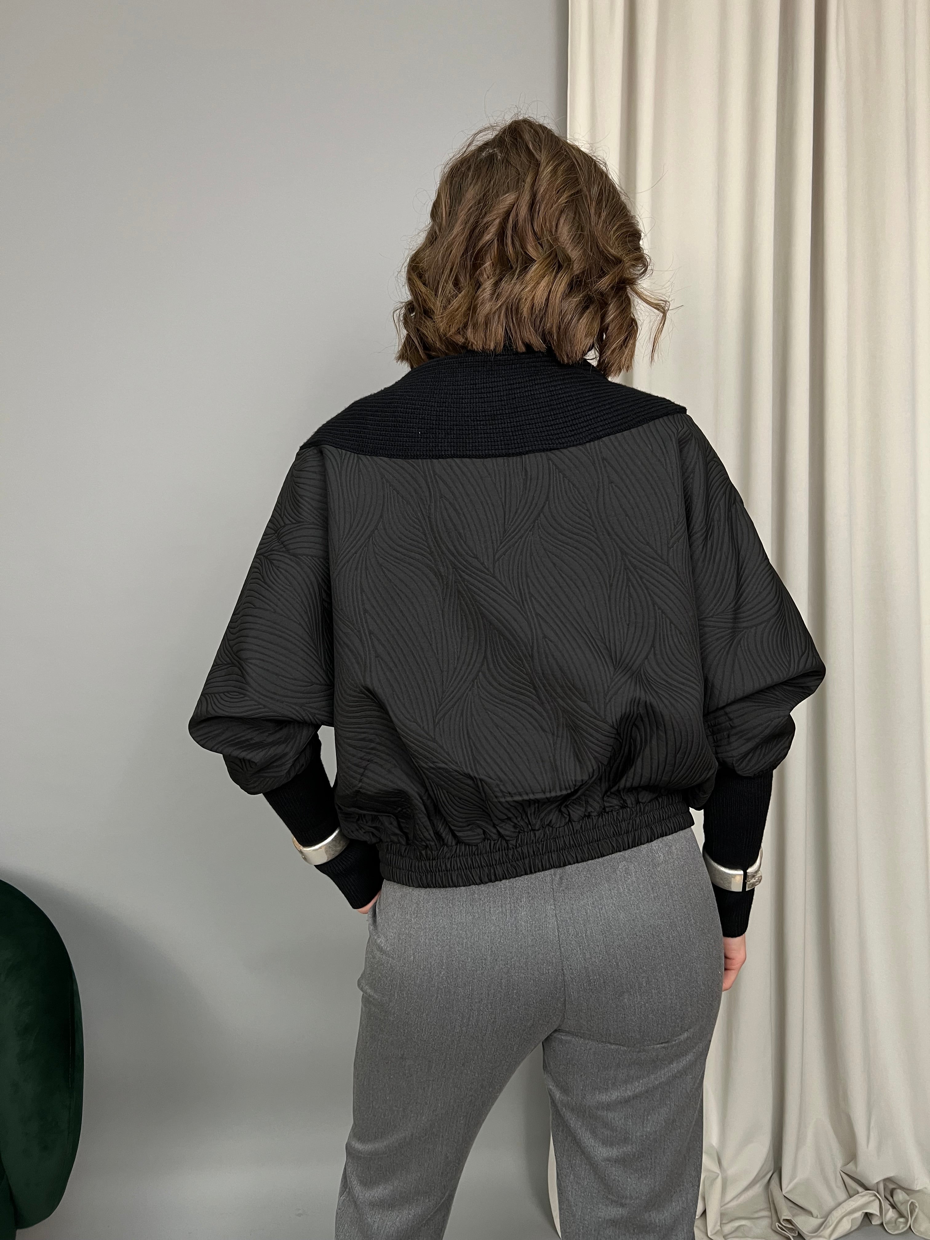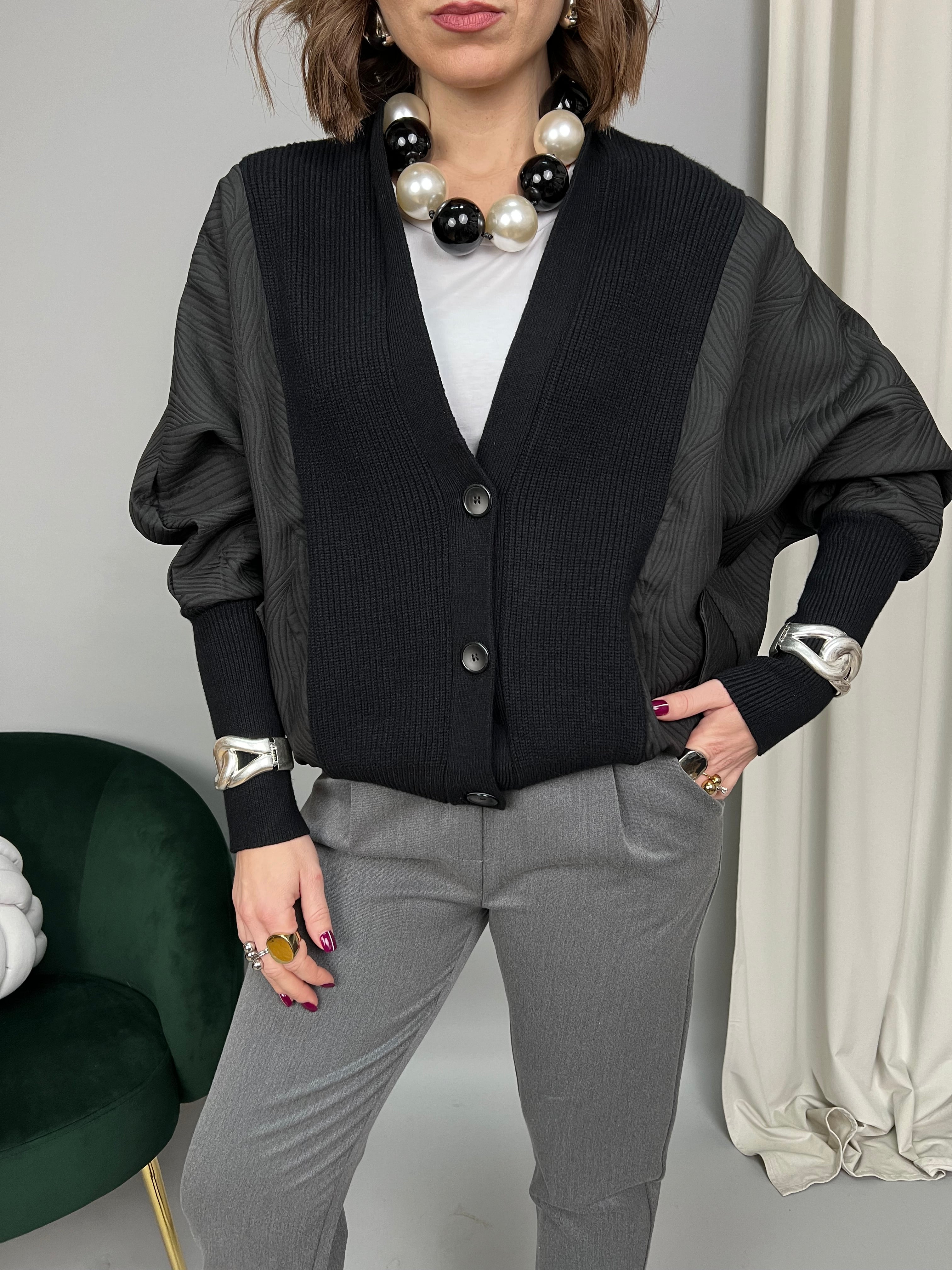 Cardigan modello "Bomber" dallo scollo a V, maniche leggermente a pipistrello, polsini lunghi e chiusura frontale con bottoni. Il modello è caratterizzato dall'insieme di due tessuti. La vestibilità è comoda. Presenta due tasche laterali.