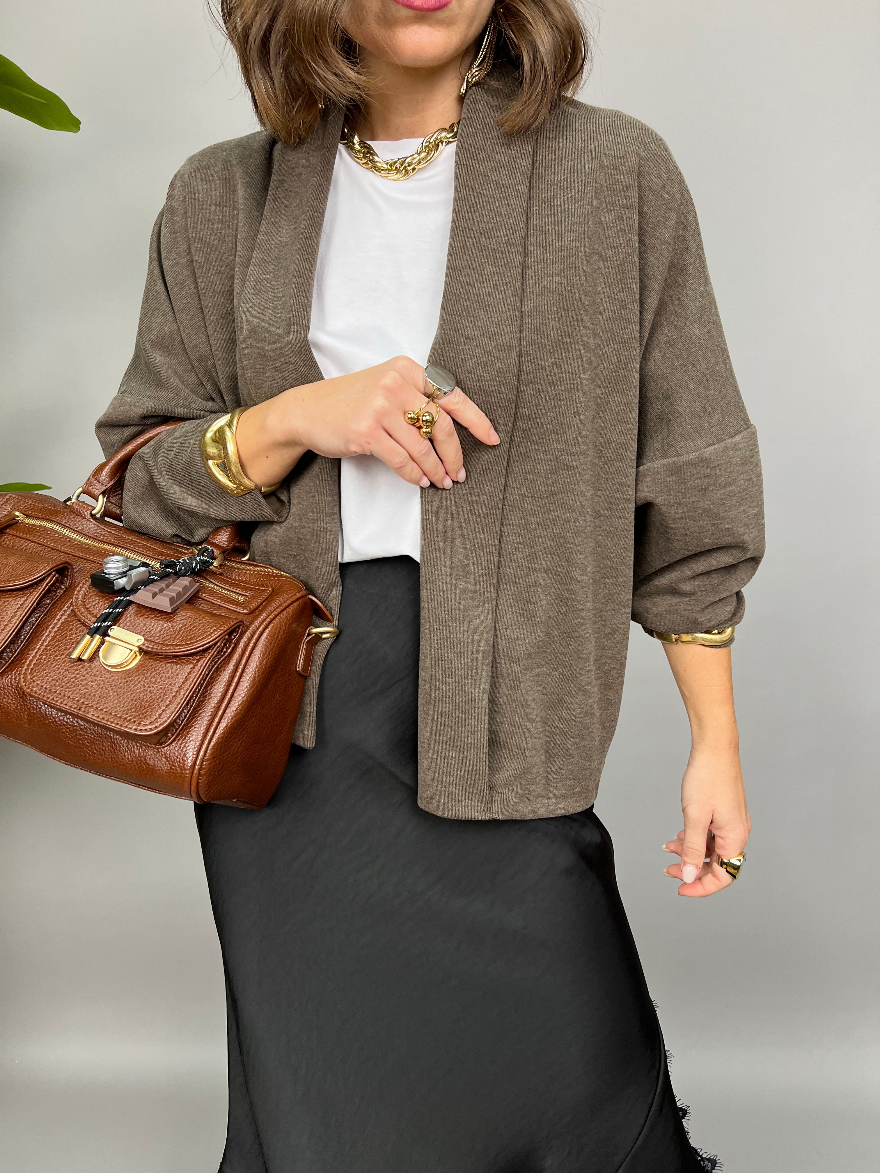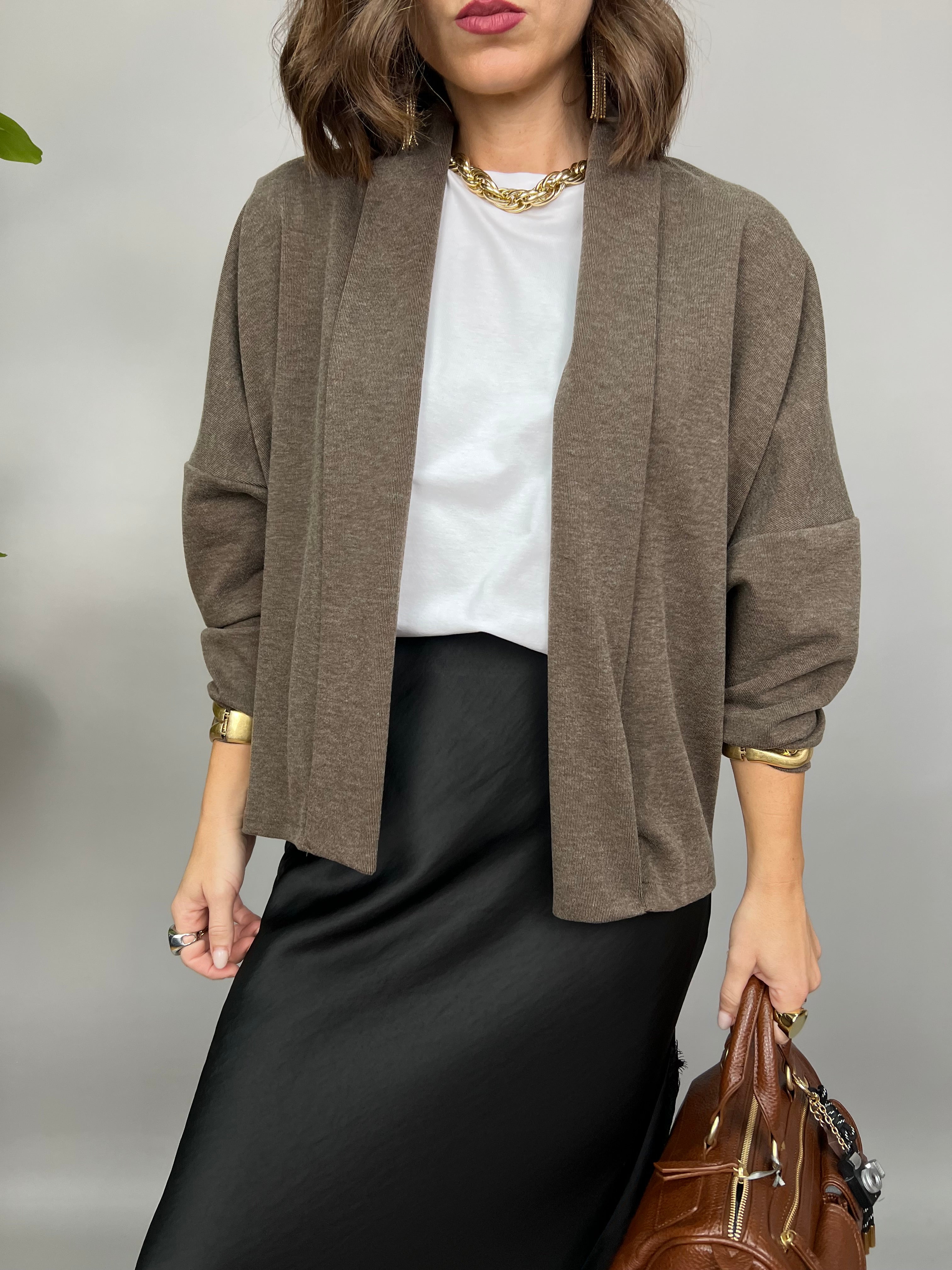 Cardigan in tessuto morbido al tatto e caldo. Il modello ha una manica comoda e non presenta chiusura