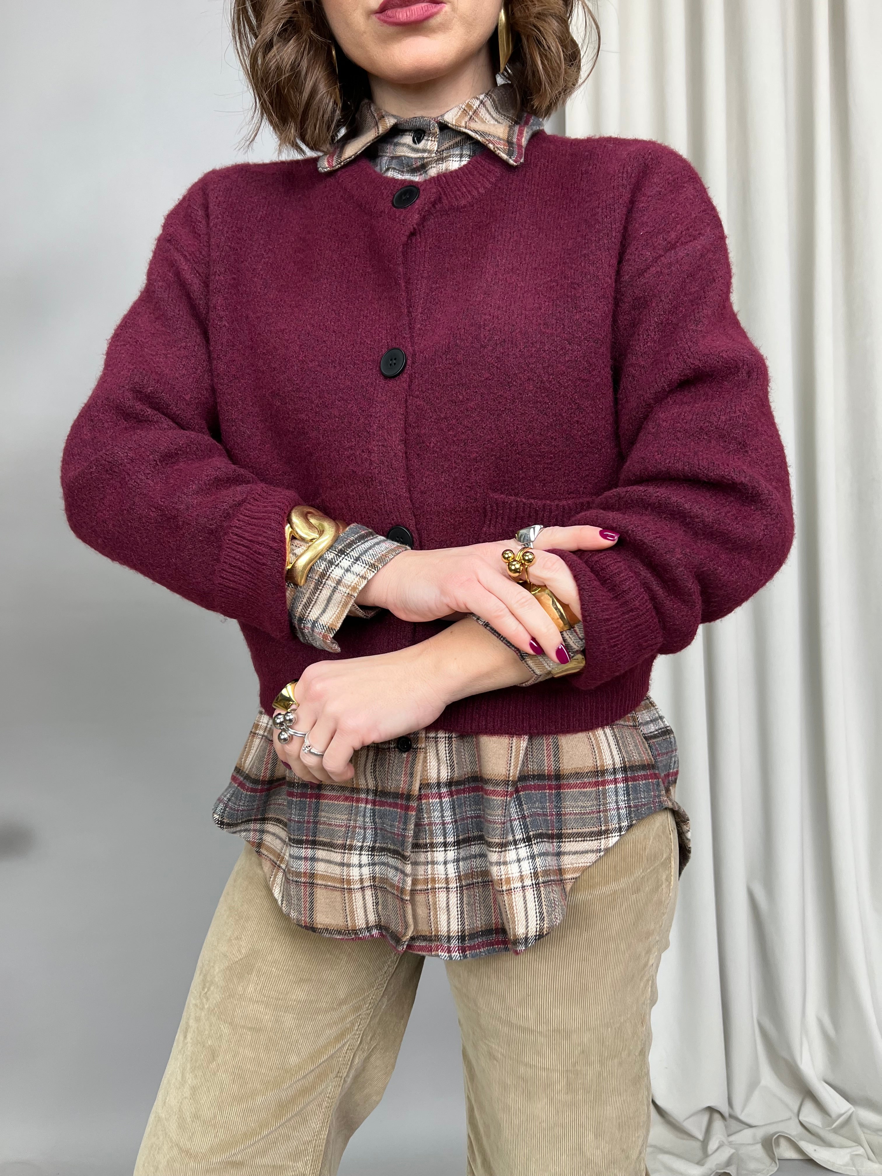 Cardigan con scollo tondo, chiusura a bottoni e taschine frontali. Il modello è in tessuto molto morbido e caldo. La vestibilità è comoda.