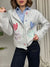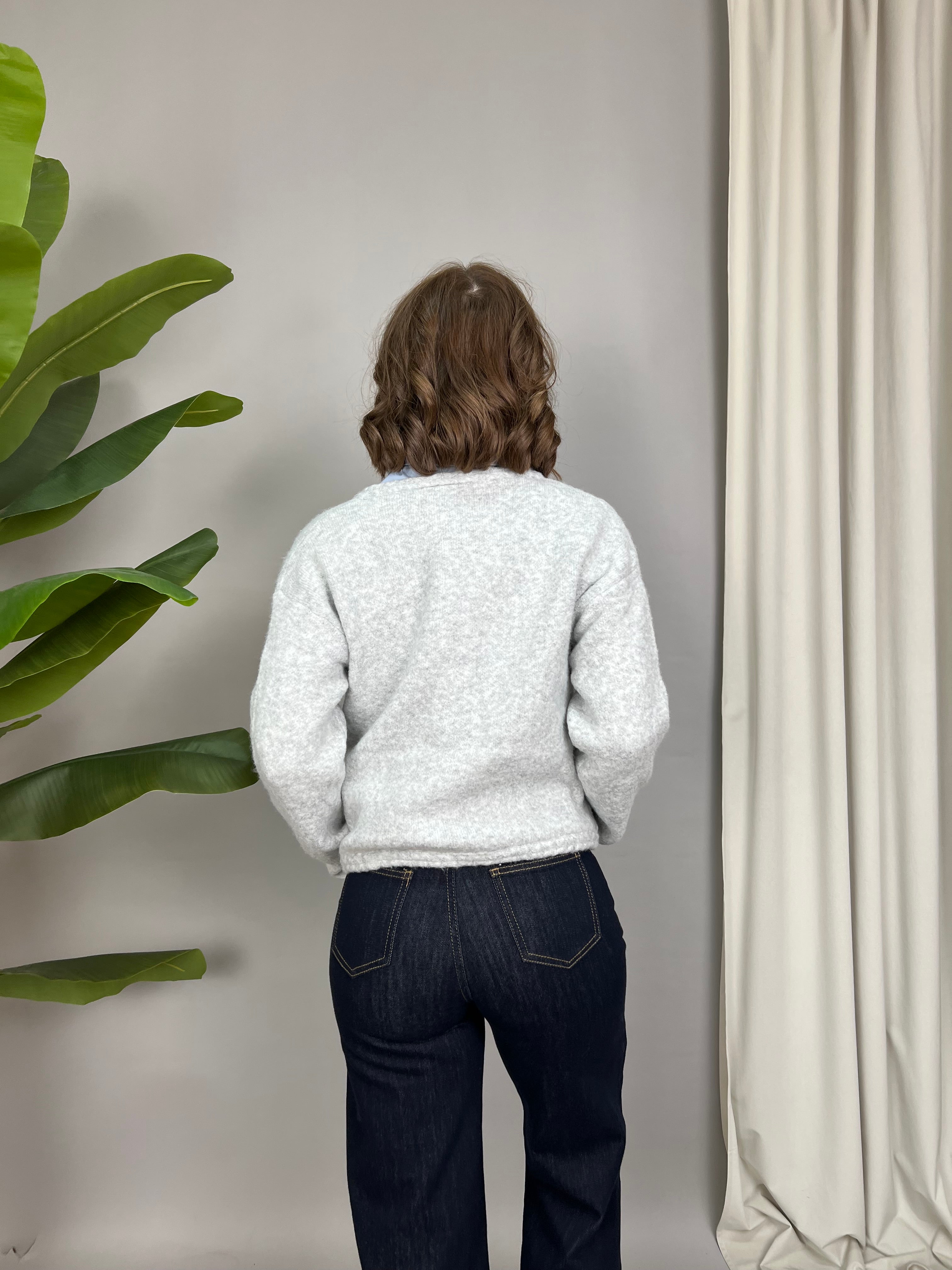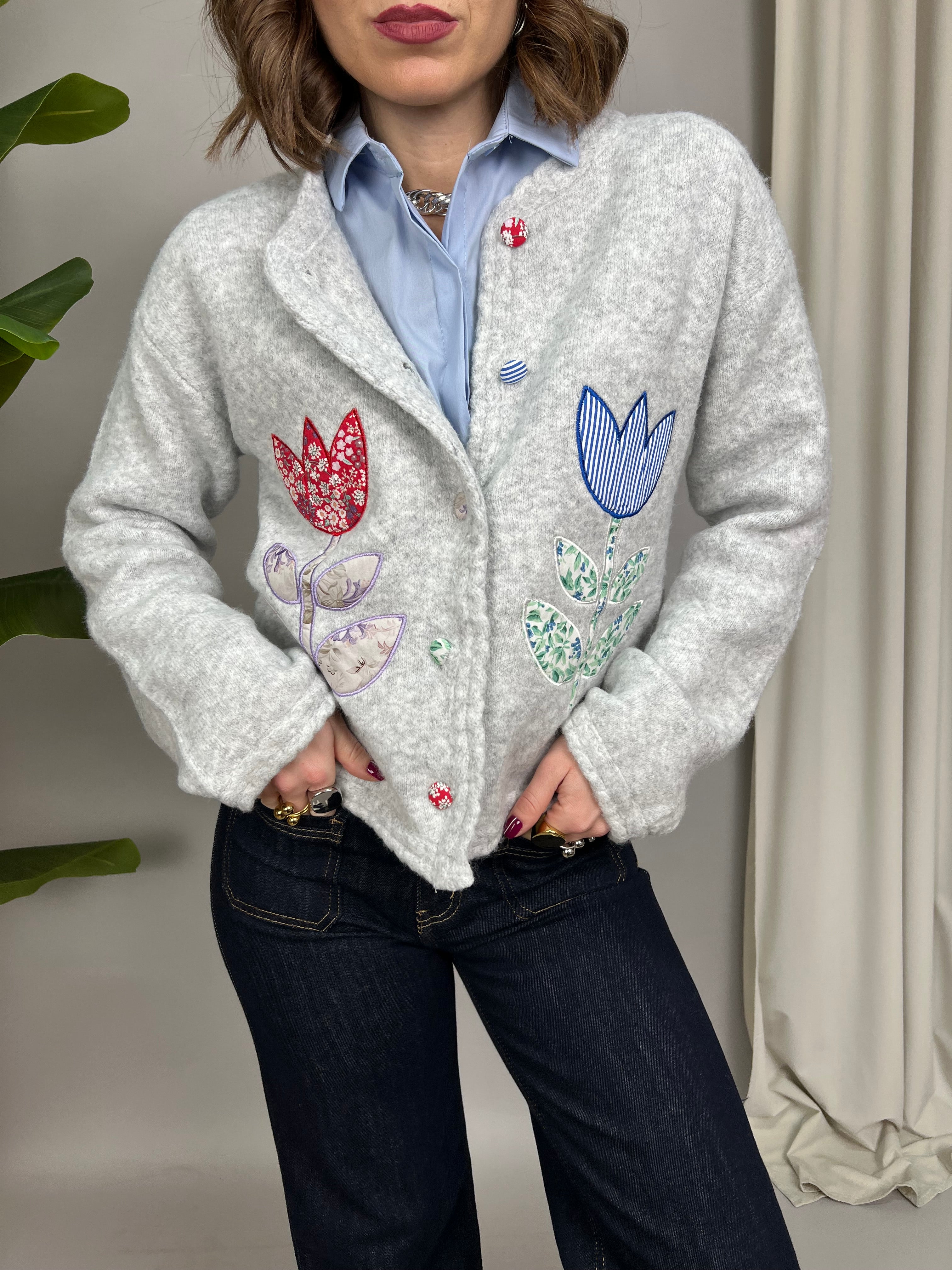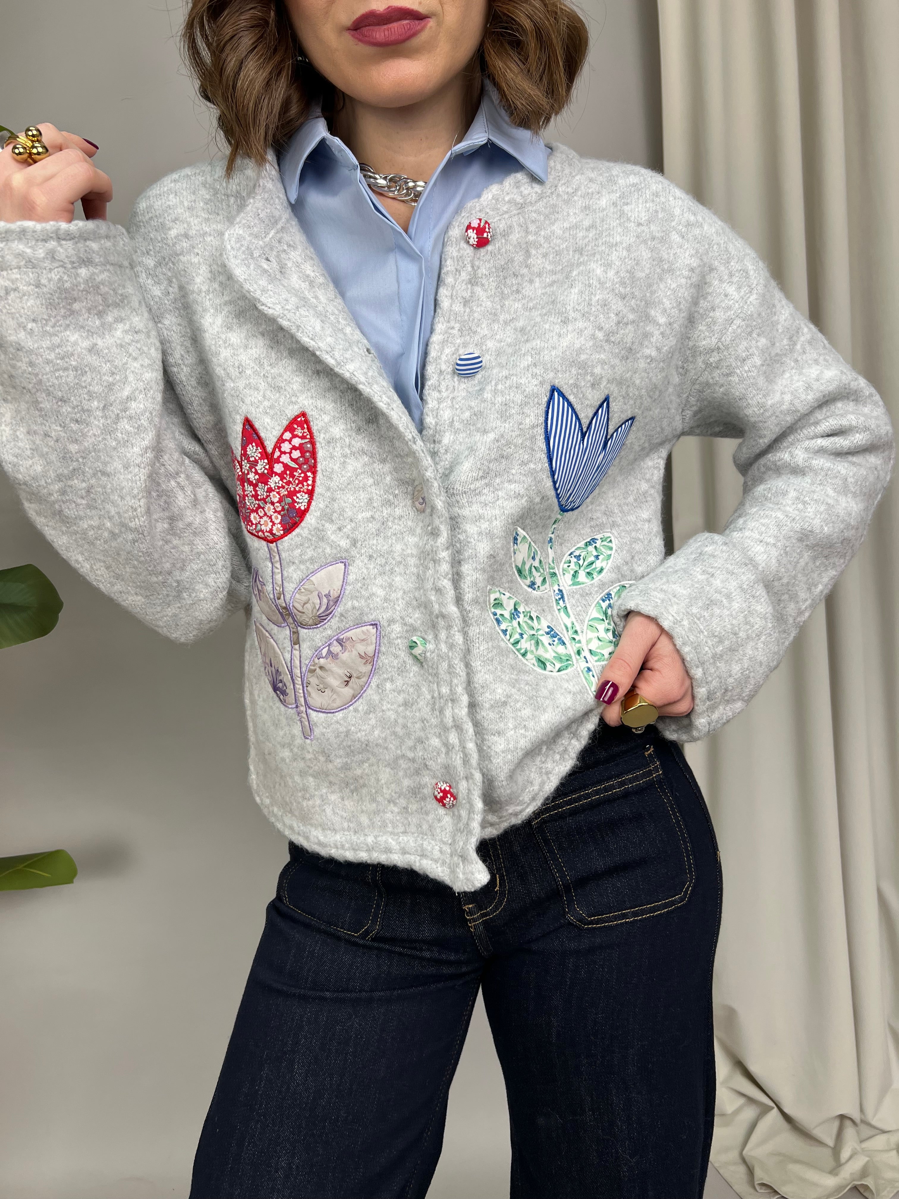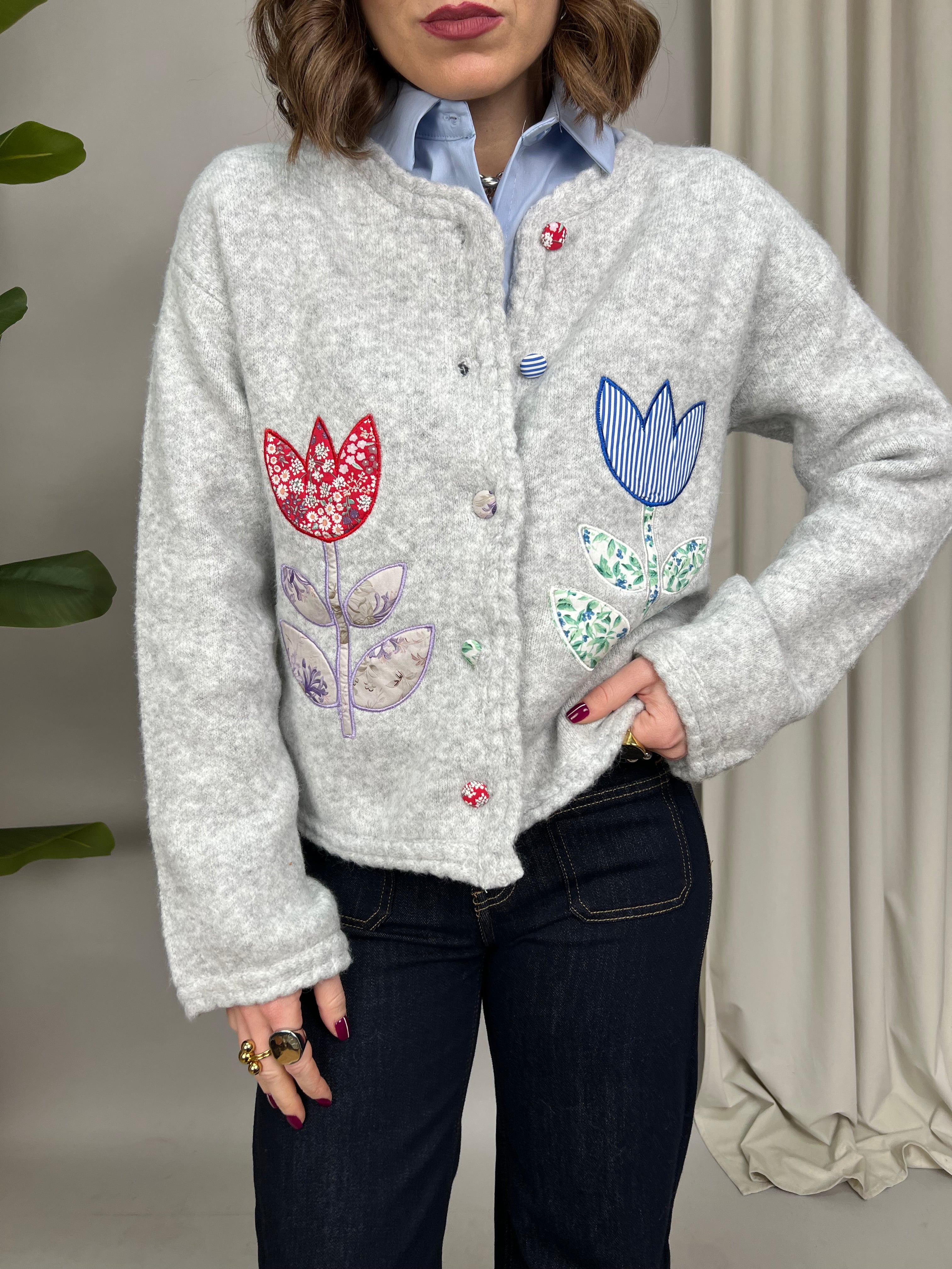 Cardigan dallo scollo tondo, chiusura con bottoni rivestiti in tessuto colorato. Il modello è in maglia molto morbida e calda. La vestibilità è comoda. Presenta un'applicazione in stoffa di due tulipani sulla parte frontale.
