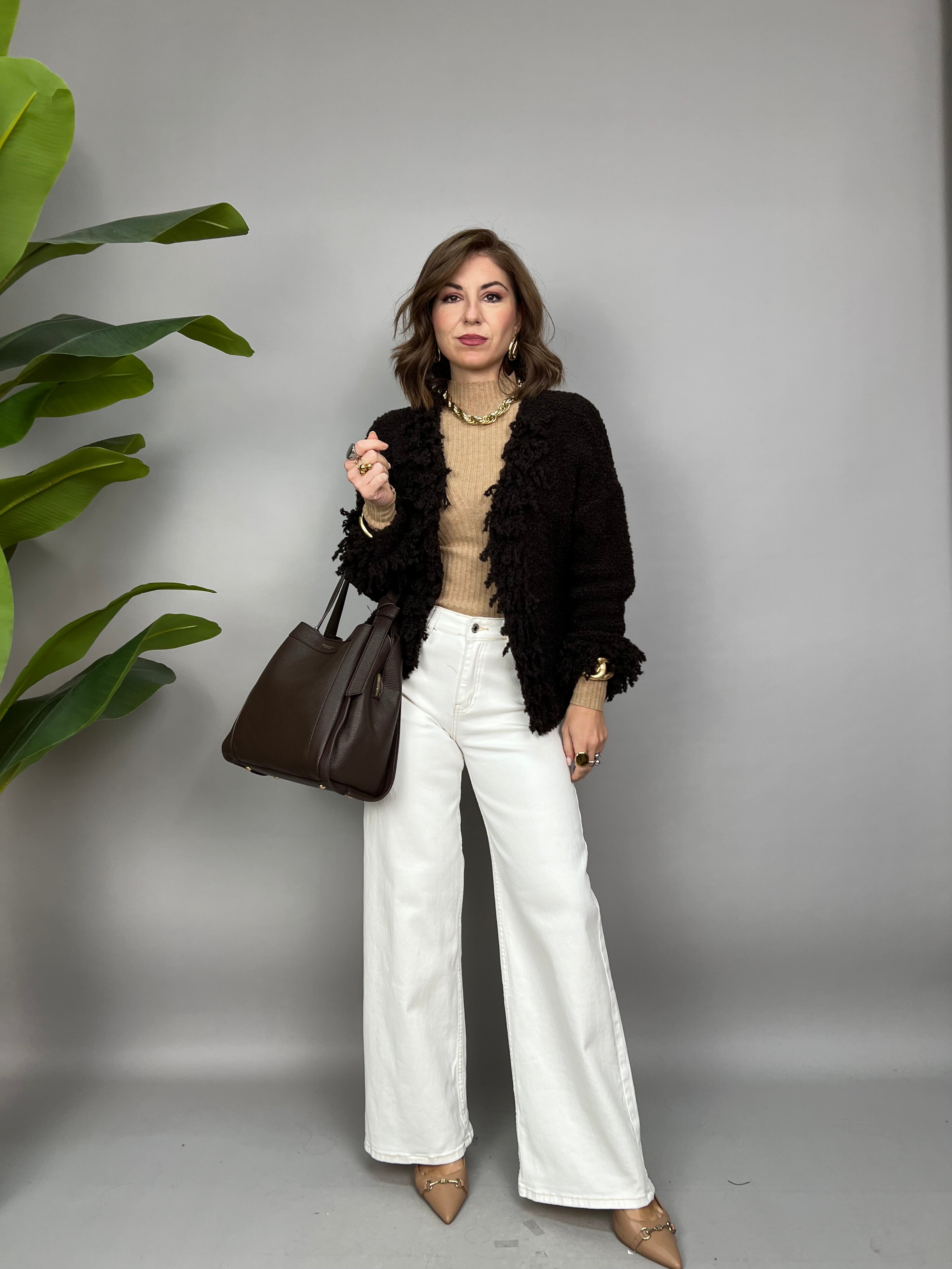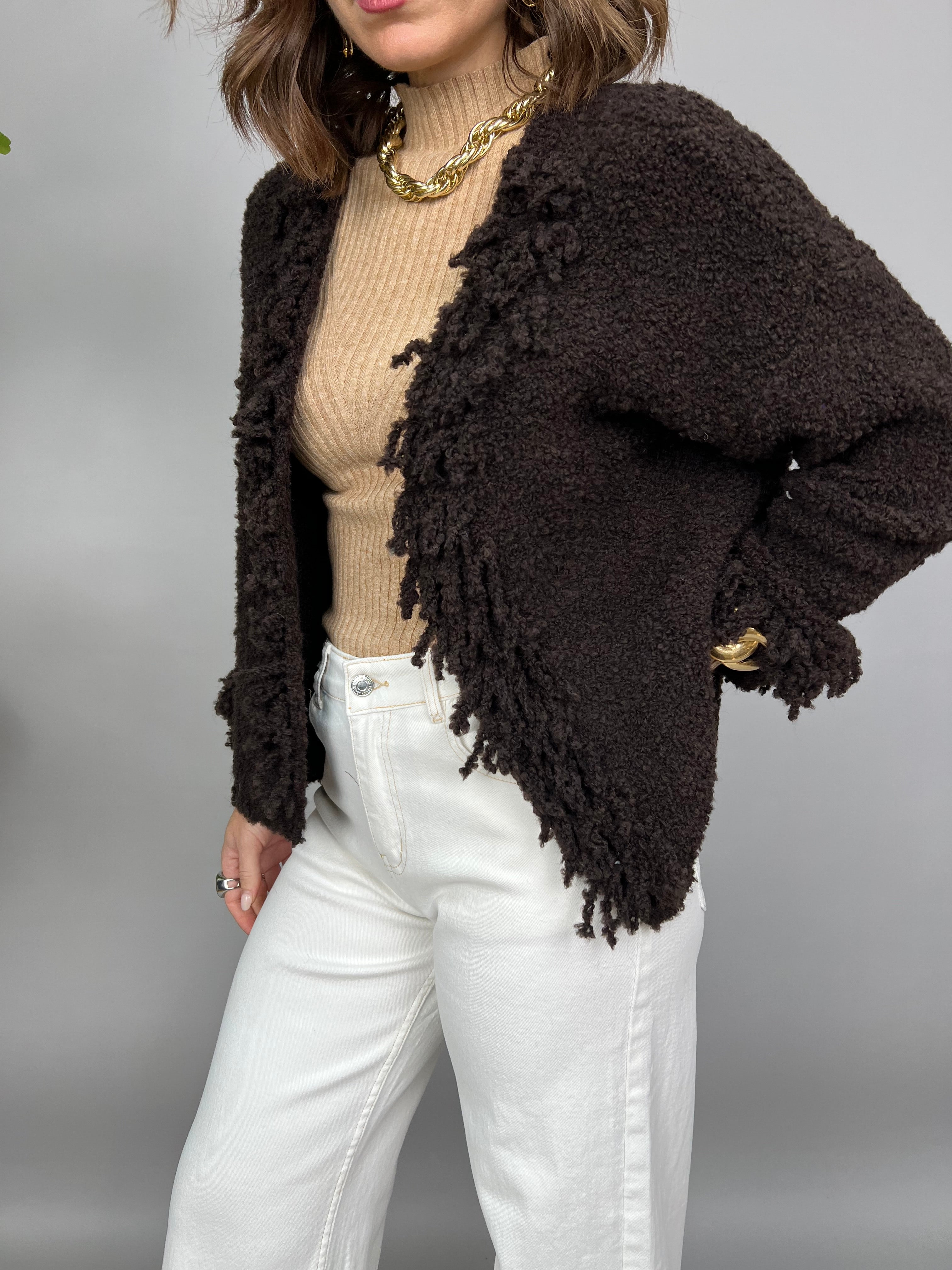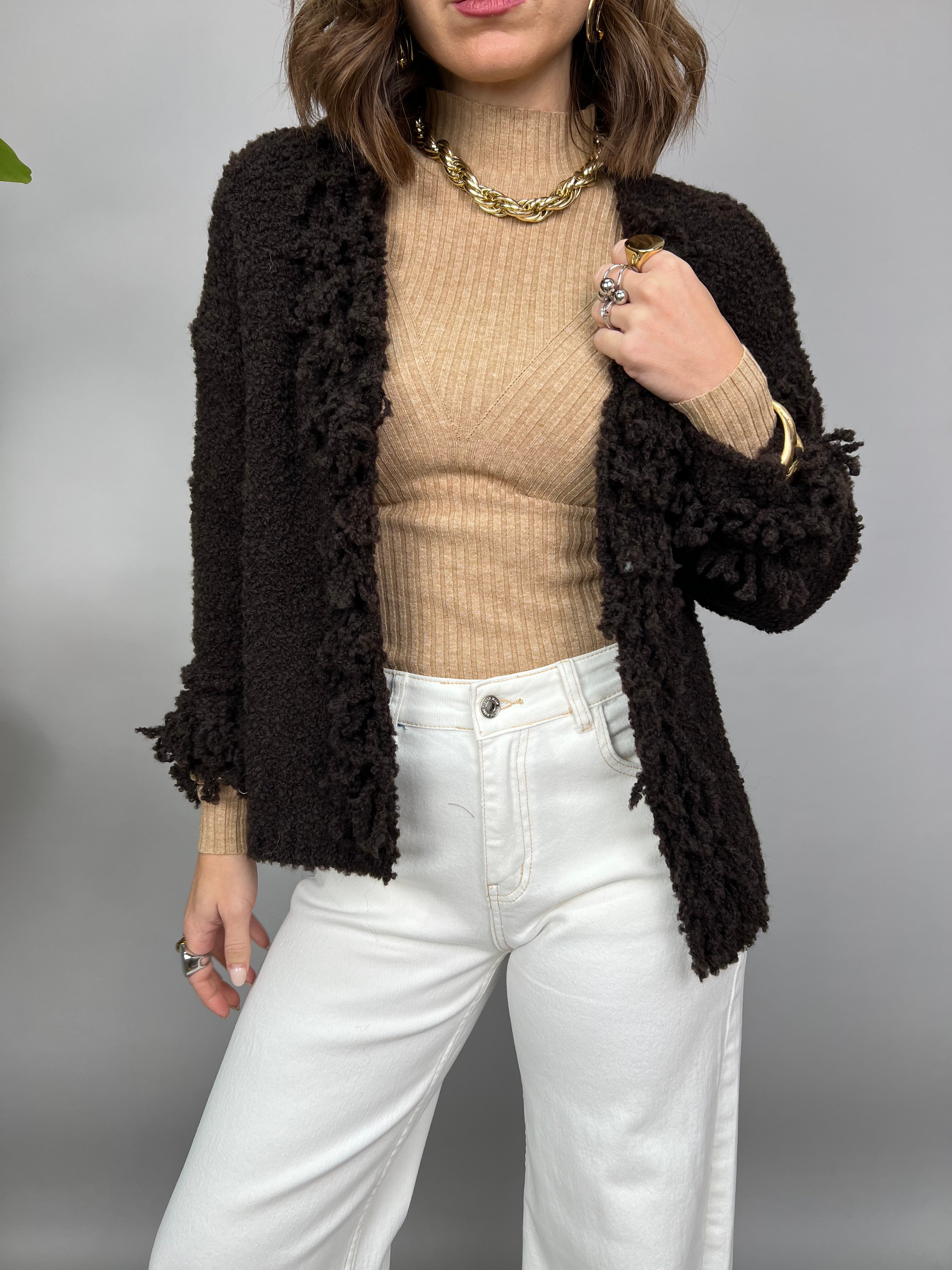 Cardigan aperto in tessuto caldo e morbido. Presenta frange sull'apertura frontale e lunghezza maniche.