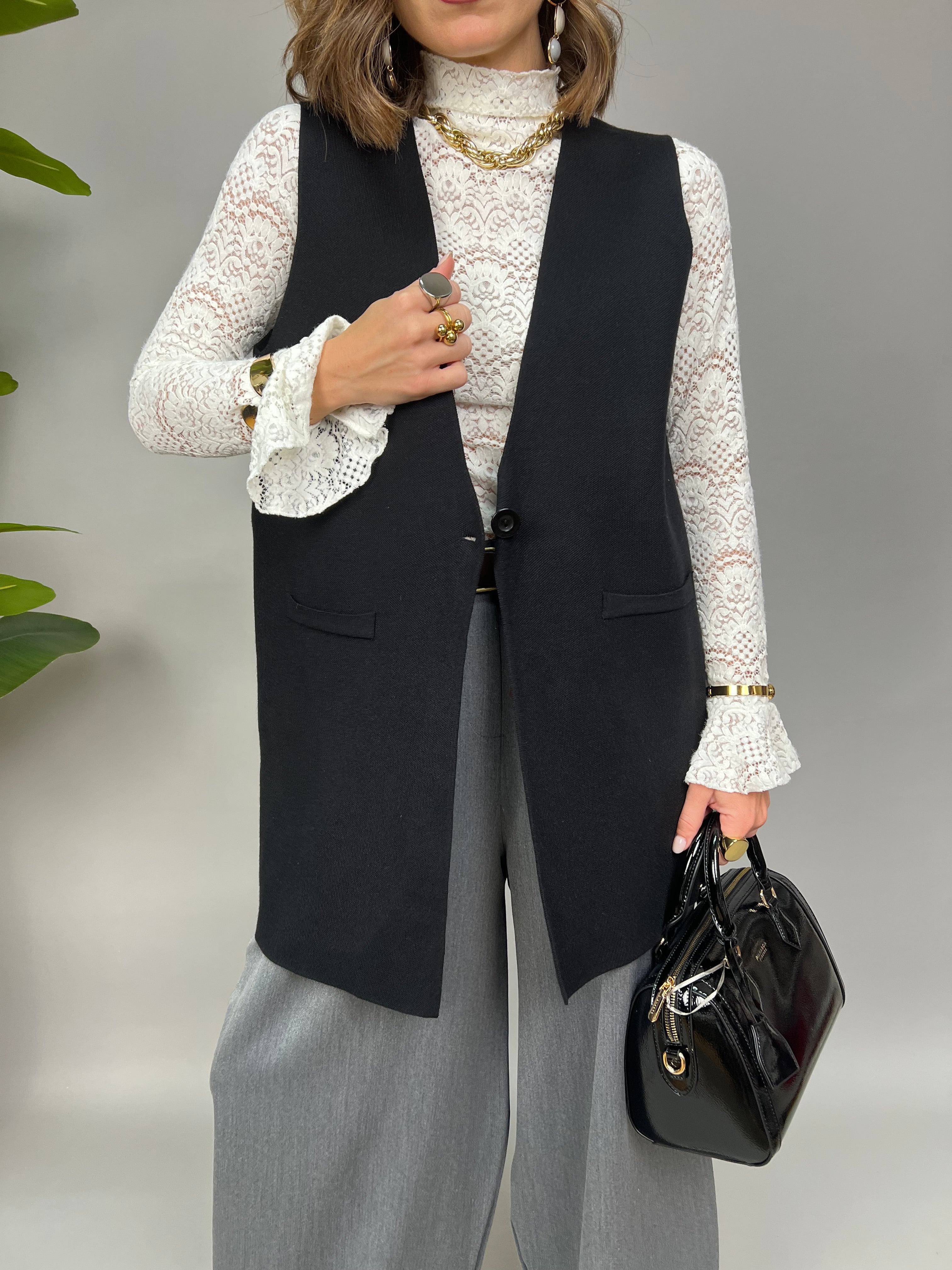 Maxi Gilet in maglia doppia con chiusura frontale. Il taglio è dritto