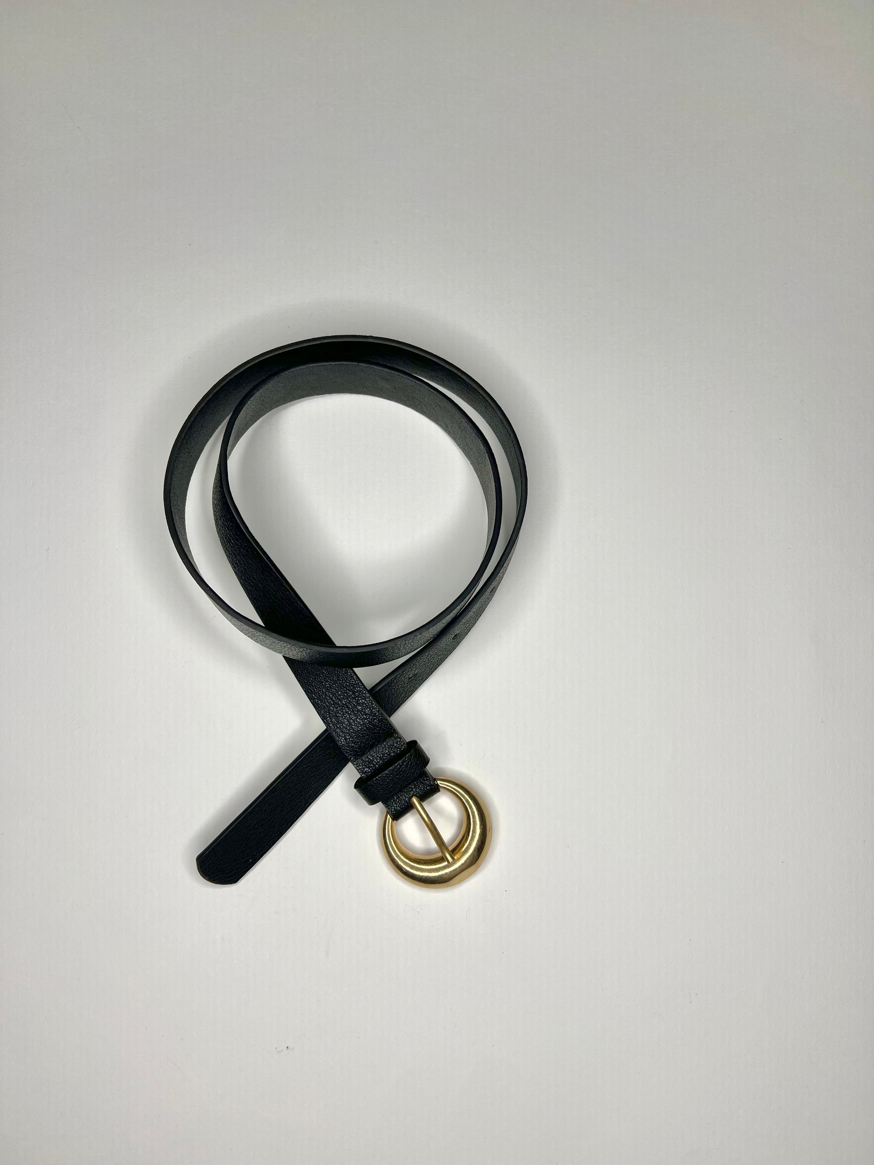 Cinta in ecopelle. Dotata di fibbia tonda in metallo con finitura dorata. Chiusura regolabile.
