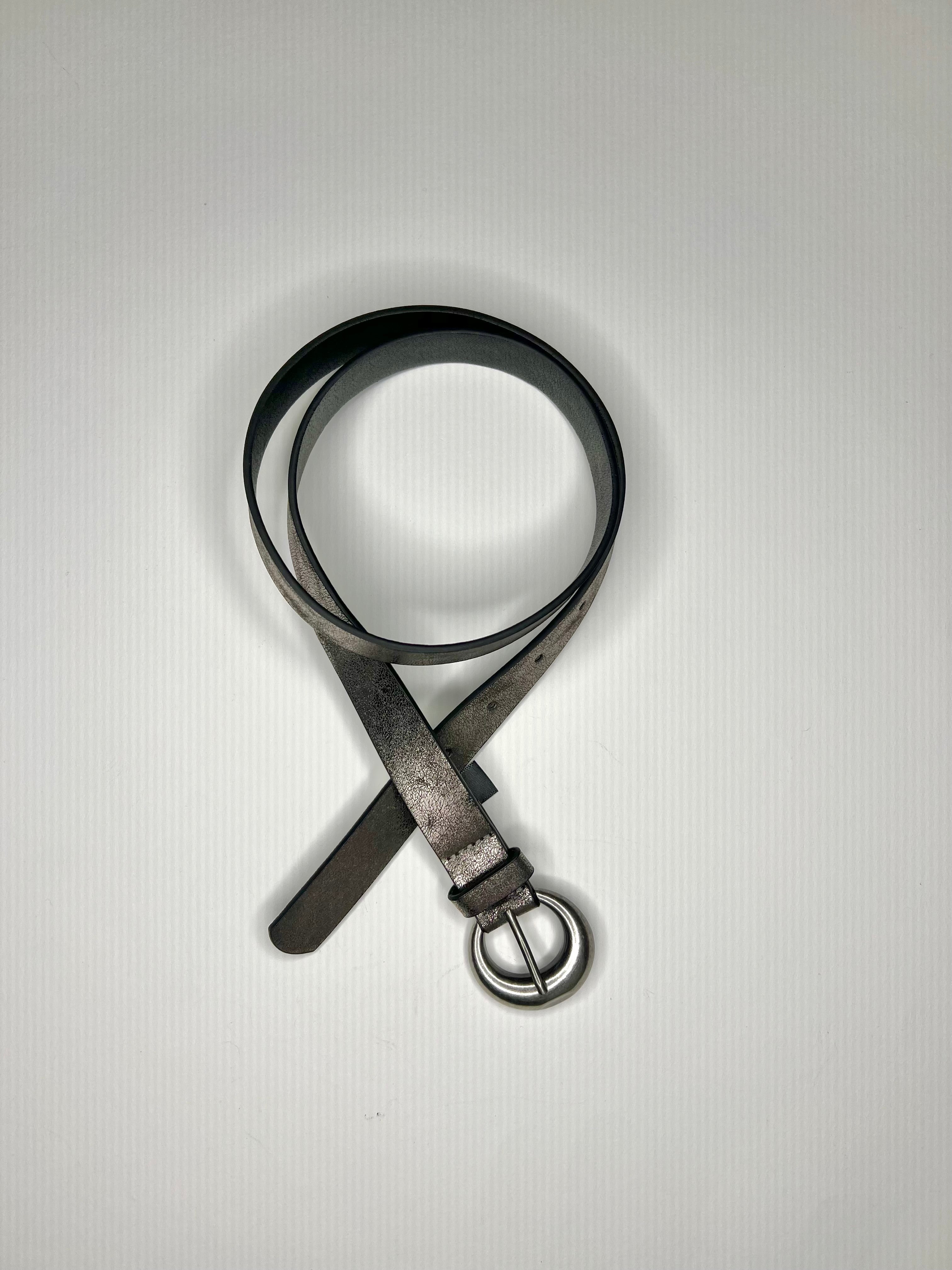 Cinta in ecopelle. Dotata di fibbia tonda in metallo con finitura argentata. Chiusura regolabile.