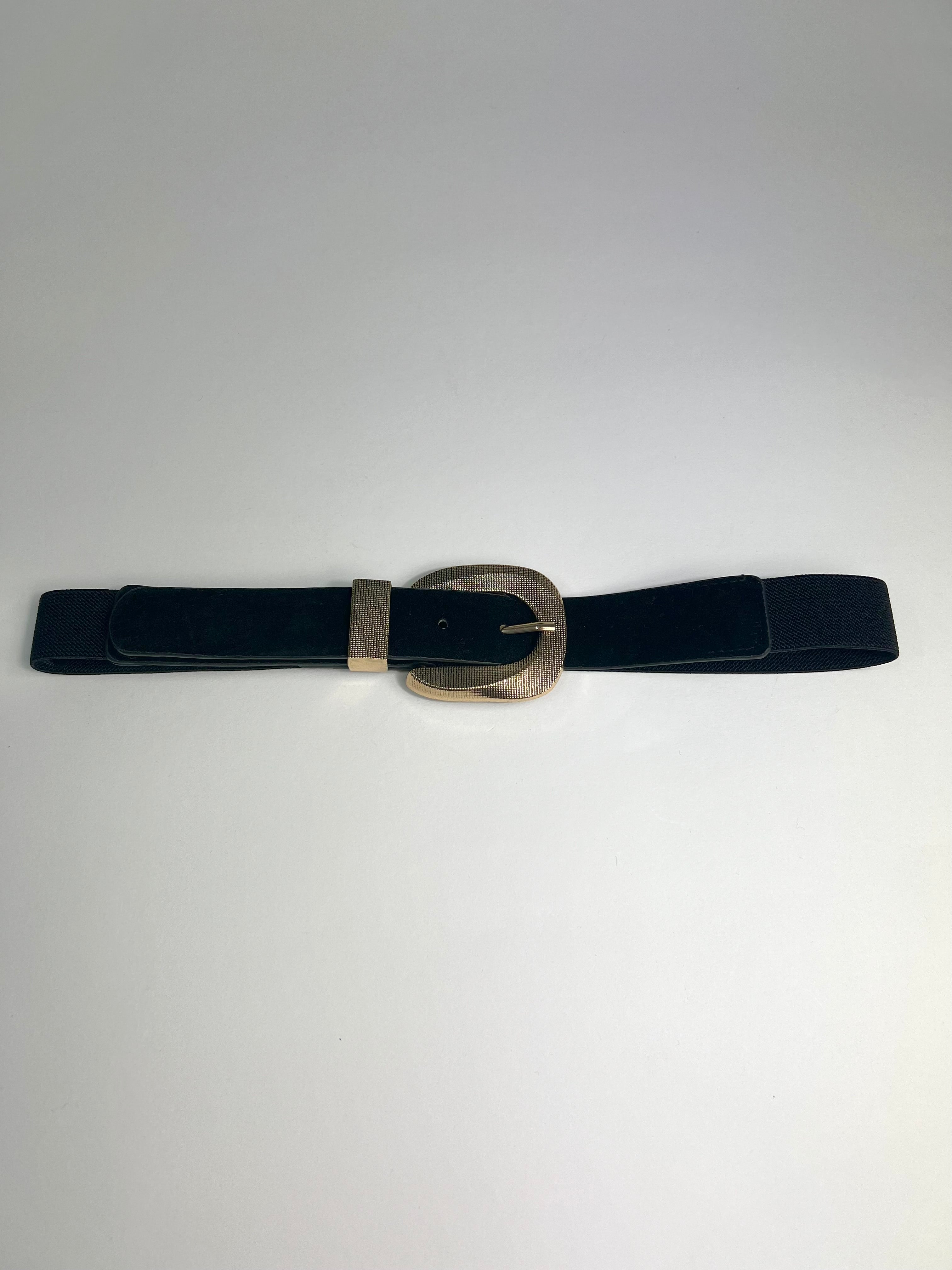 Cinta elasticizzata sul retro e scamosciata sulla parte frontale. Dotata di fibbia in metallo dorata con finitura puntinata. Chiusura regolabile.
