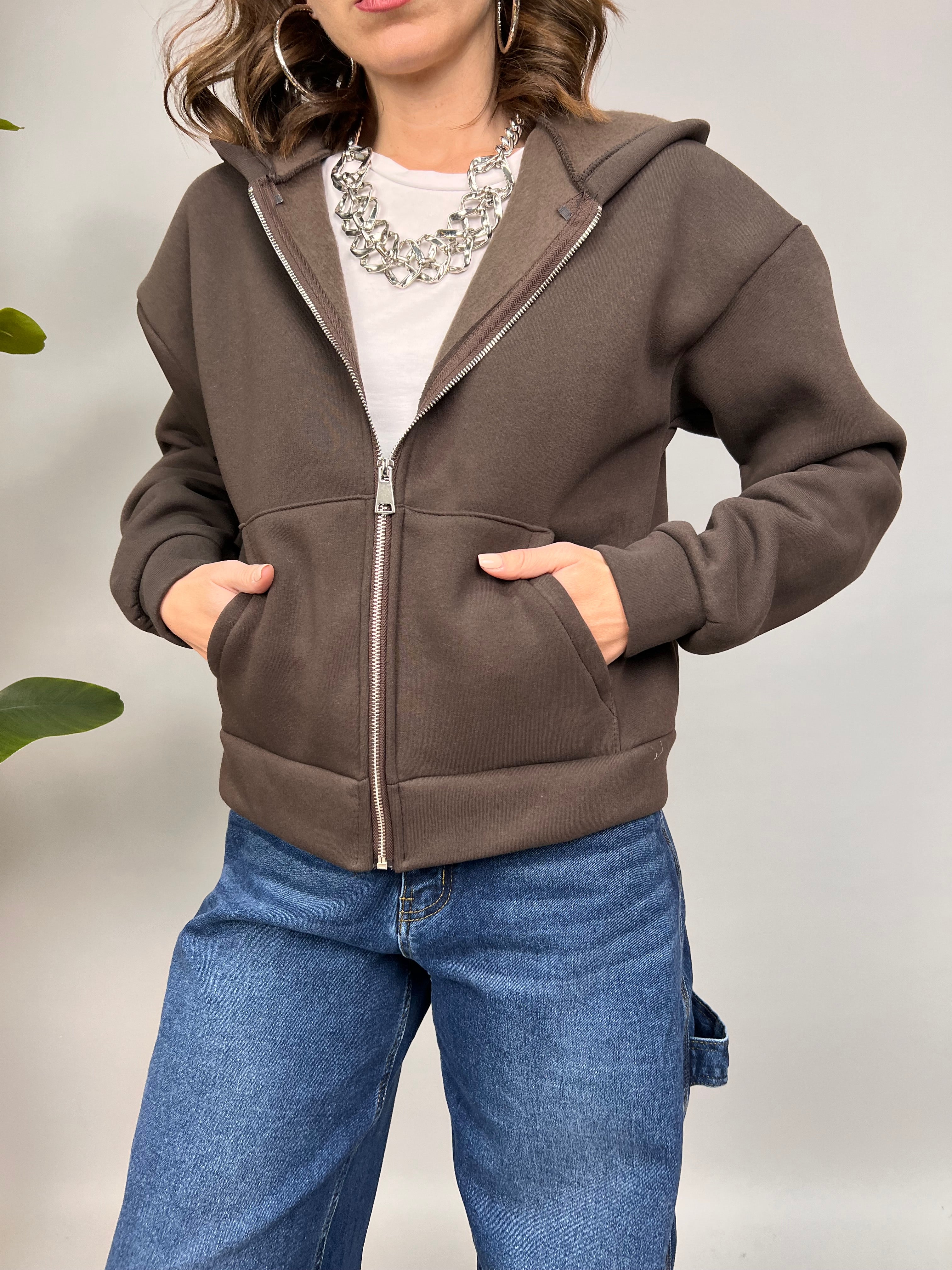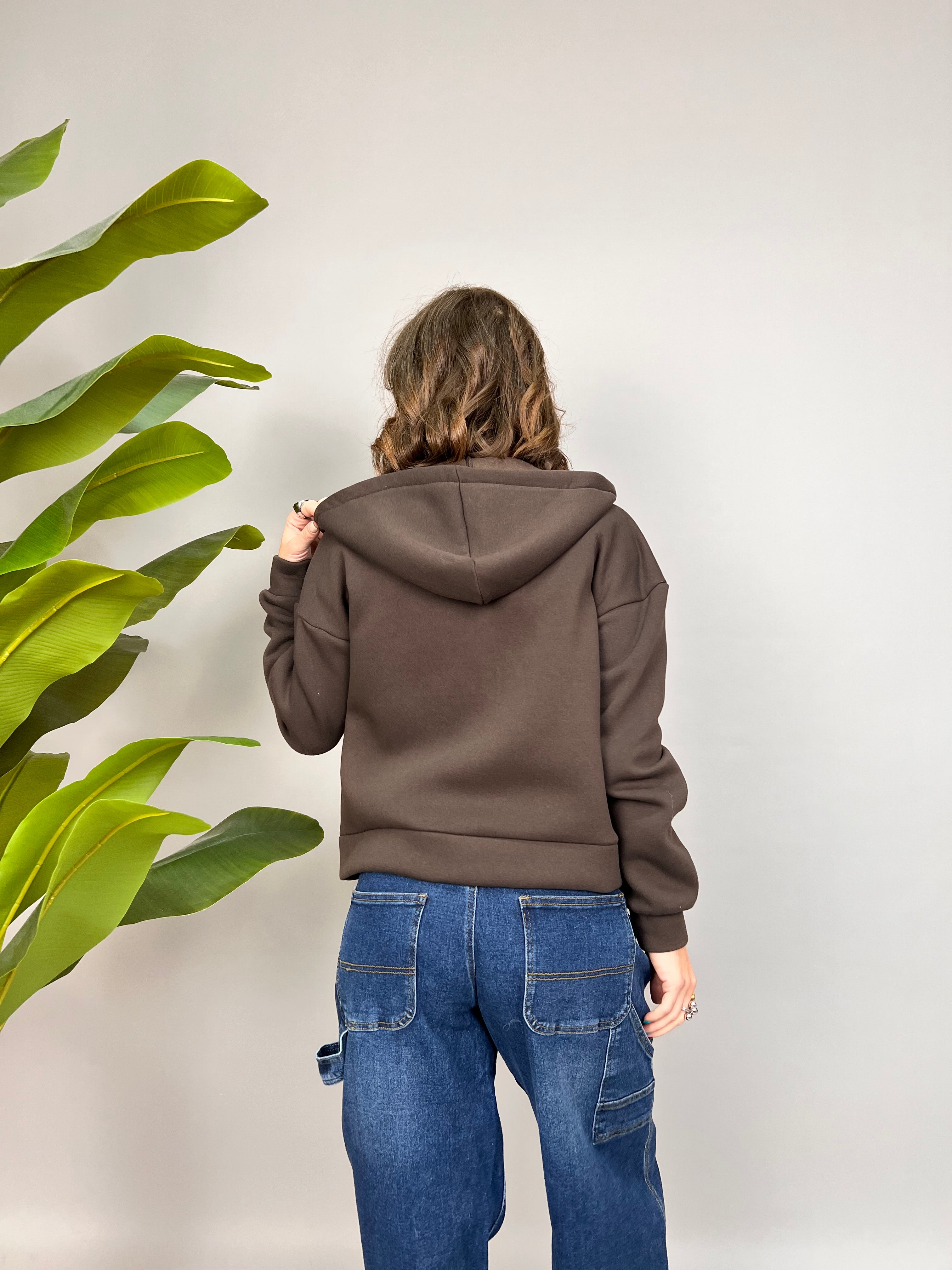 Felpa comoda con chiusura a zip e cappuccio, internamente è felpata.