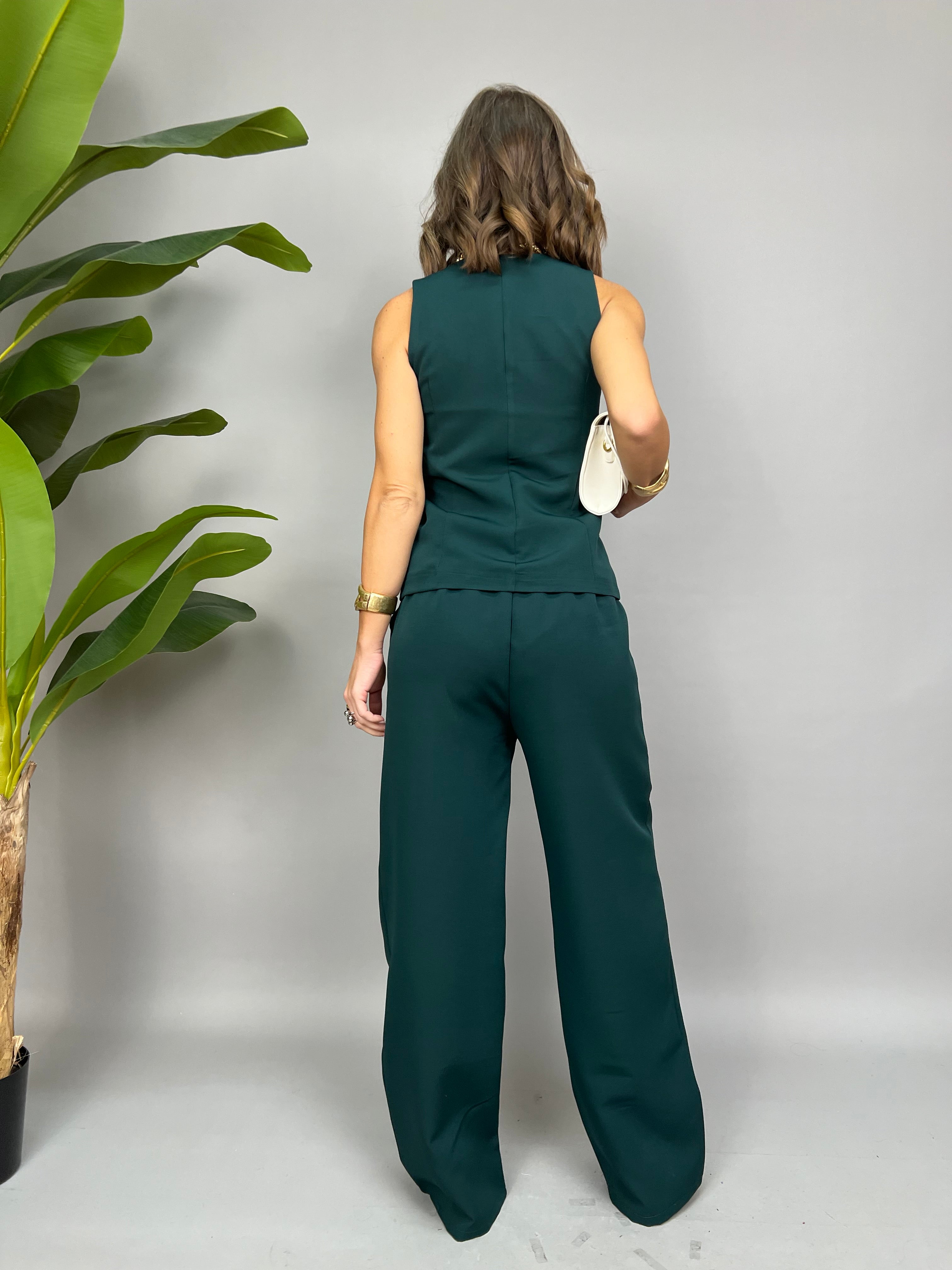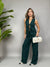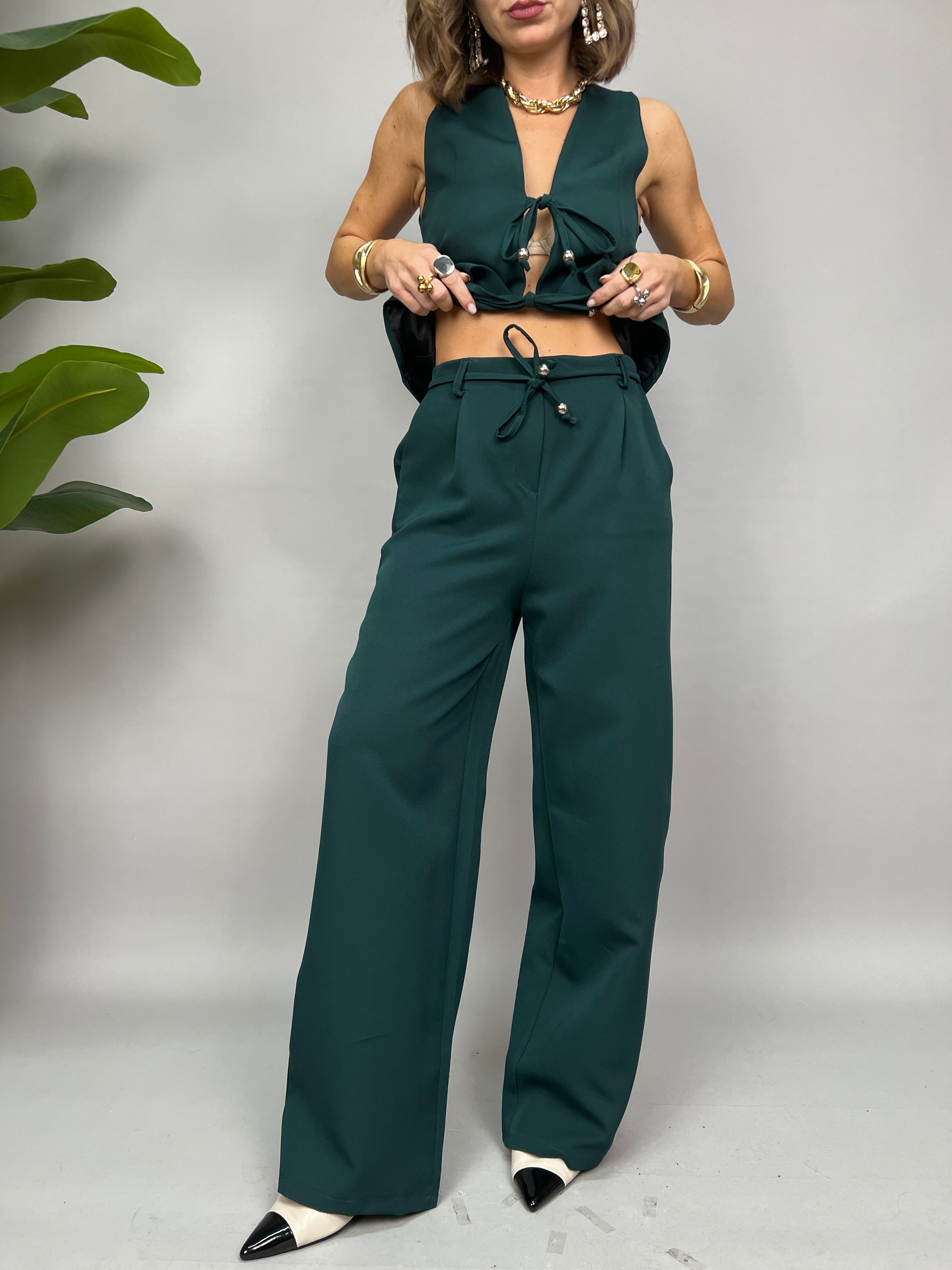 Set coordinato composto da gilet foderato con chiusura a fiocchi e pantalone wide leg con elastico dietro la vita.