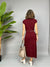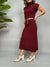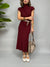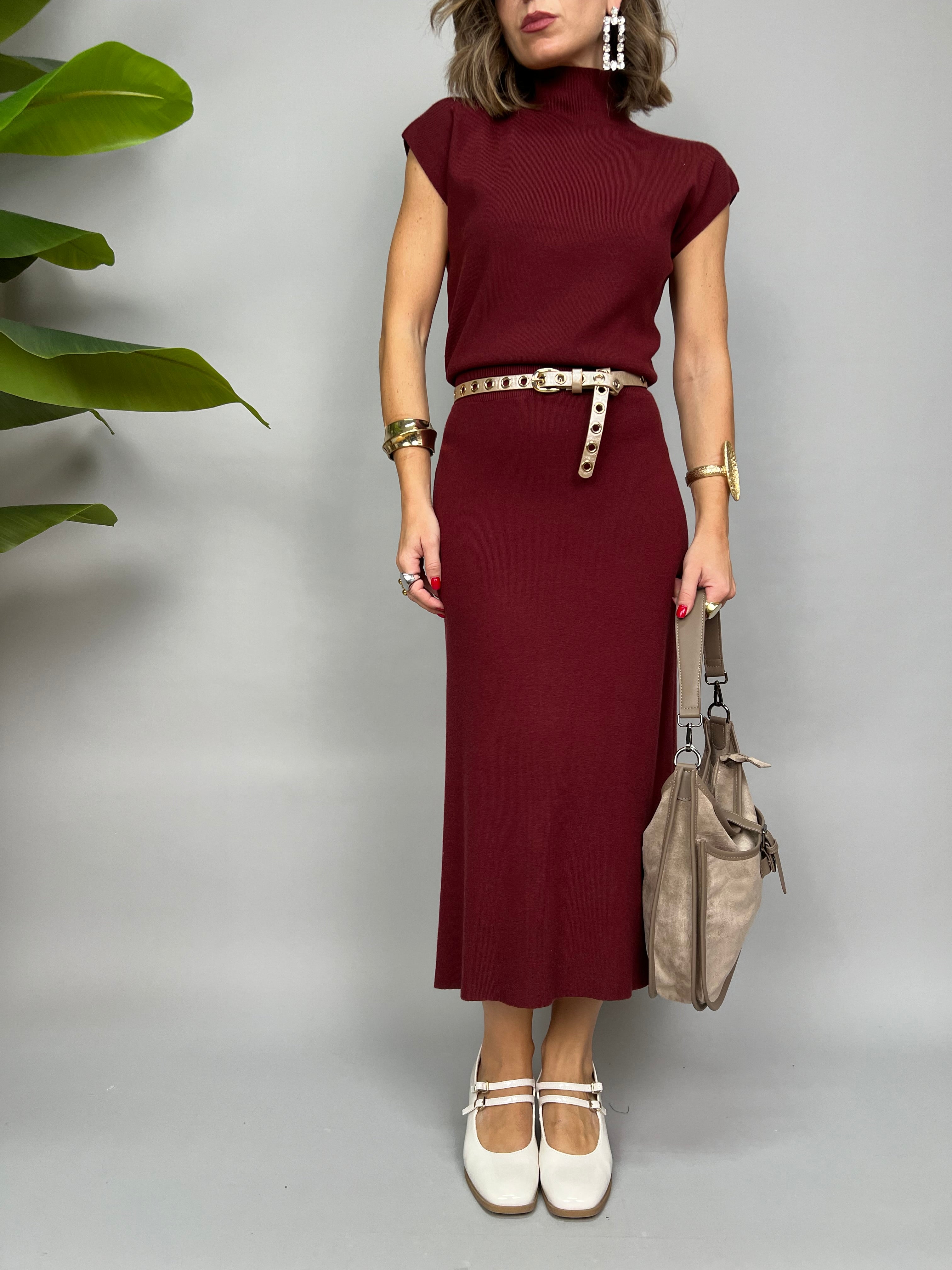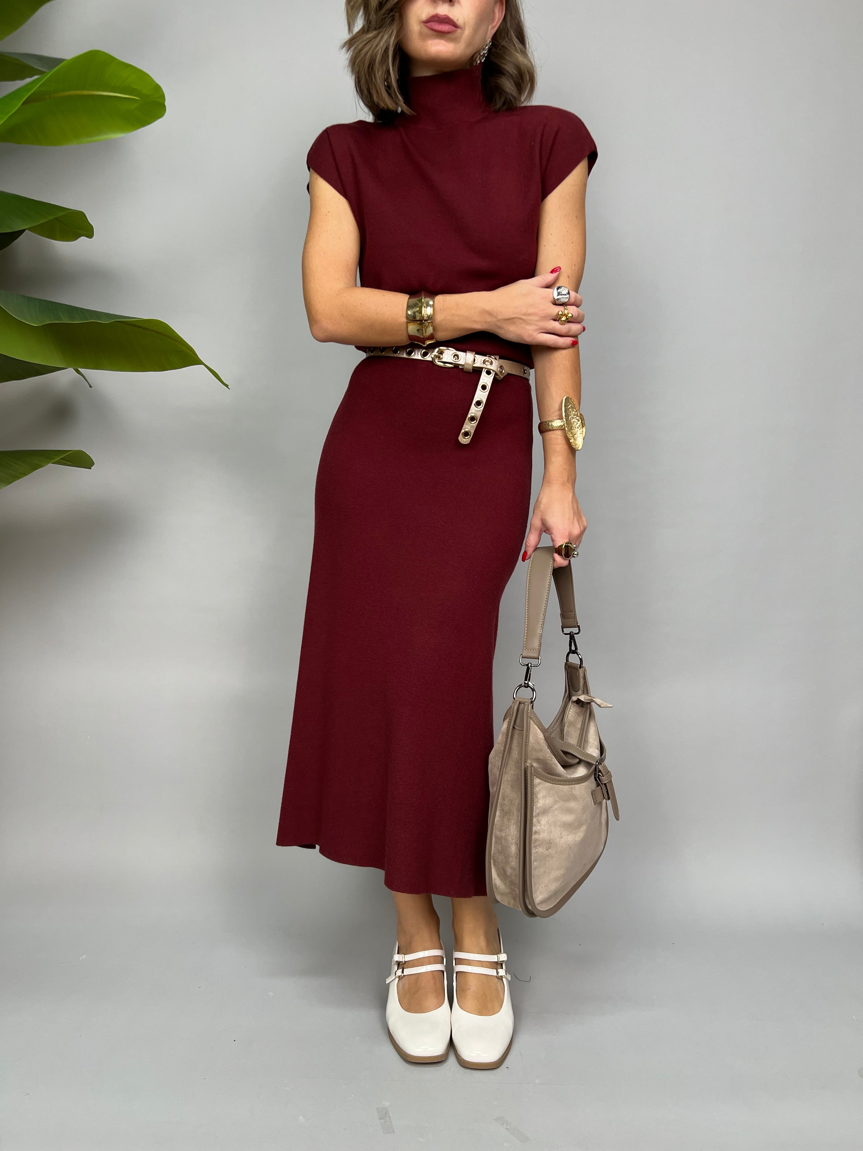 Set coordinato composto da maglia con maniche a cuffia e collo medio alto. La gonna è un modello svasato con elastico in vita.