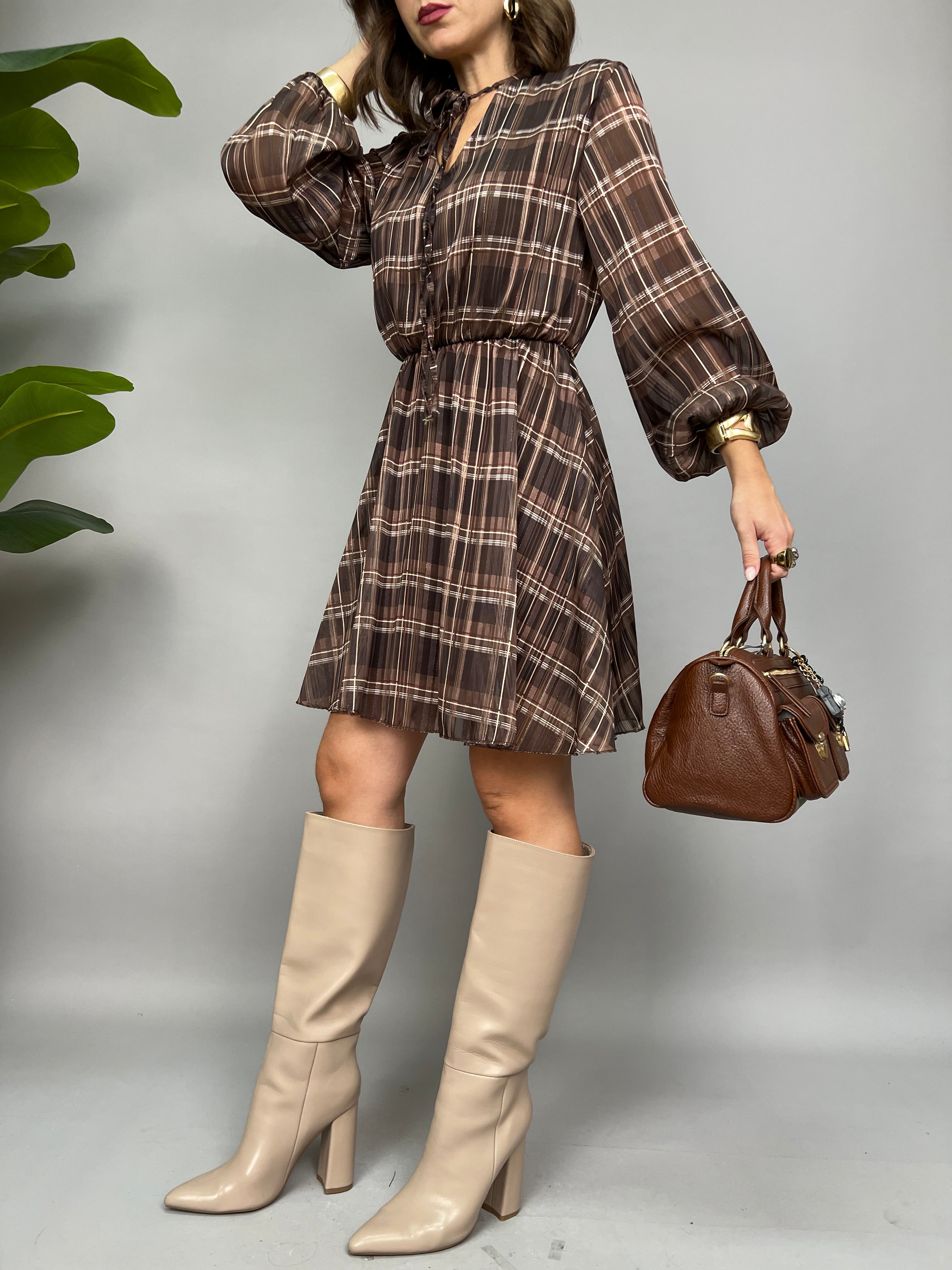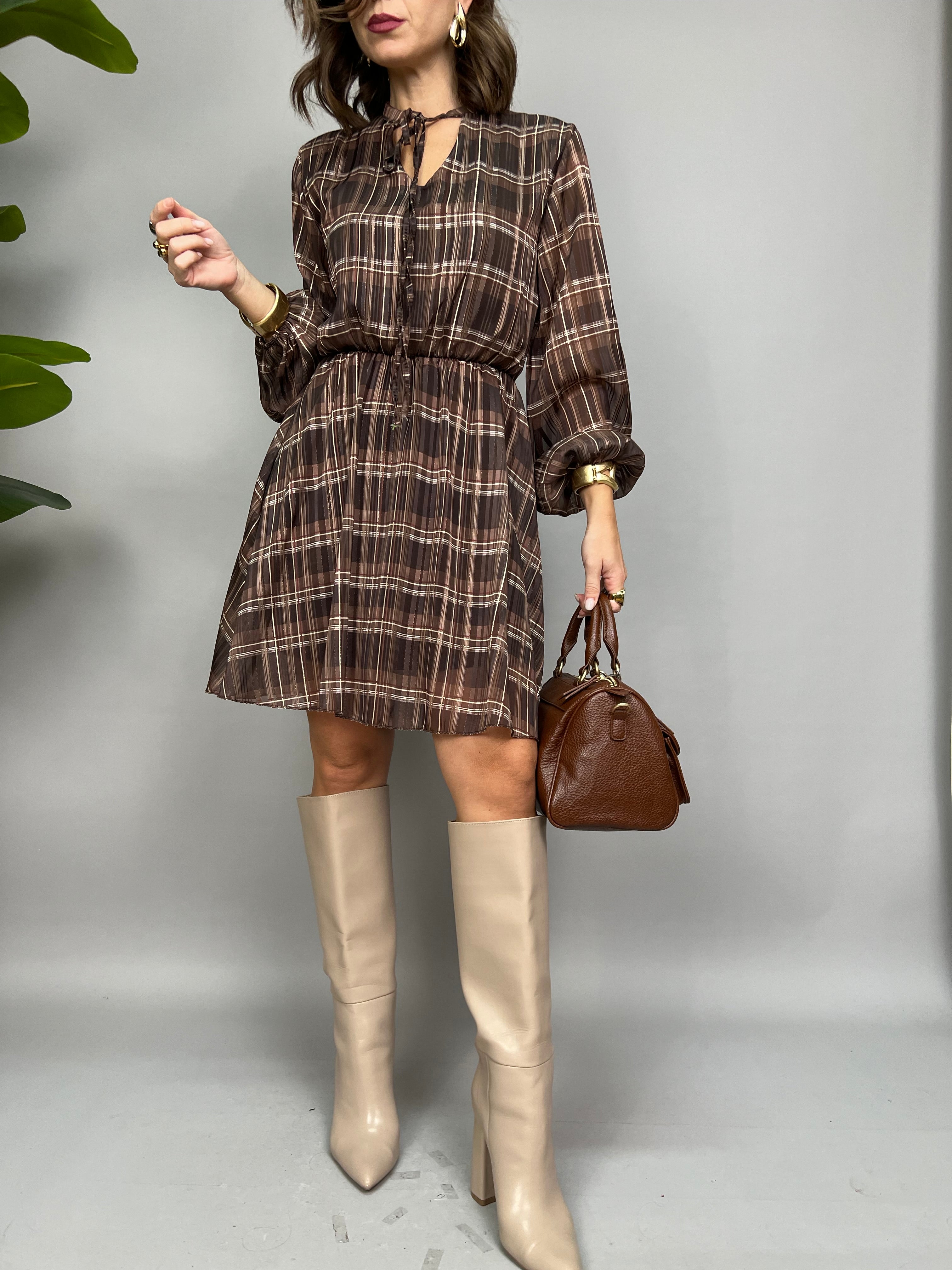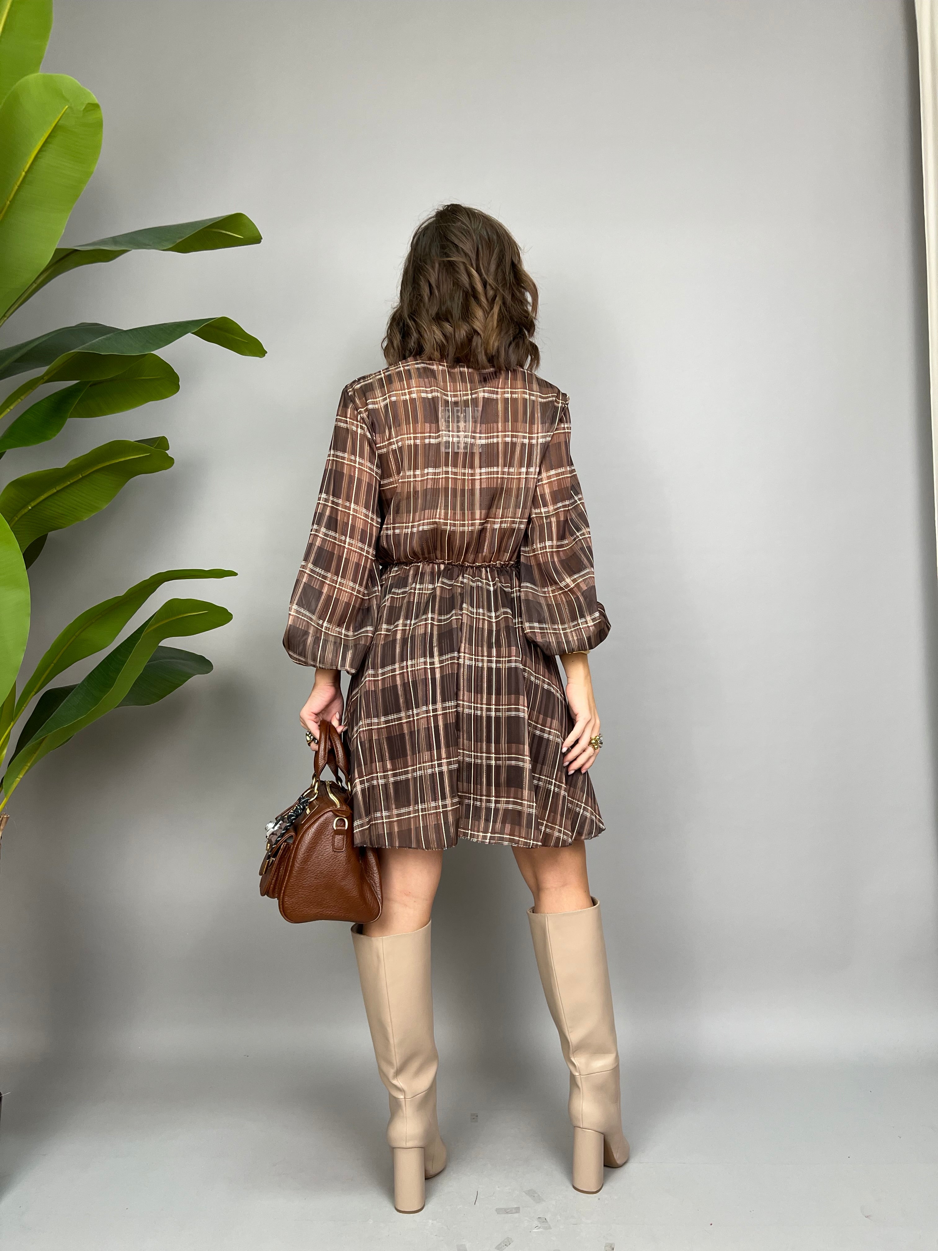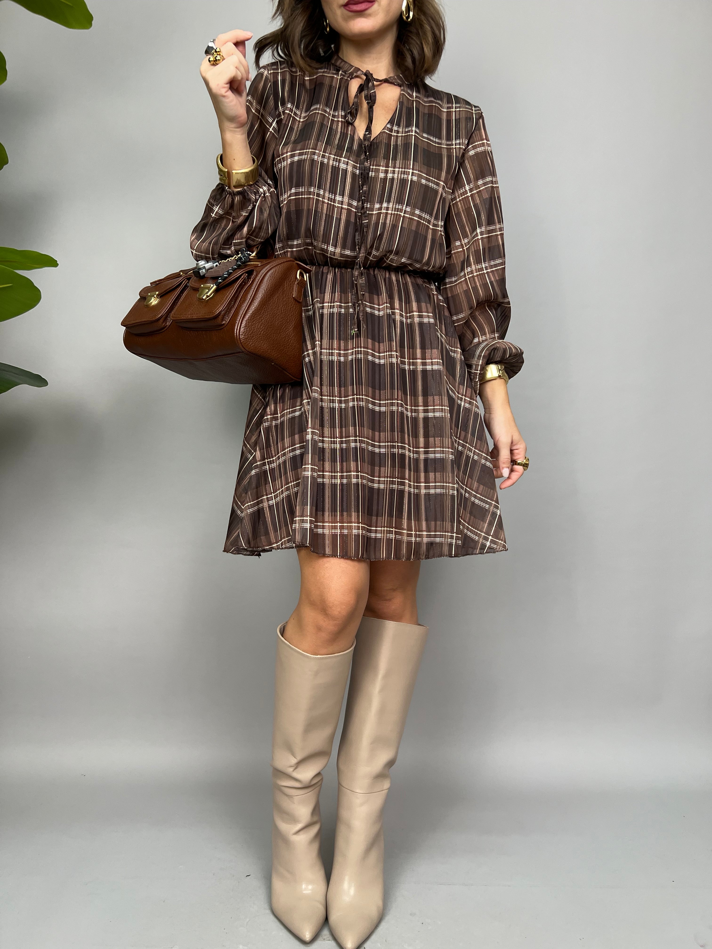 Vestito in chiffon con dettaglio in lurex. Presente un'elastico in vita e le maniche sono a palloncino.