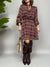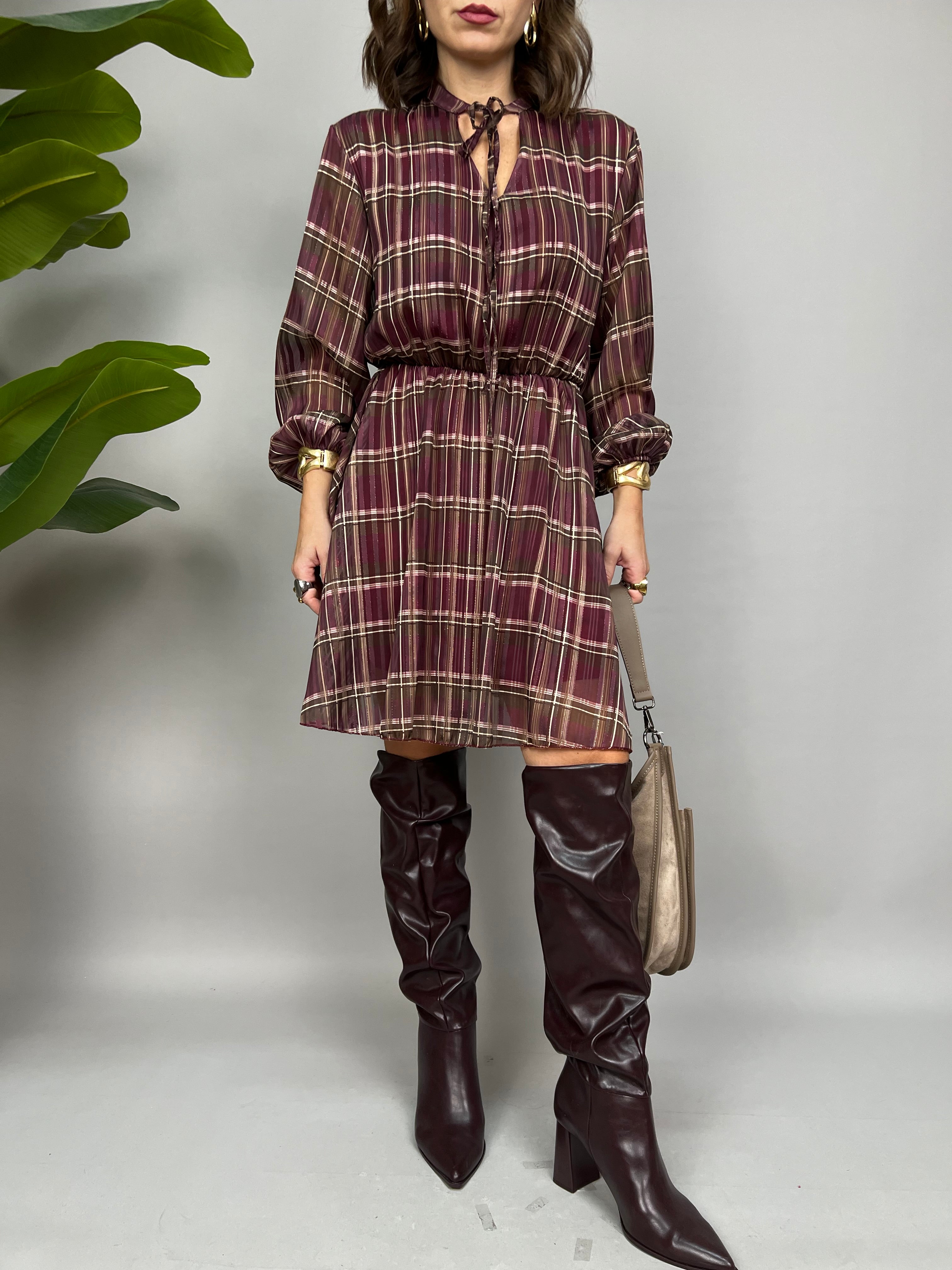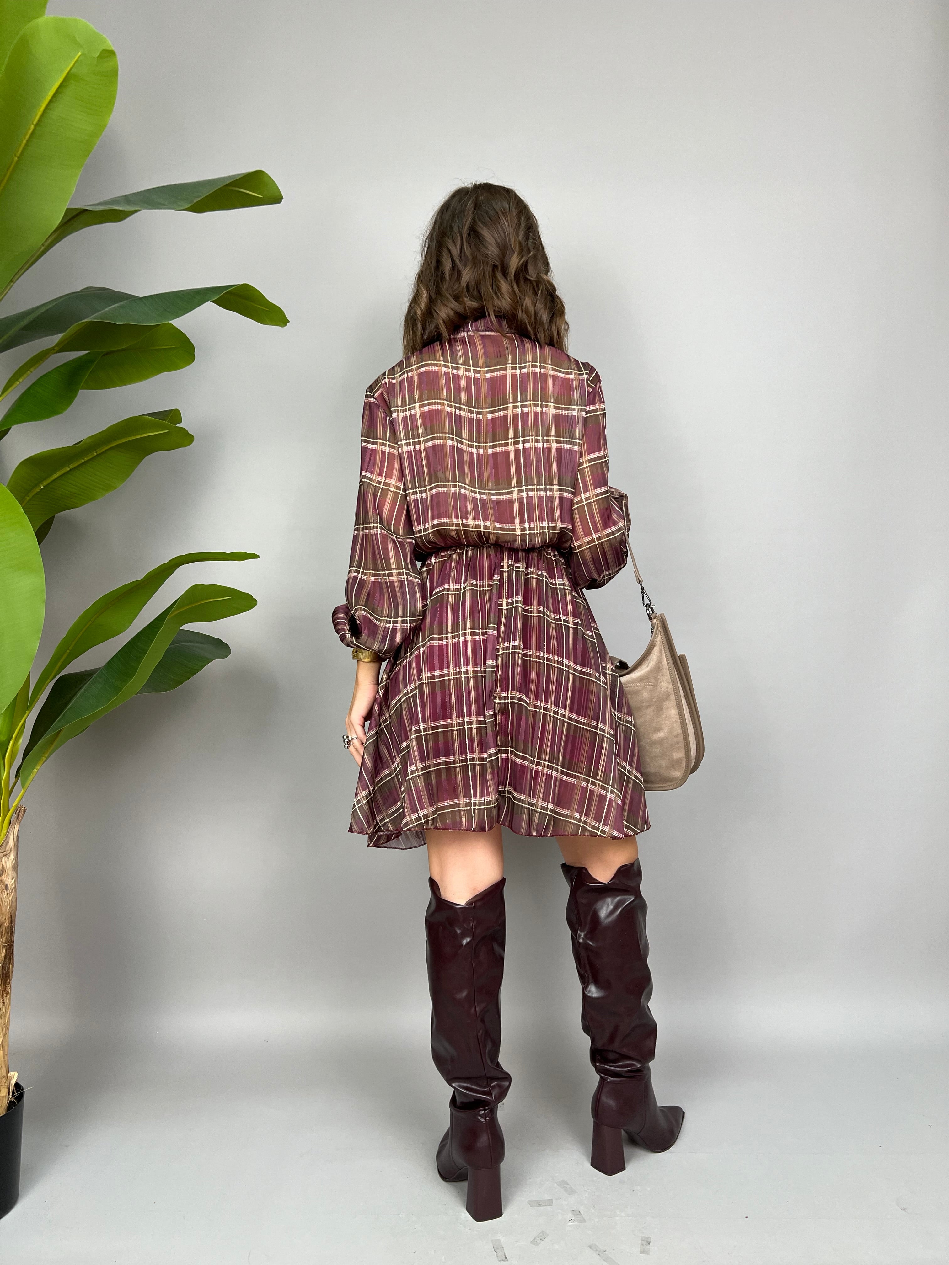 Vestito in chiffon con dettaglio in lurex. Presente un'elastico in vita e le maniche sono a palloncino.
