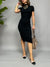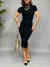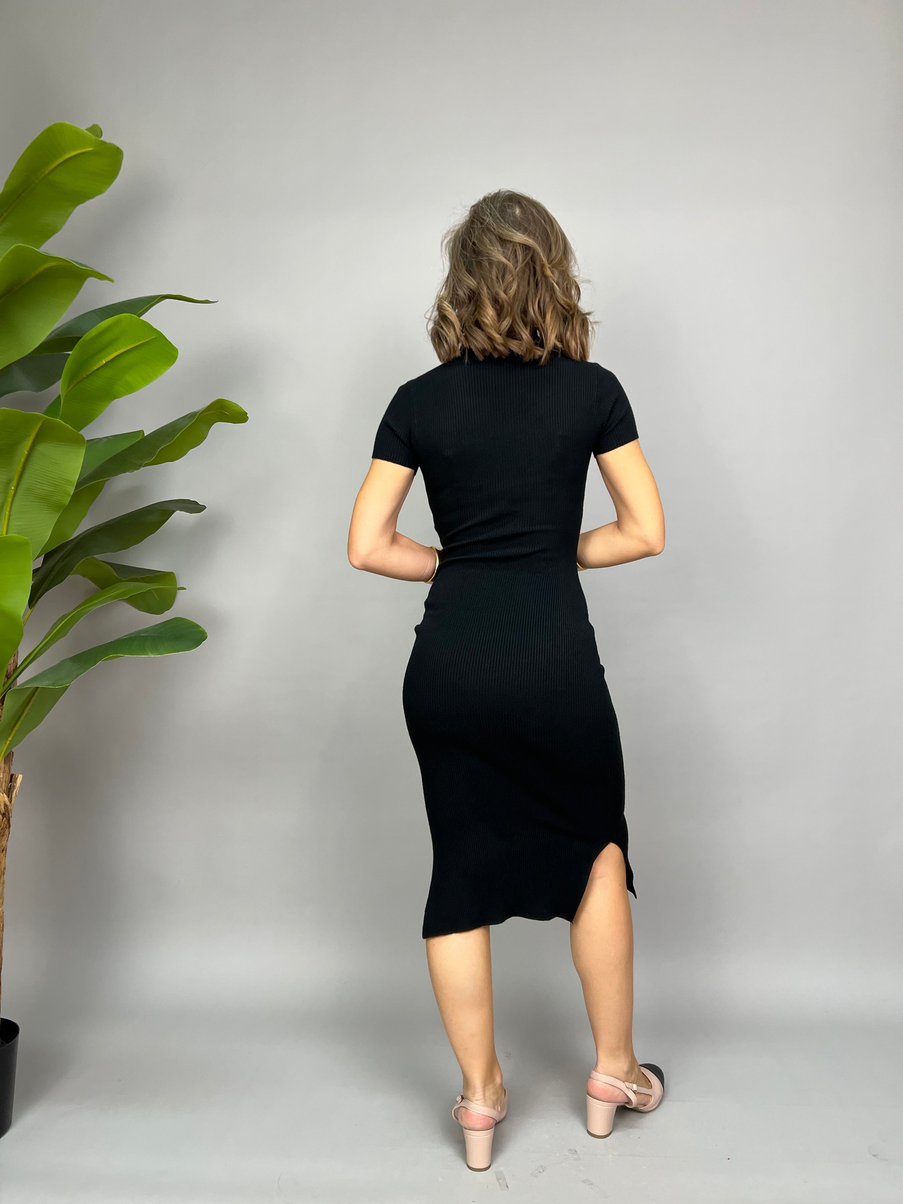 Vestito in maglia a costine. Il modello ha le maniche corte, collo medio e due spacchi laterali.