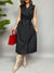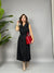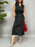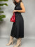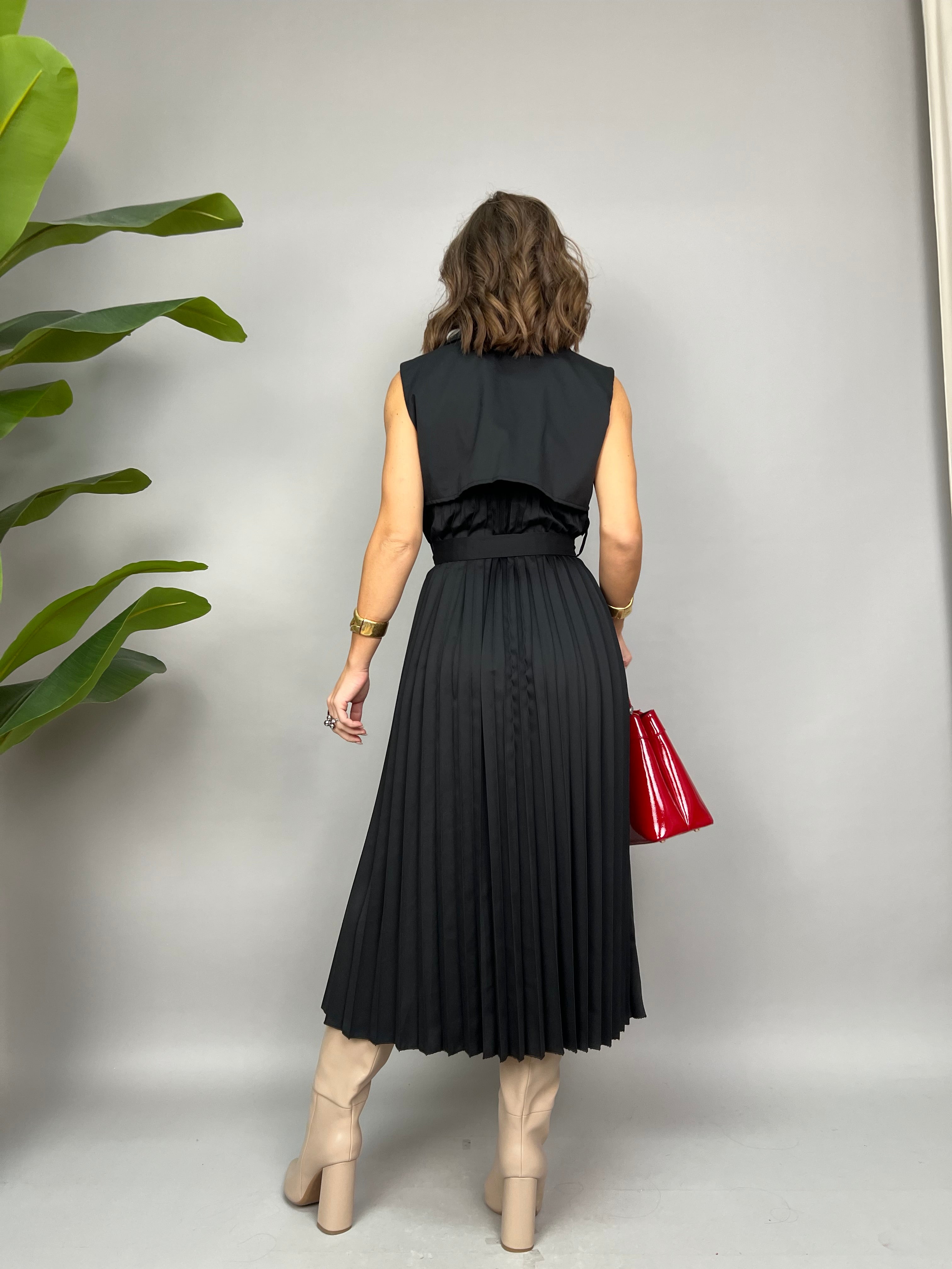 Vestito smanicato lungo con chiusura doppio petto frontale. Sul retro ha un effetto plissè ed una fusciacca in vita per avvitare il modello.