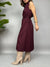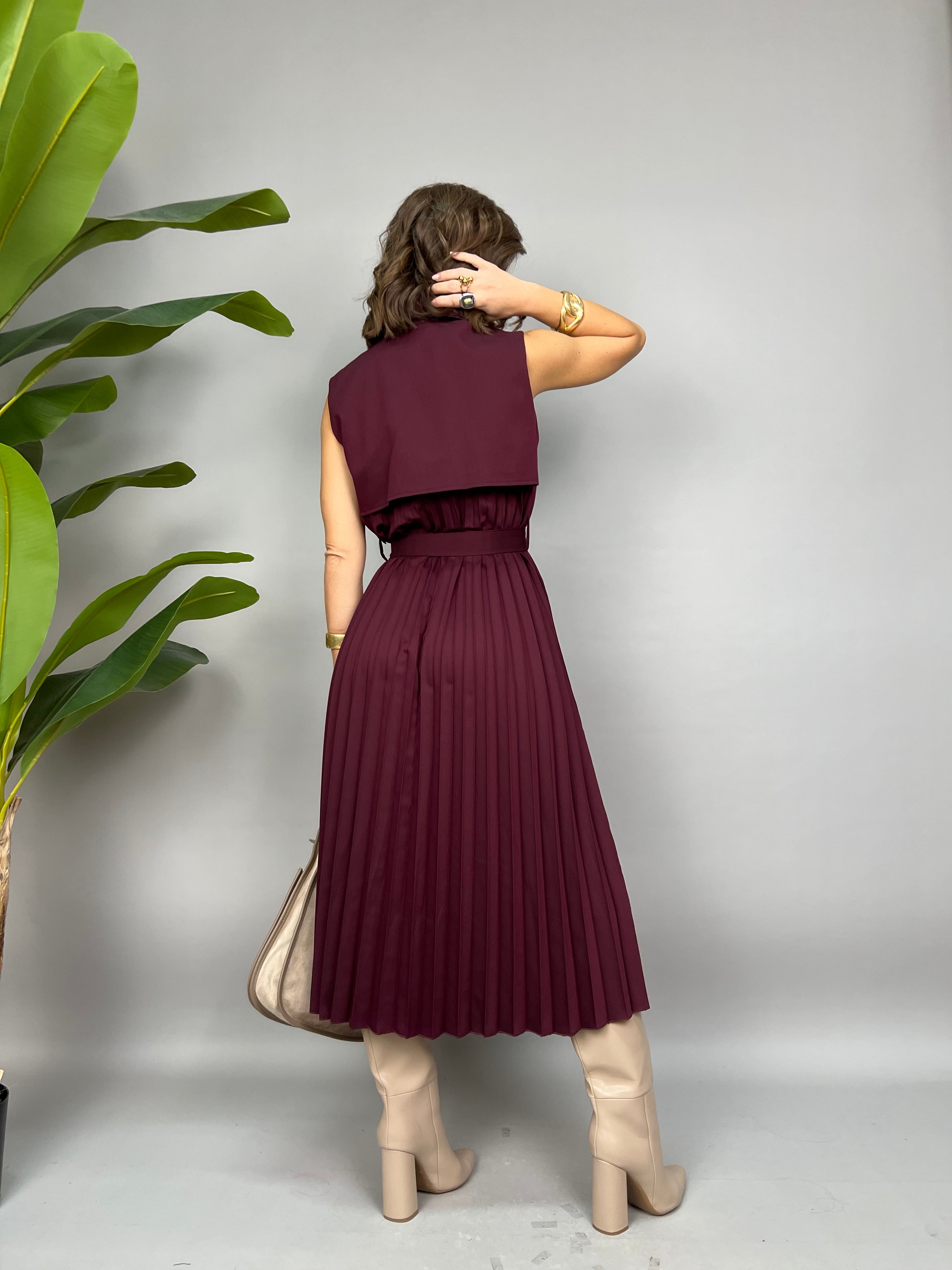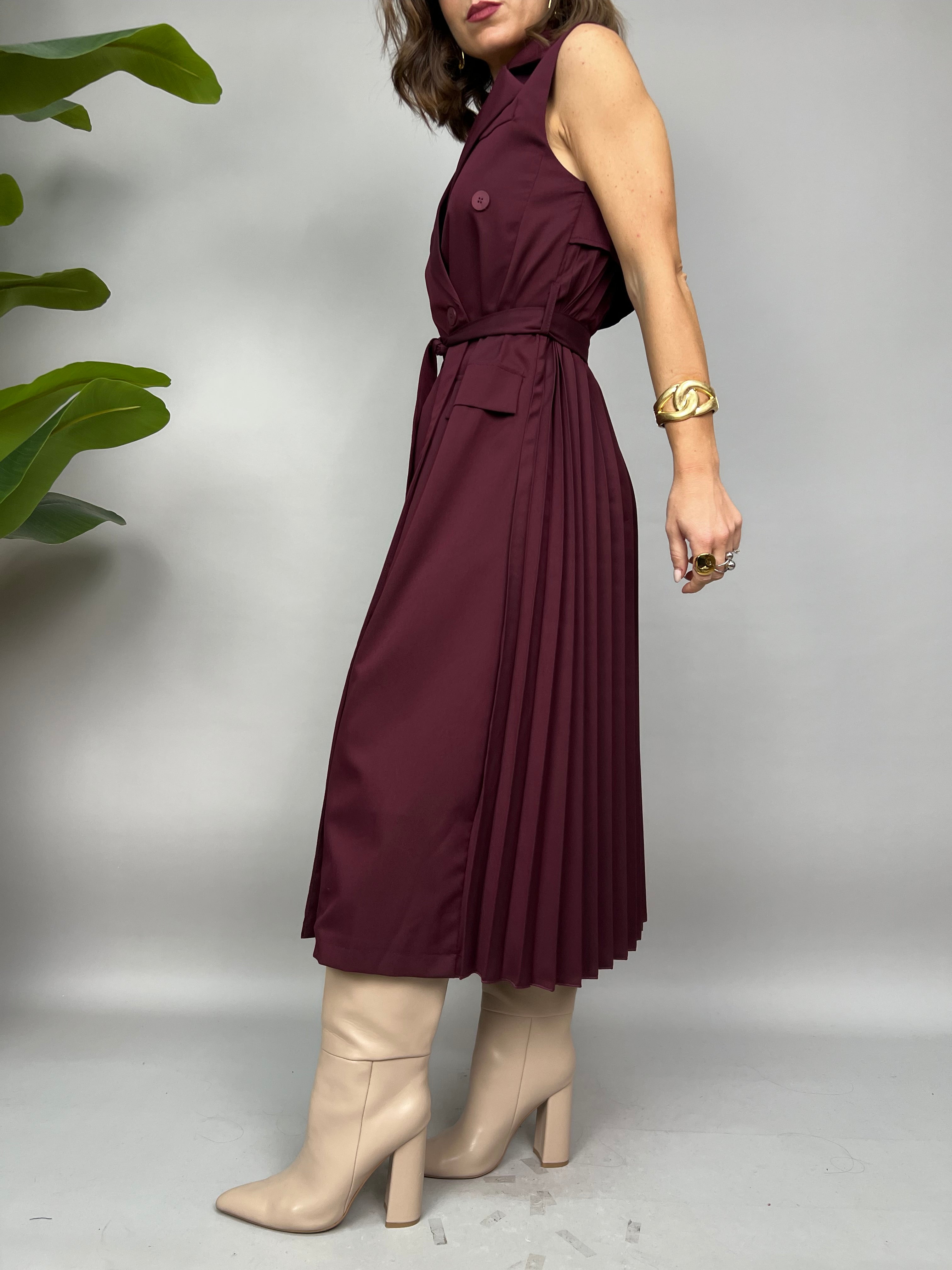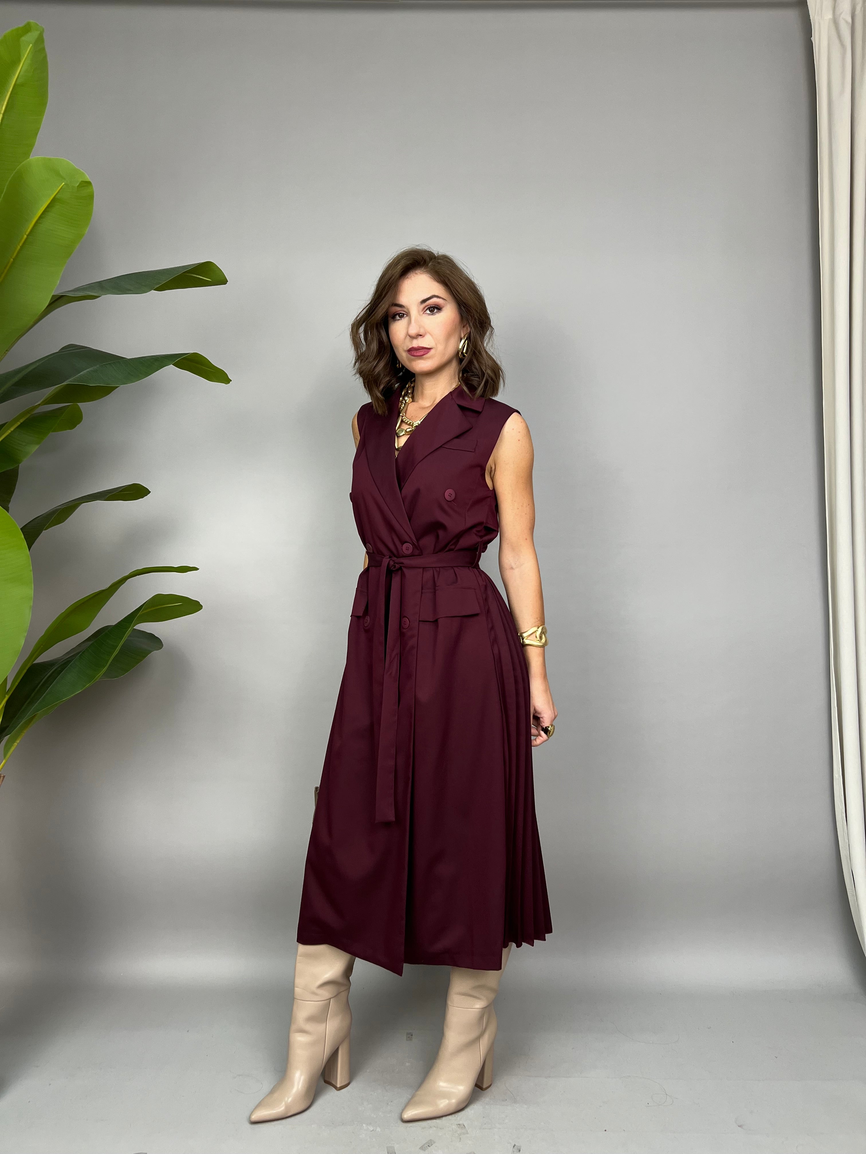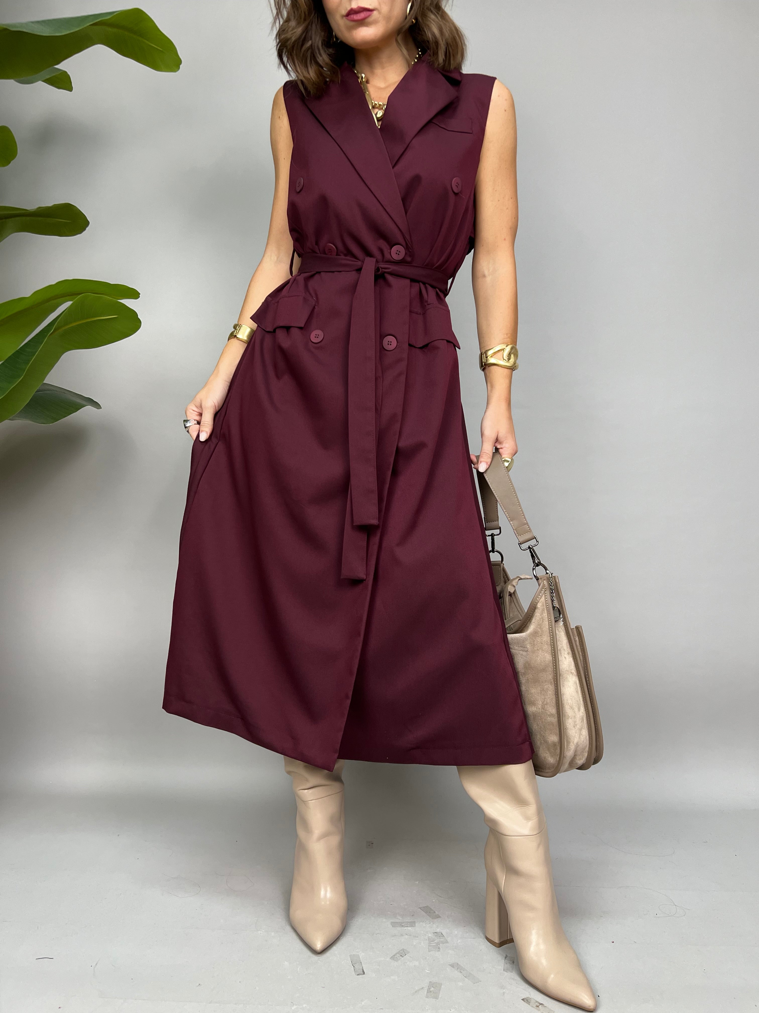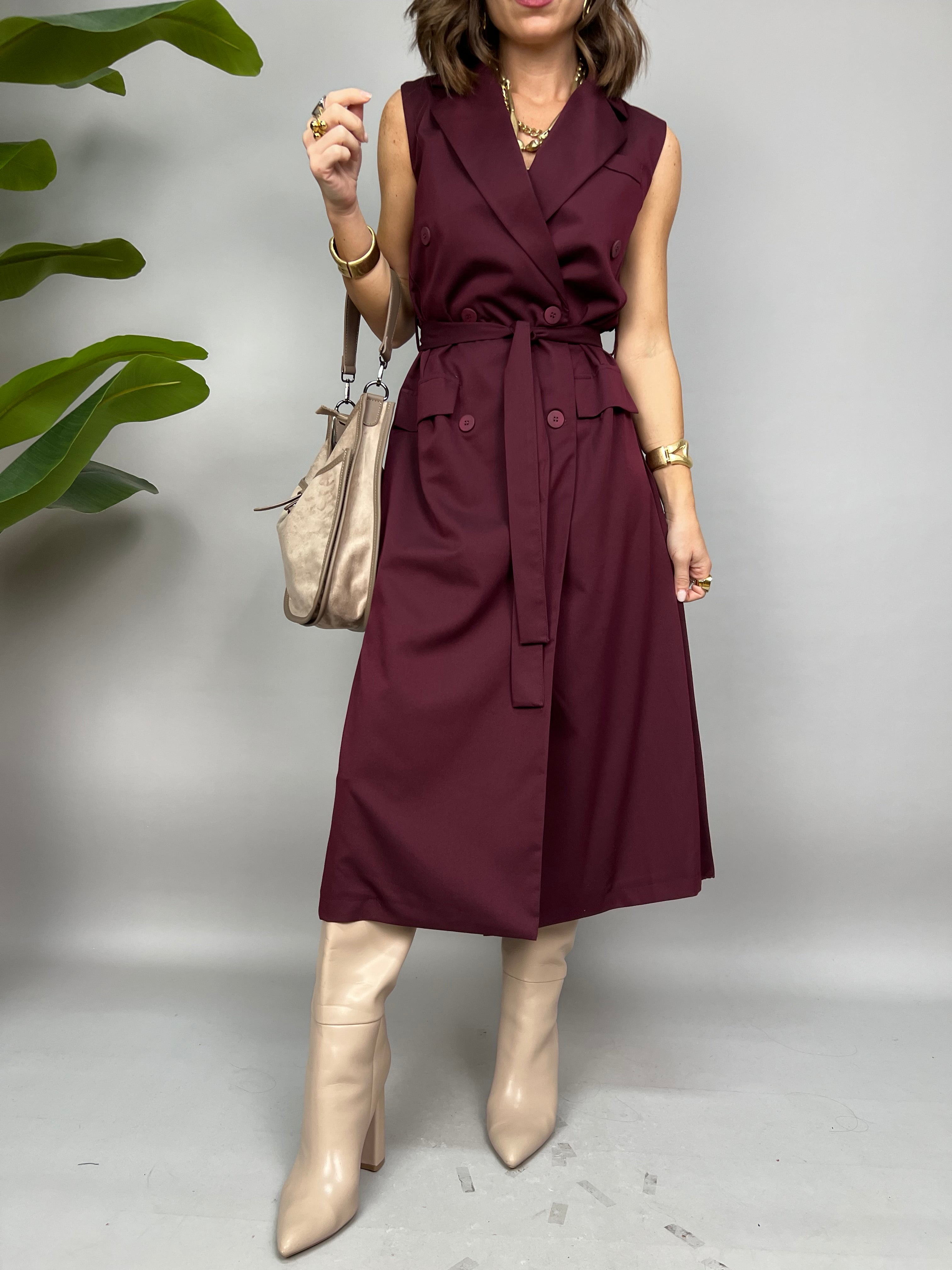 Vestito smanicato lungo con chiusura doppio petto frontale. Sul retro ha un effetto plissè ed una fusciacca in vita per avvitare il modello.