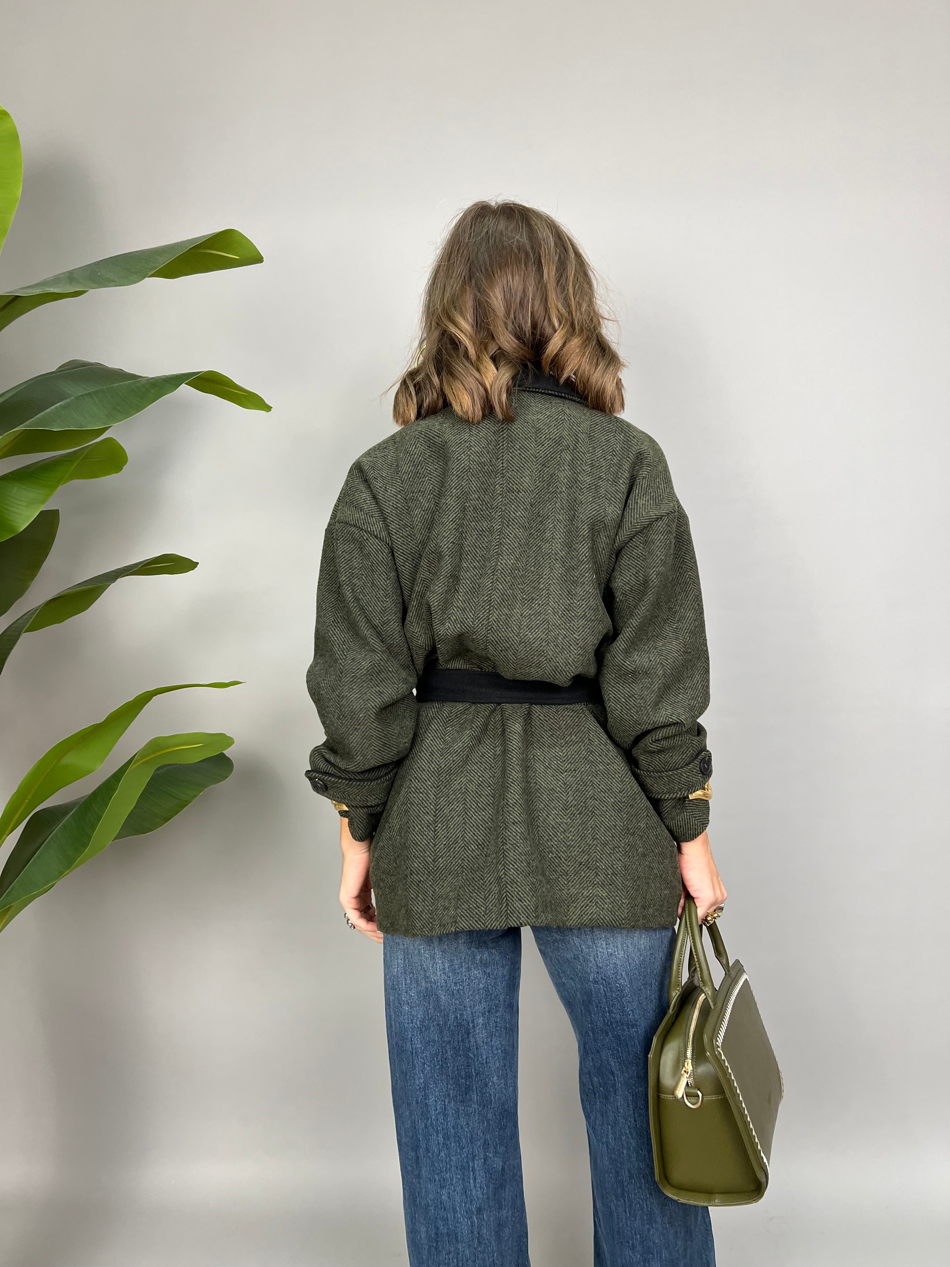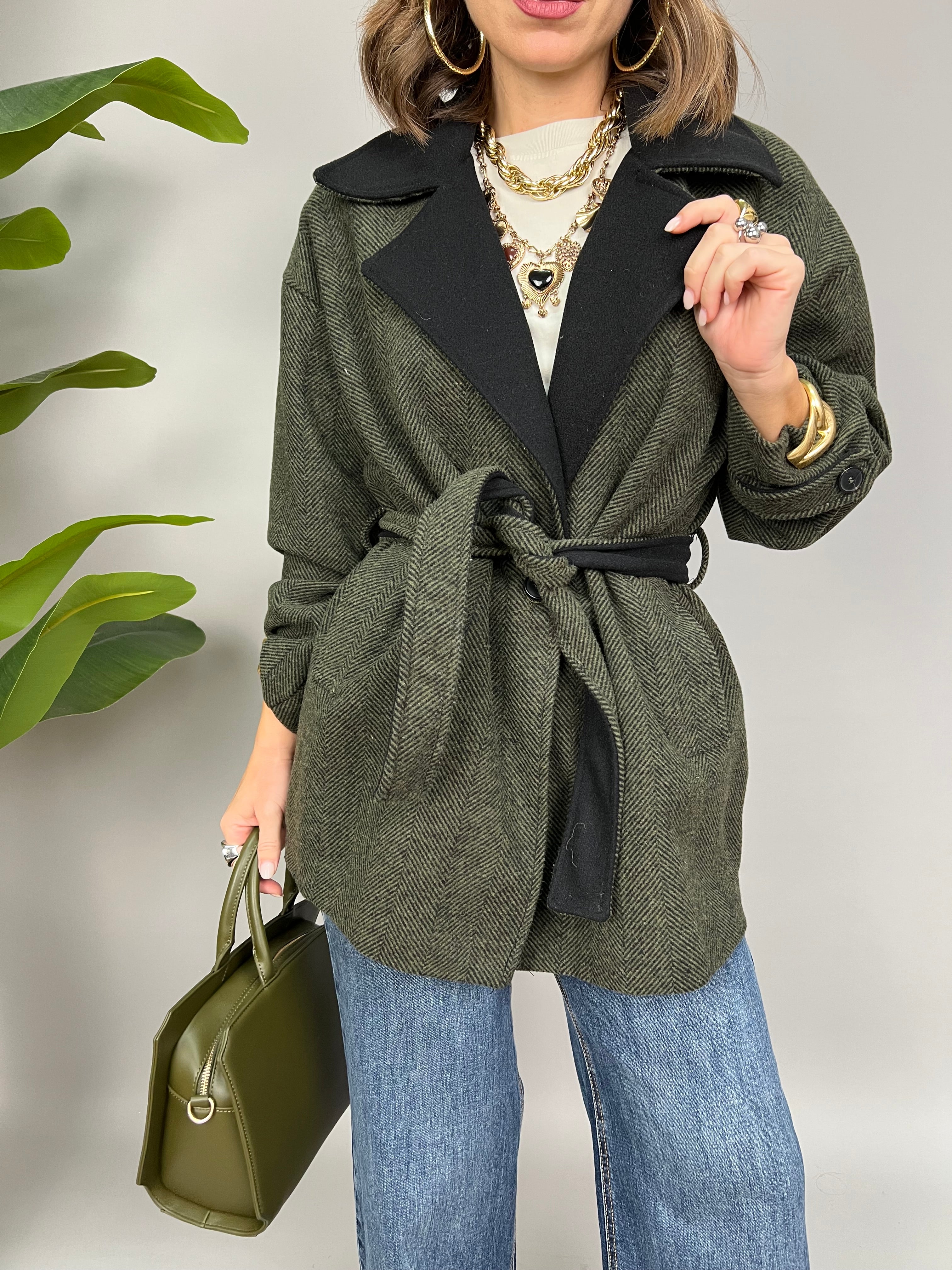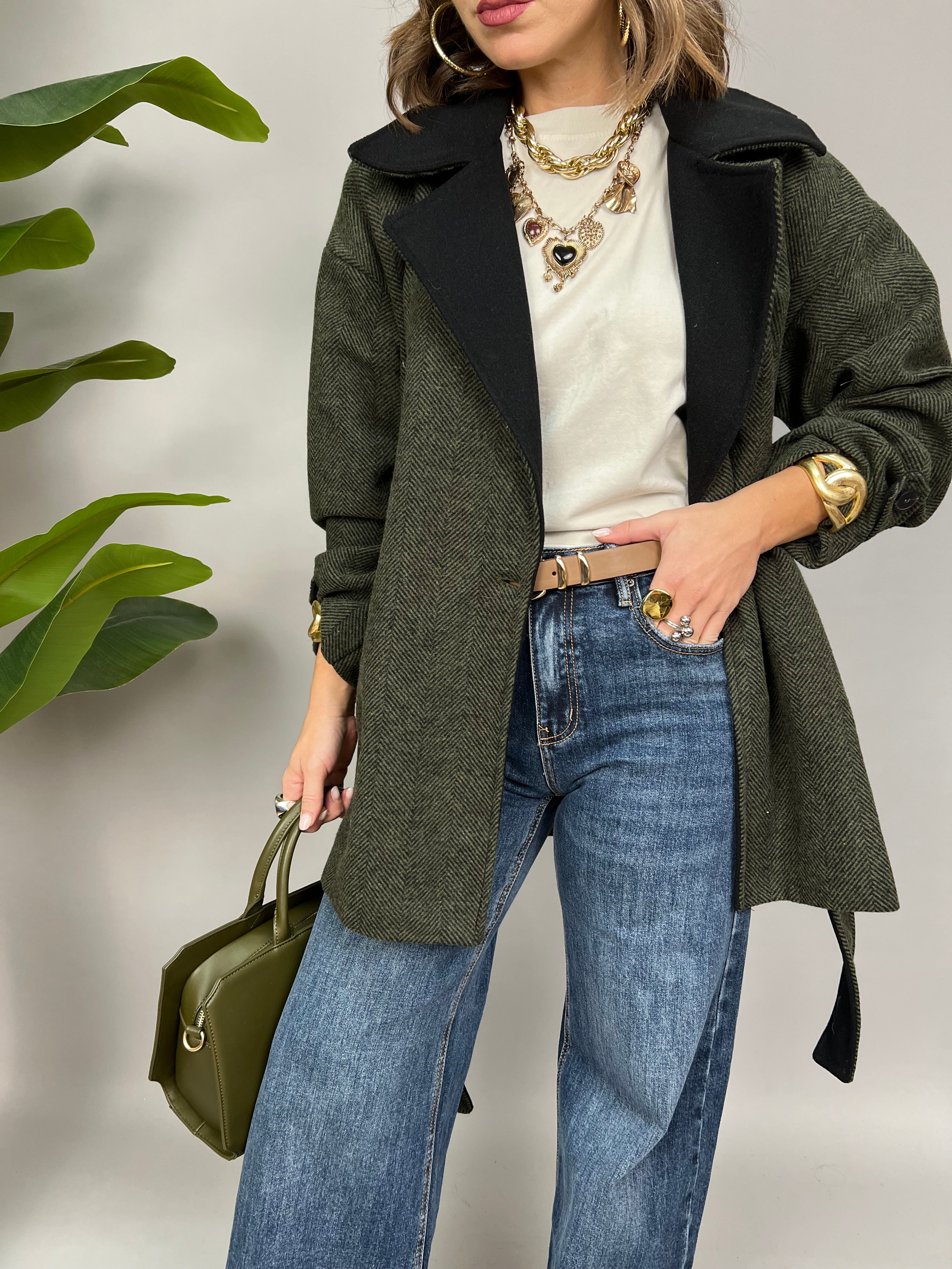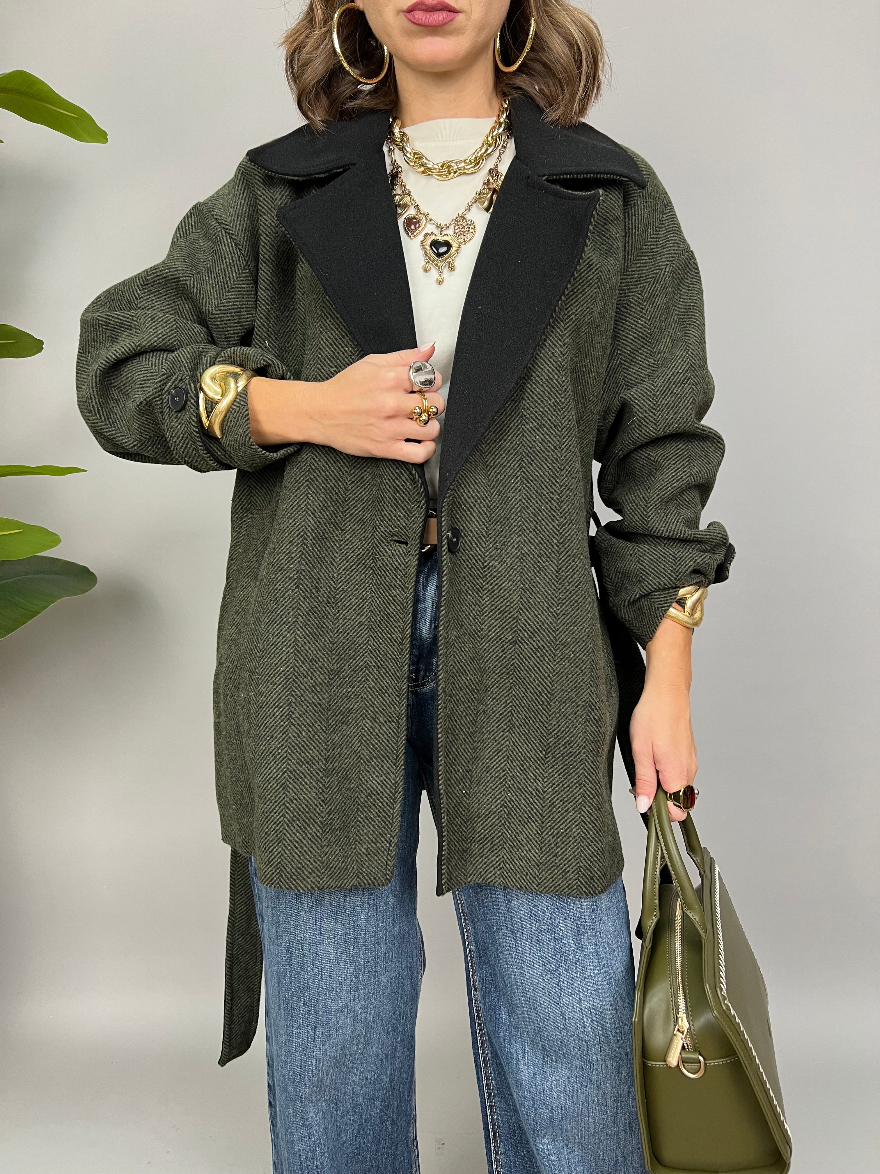 Cappotto in panno con rever in contrasto e chiusura monopetto. Internamente è foderato e presenta una fusciacca per avvitare il modello.