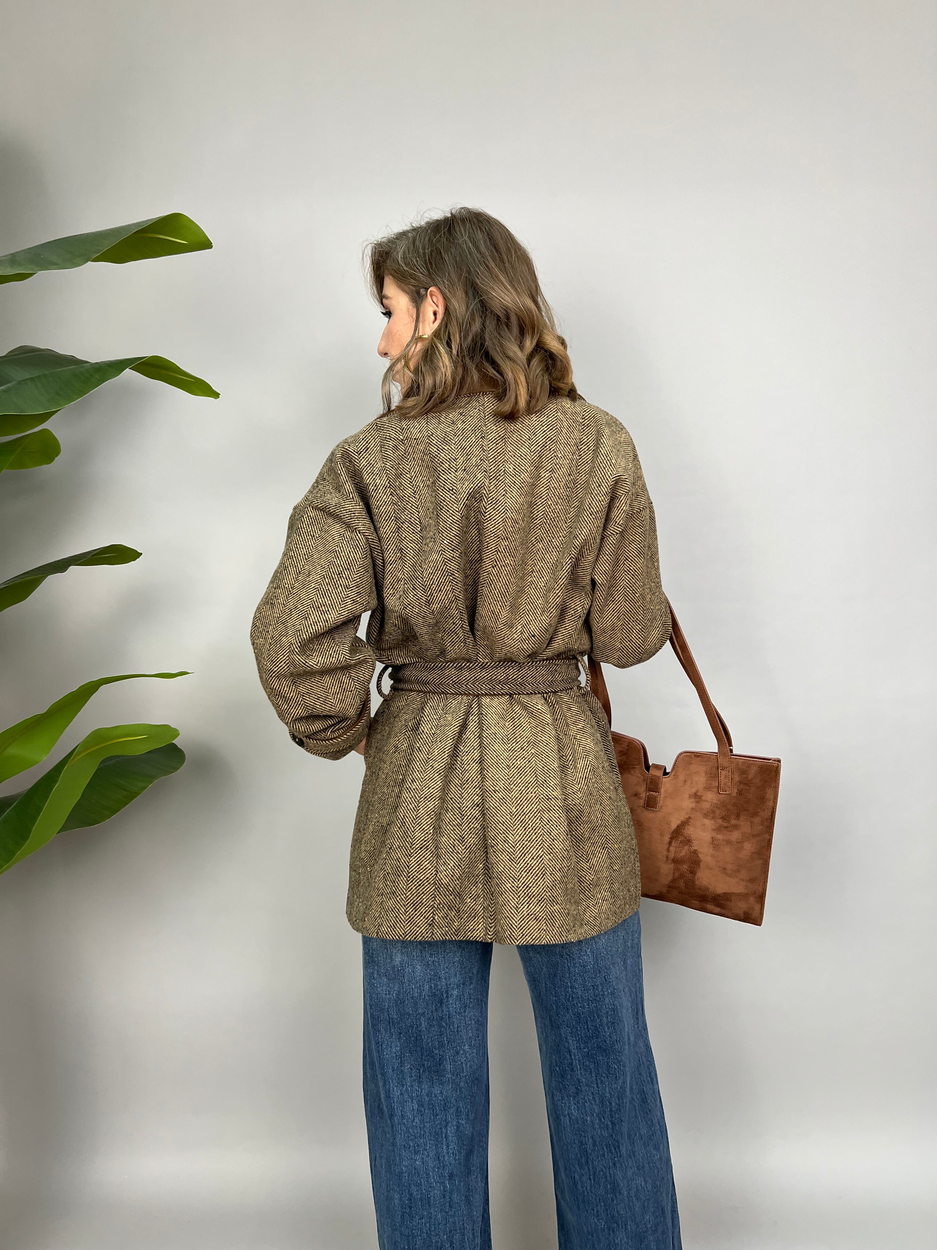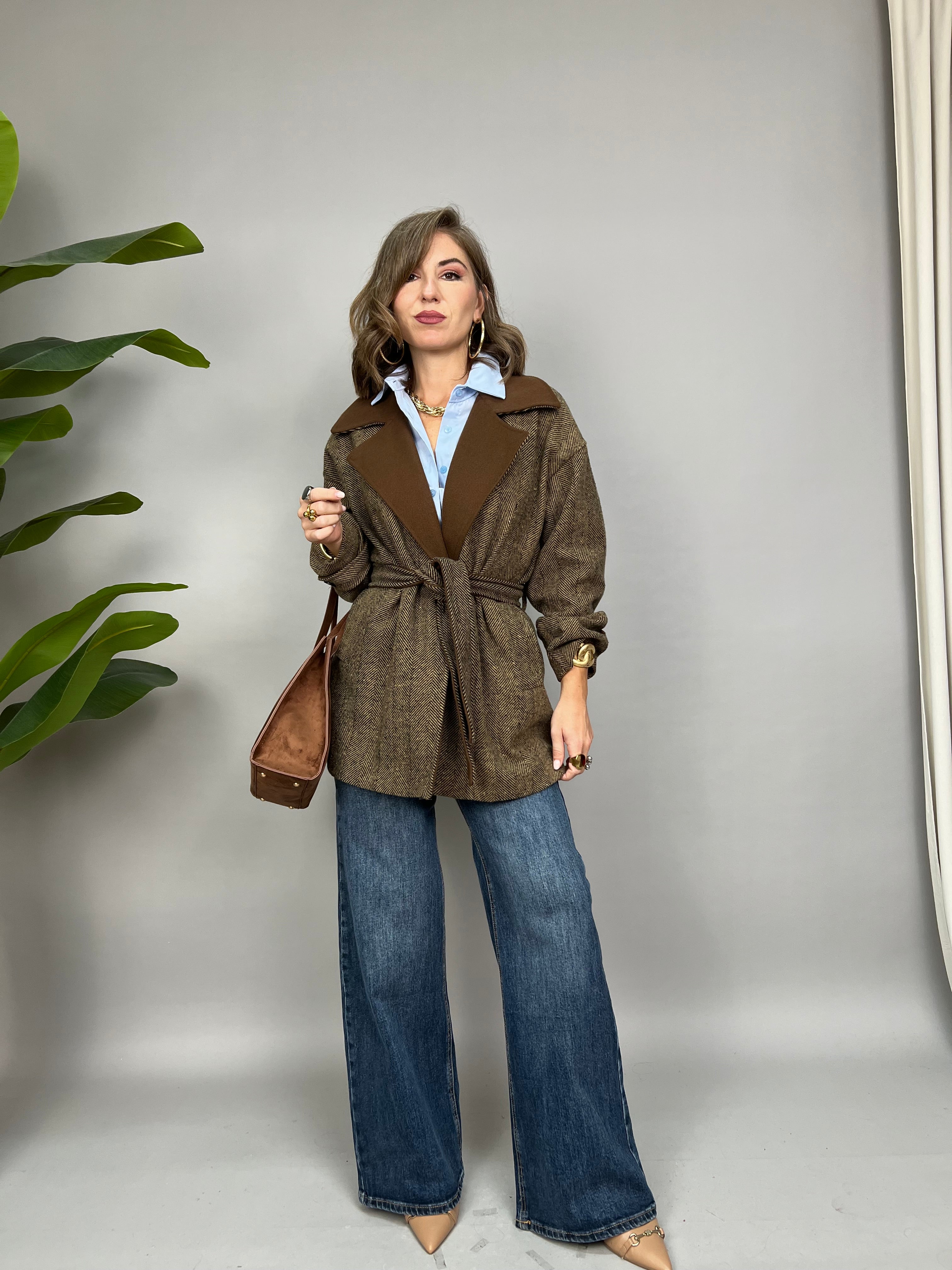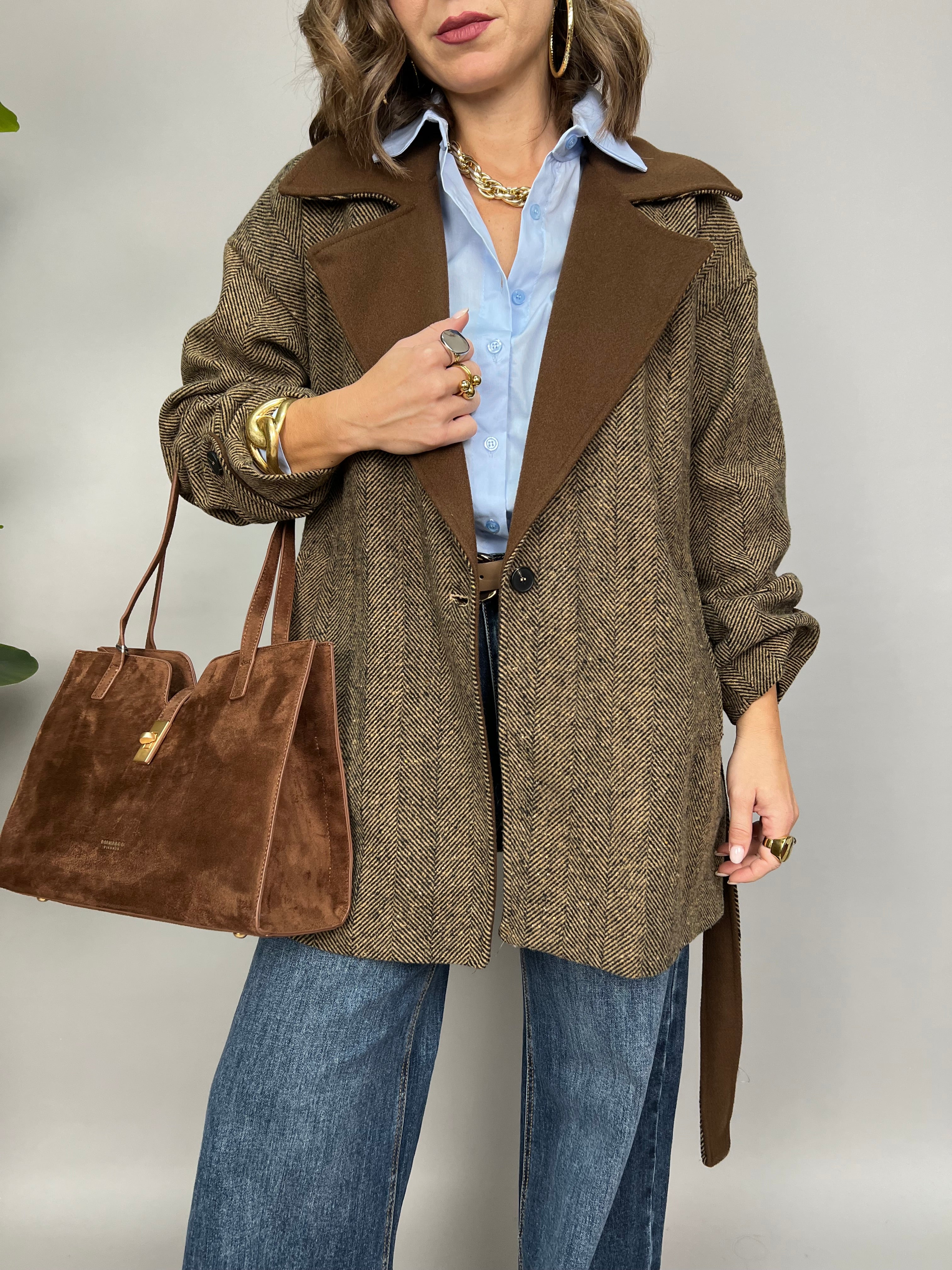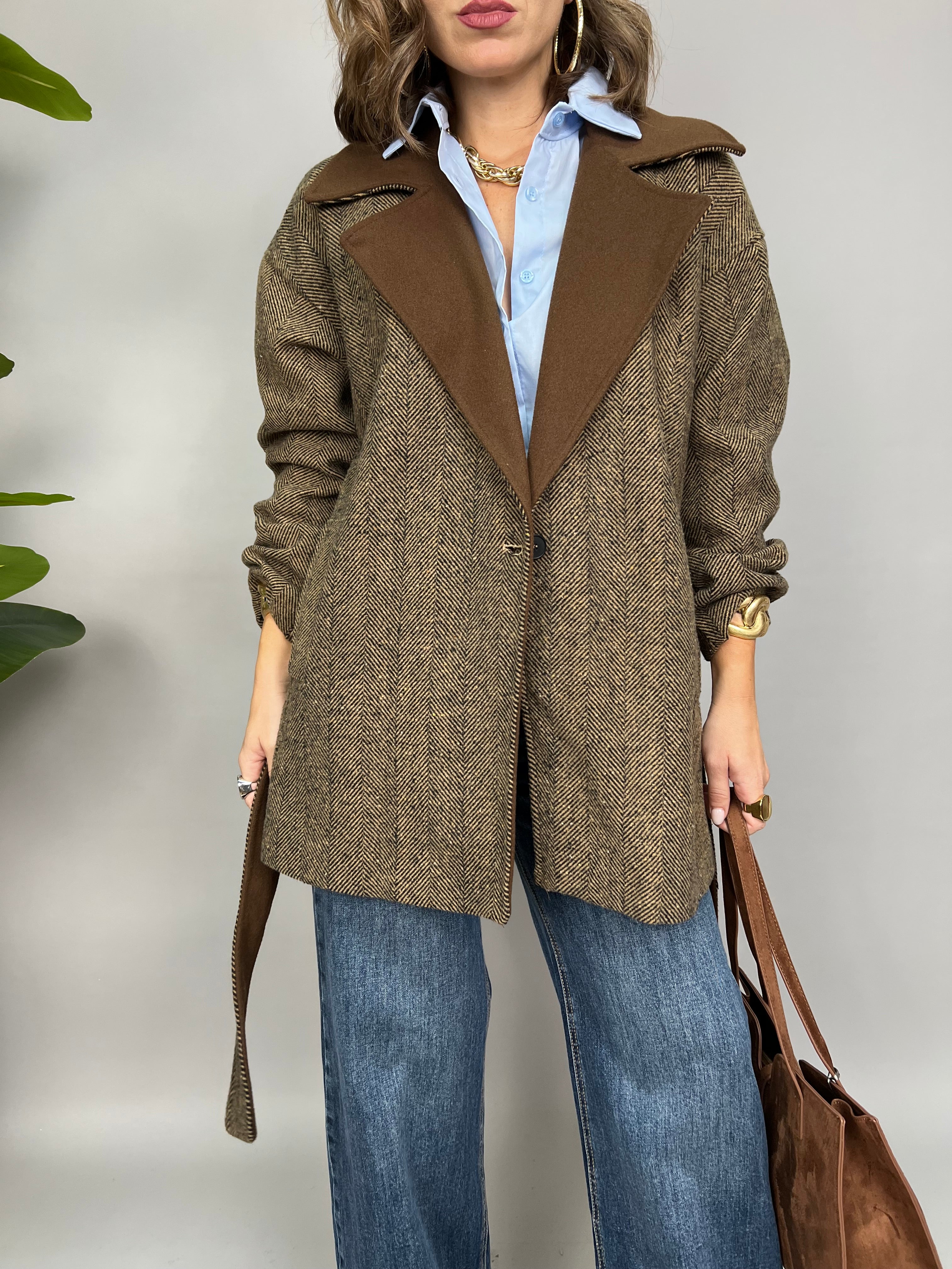 Cappotto in panno con rever in contrasto e chiusura monopetto. Internamente è foderato e presenta una fusciacca per avvitare il modello.