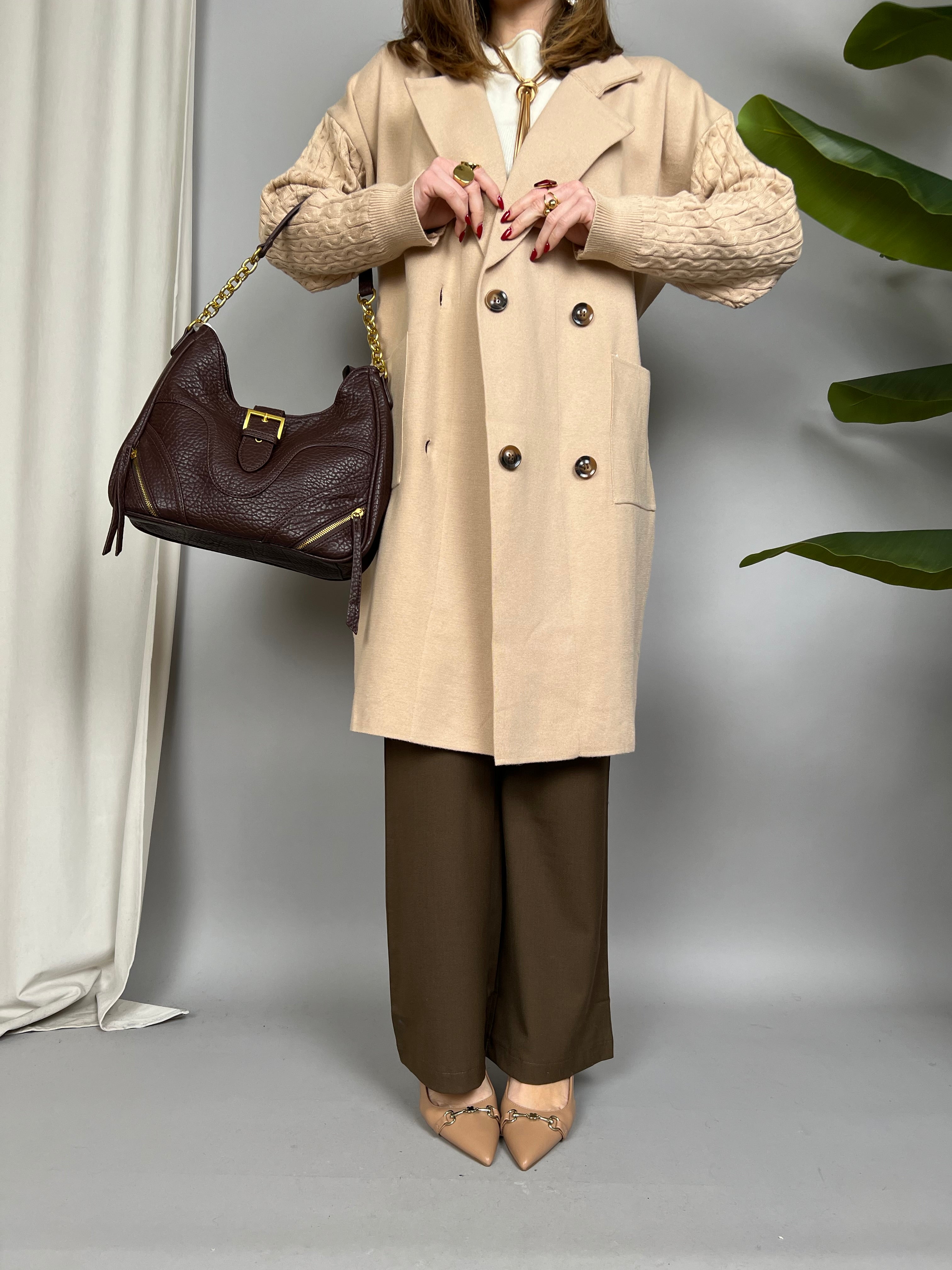 Cardigan con vestibilità comoda e trecce sulle maniche. La chiusura è doppio petto ed è presente una fusciacca per avvitare il modello.