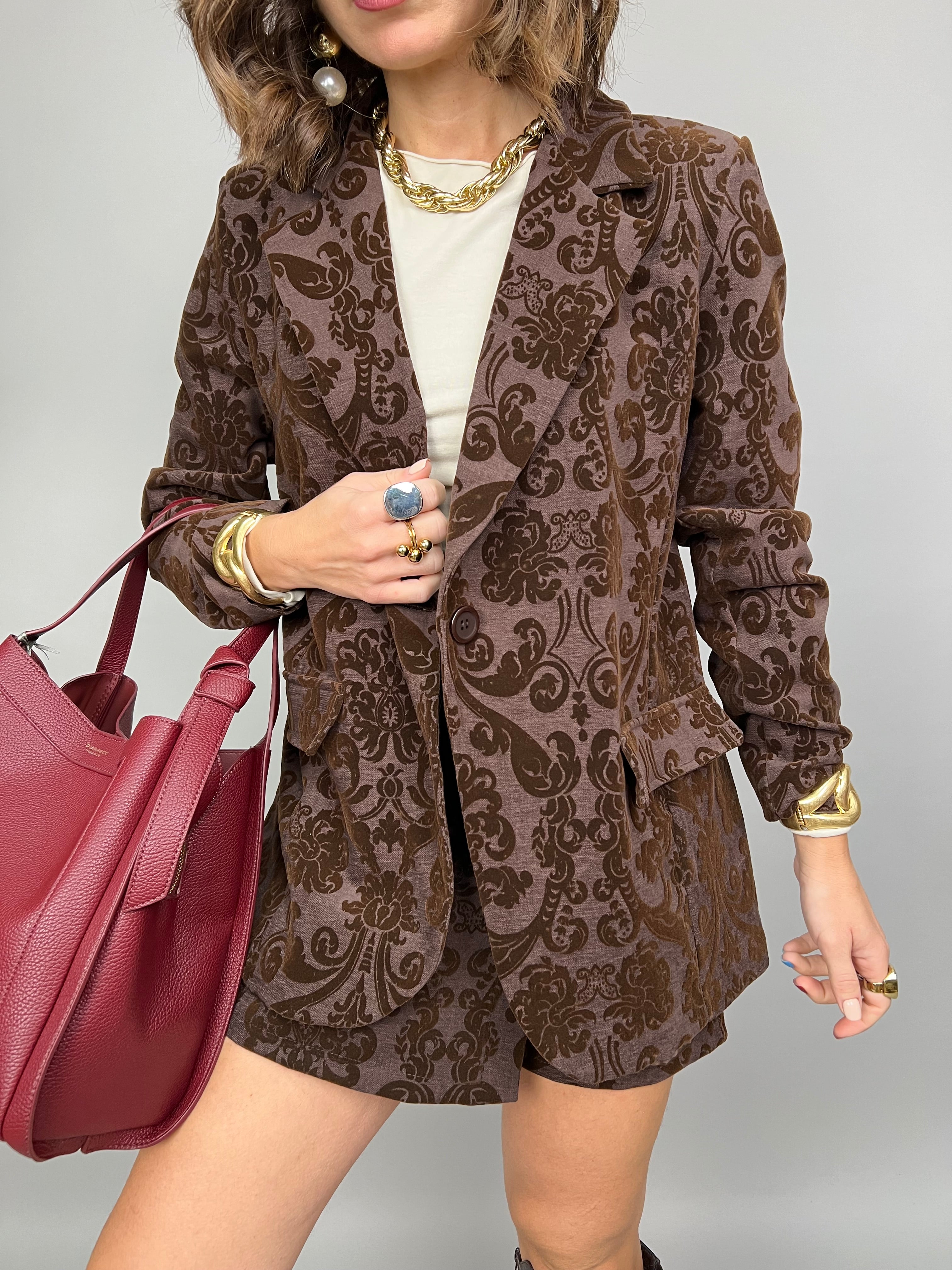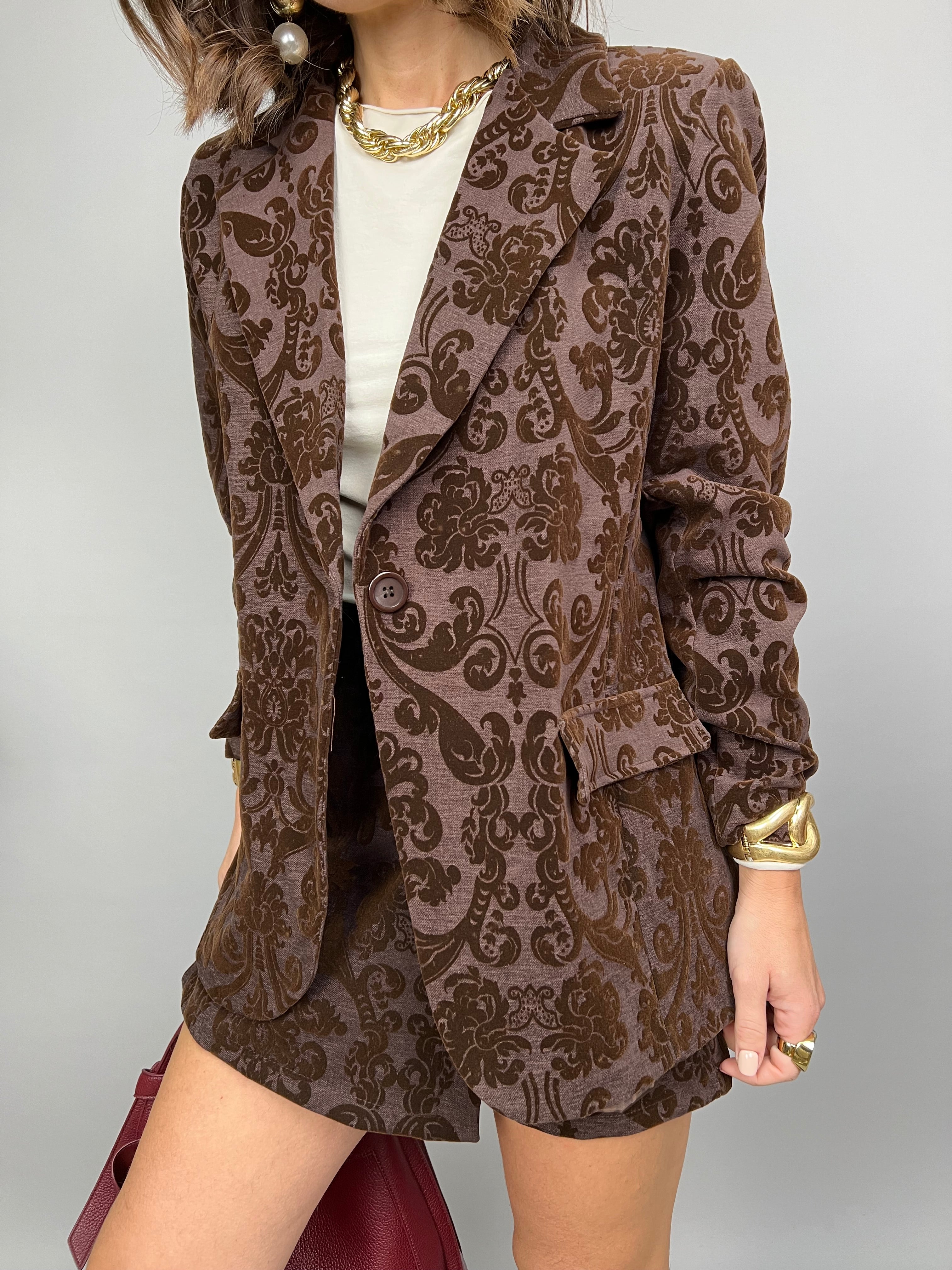 Giacca strutturata modello avvitato, con spalline di supporto e fodera interna. Il modello presenta una fantasia vellutata a rilievo.