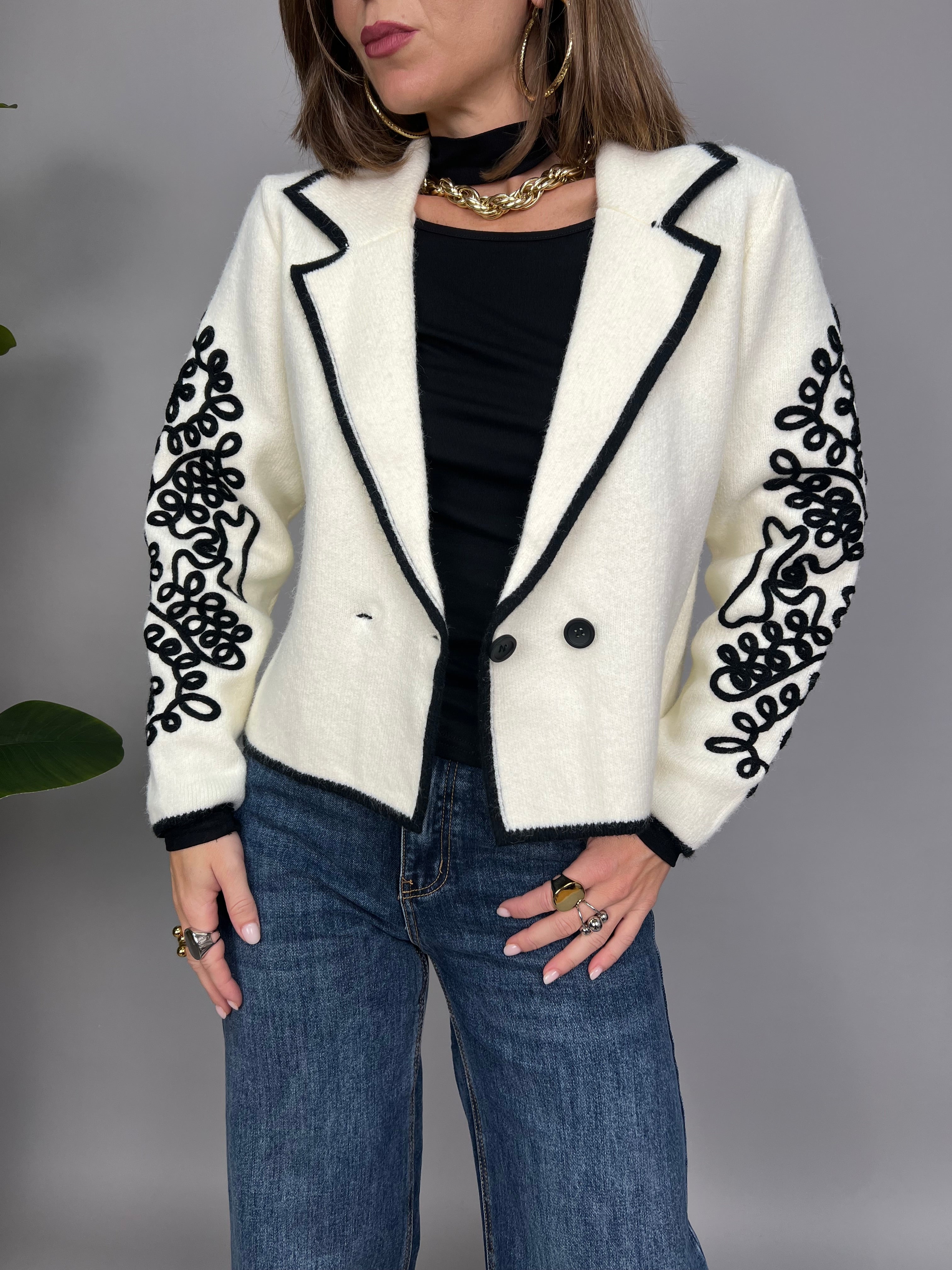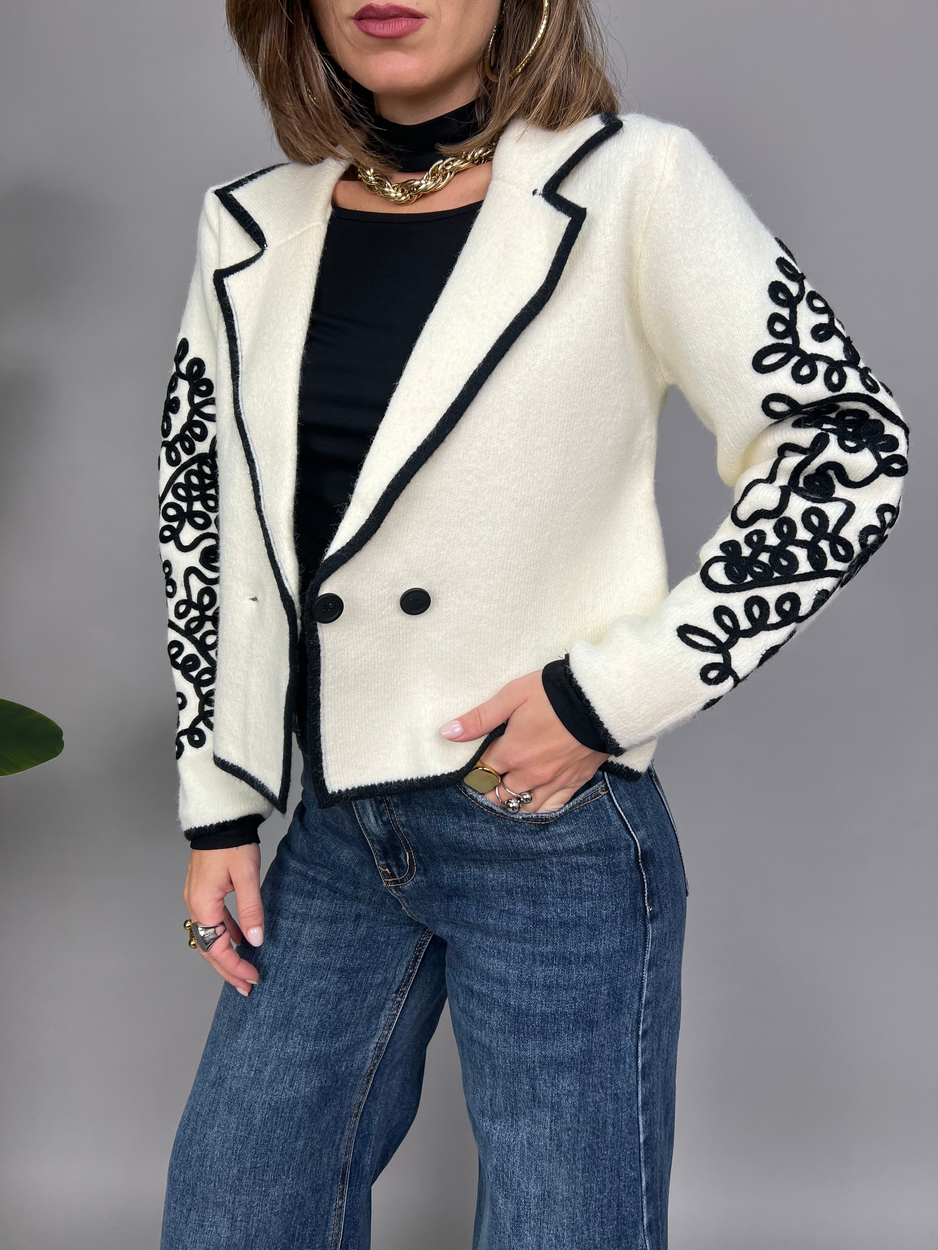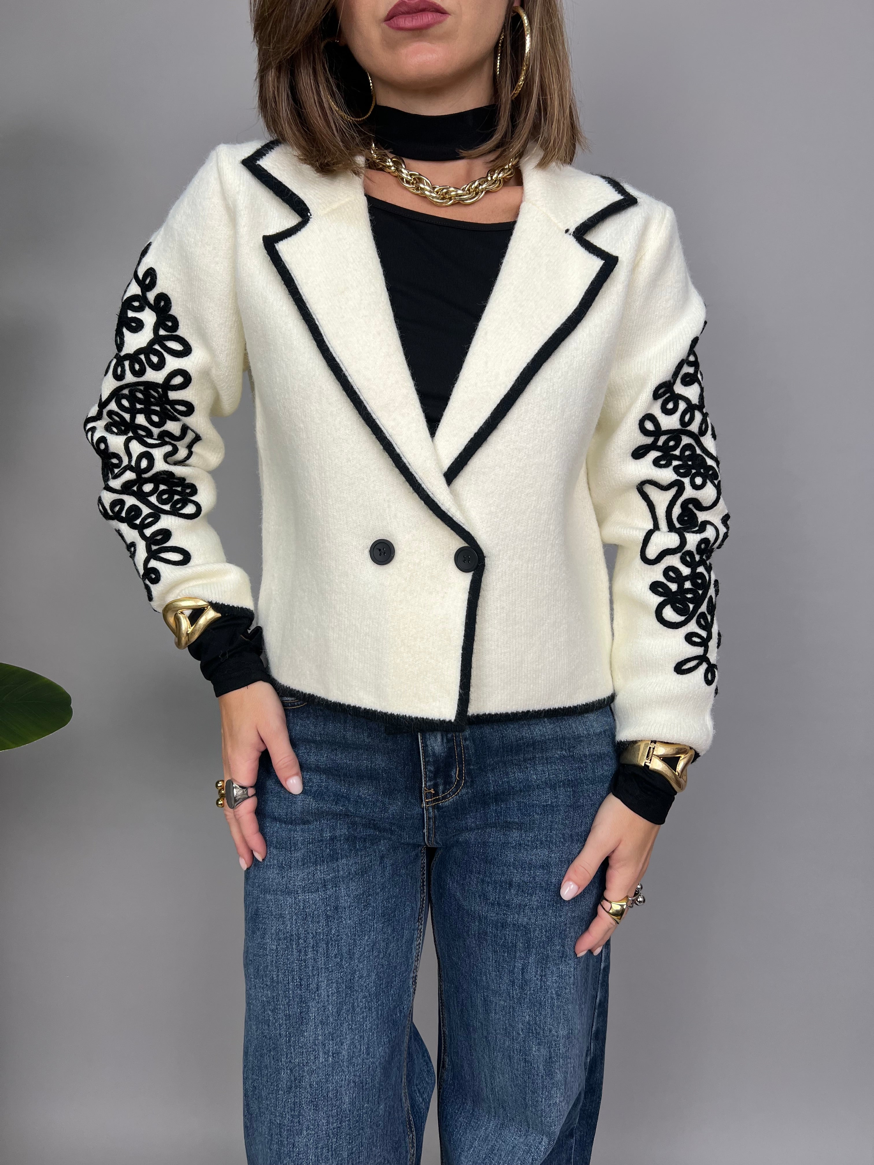 Giacca calda in maglia doppia con contrasto sul rever e chiusura doppio petto. Sulla braccia sono presenti delle applicazioni