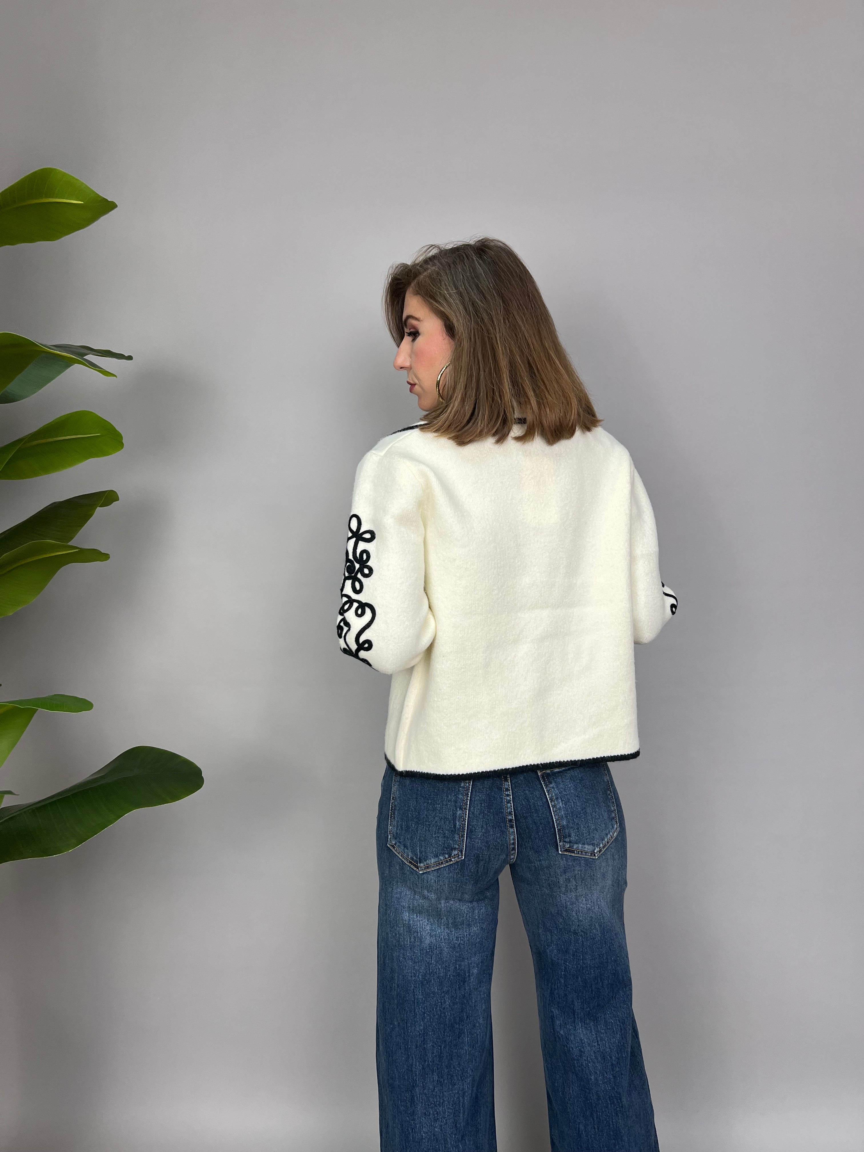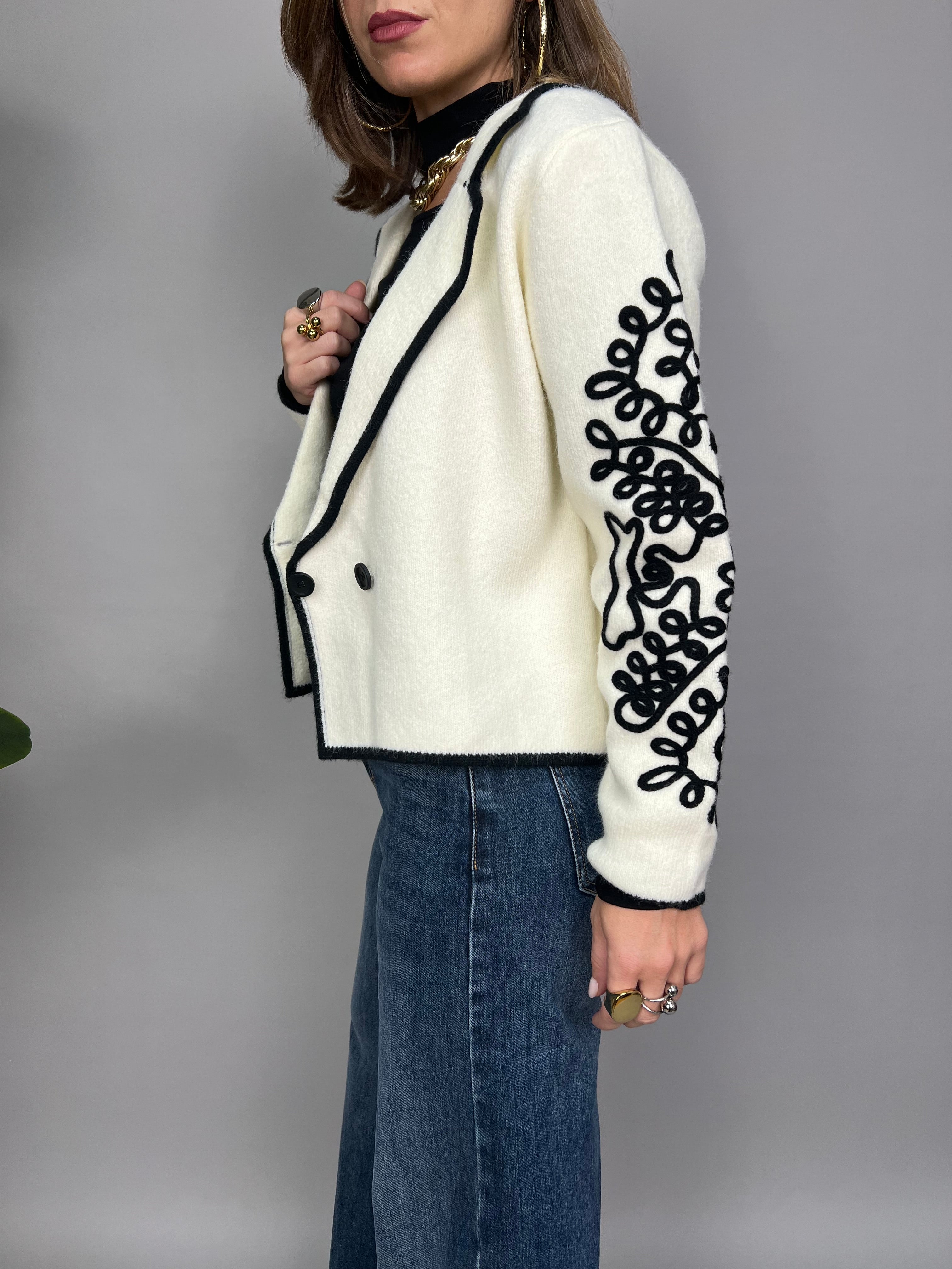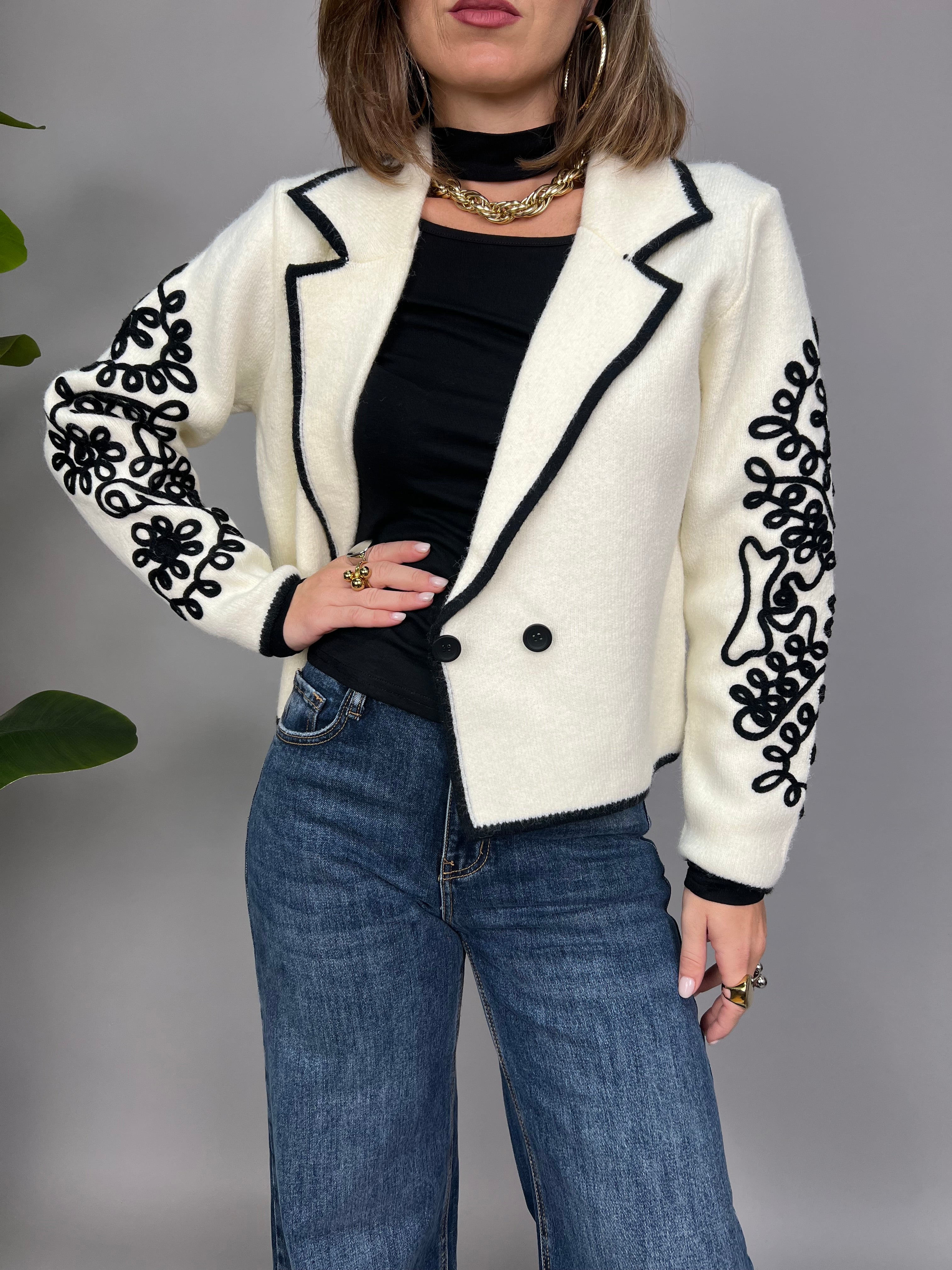 Giacca calda in maglia doppia con contrasto sul rever e chiusura doppio petto. Sulla braccia sono presenti delle applicazioni