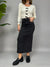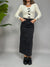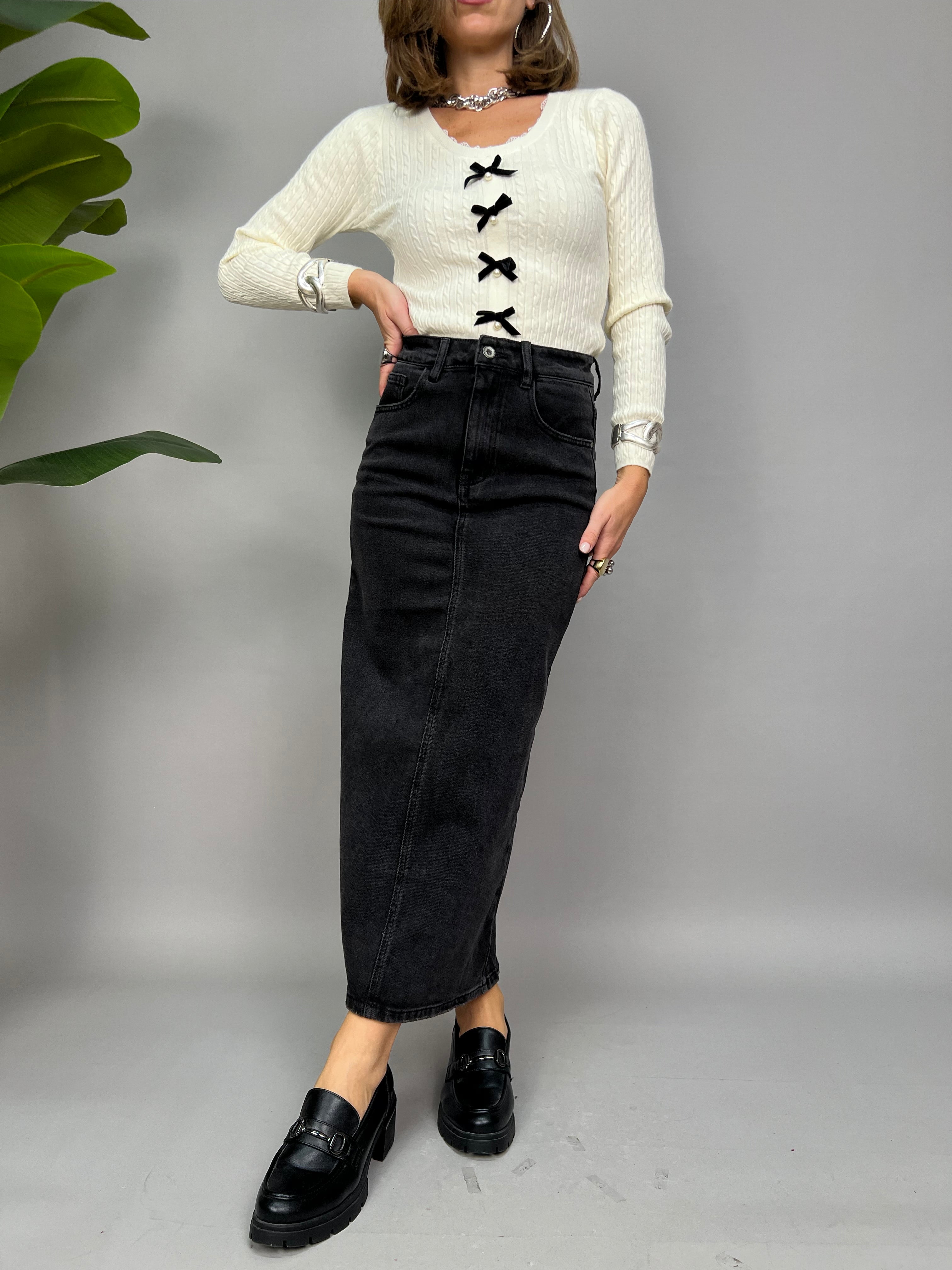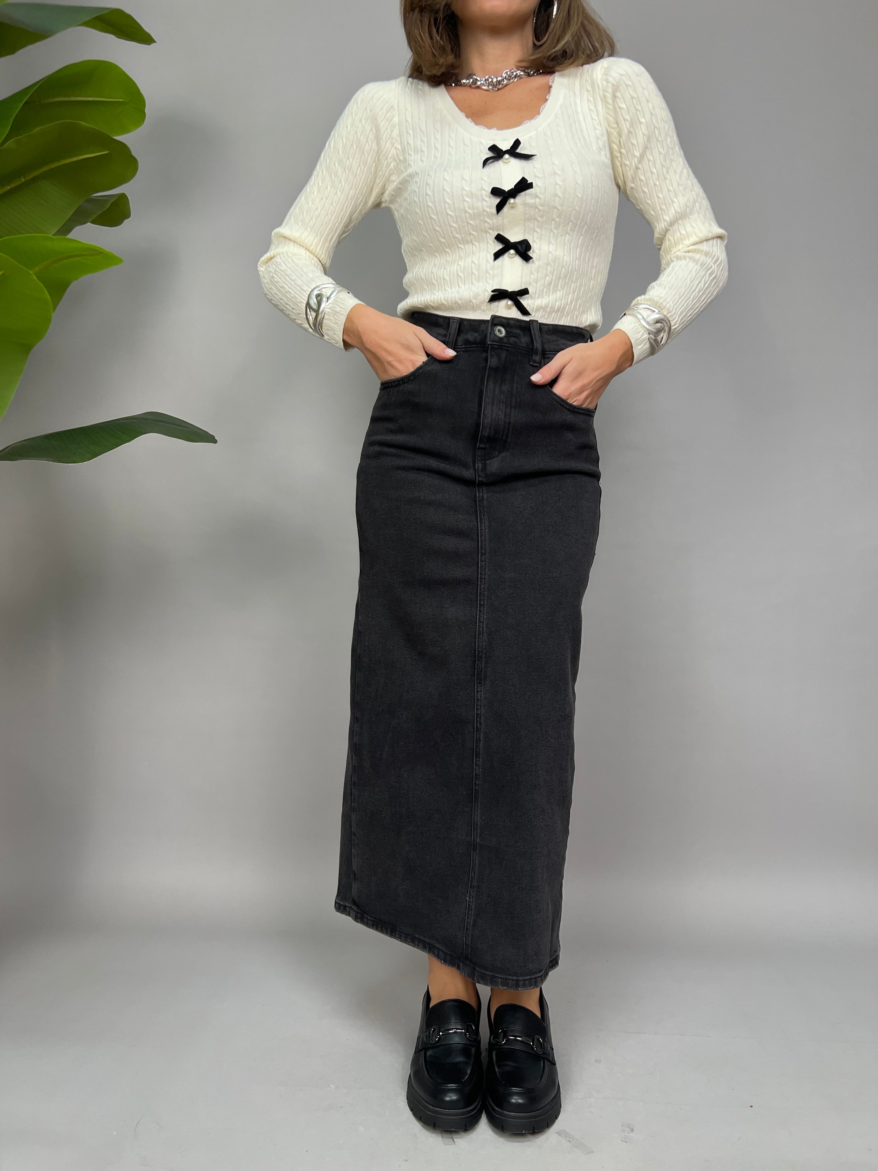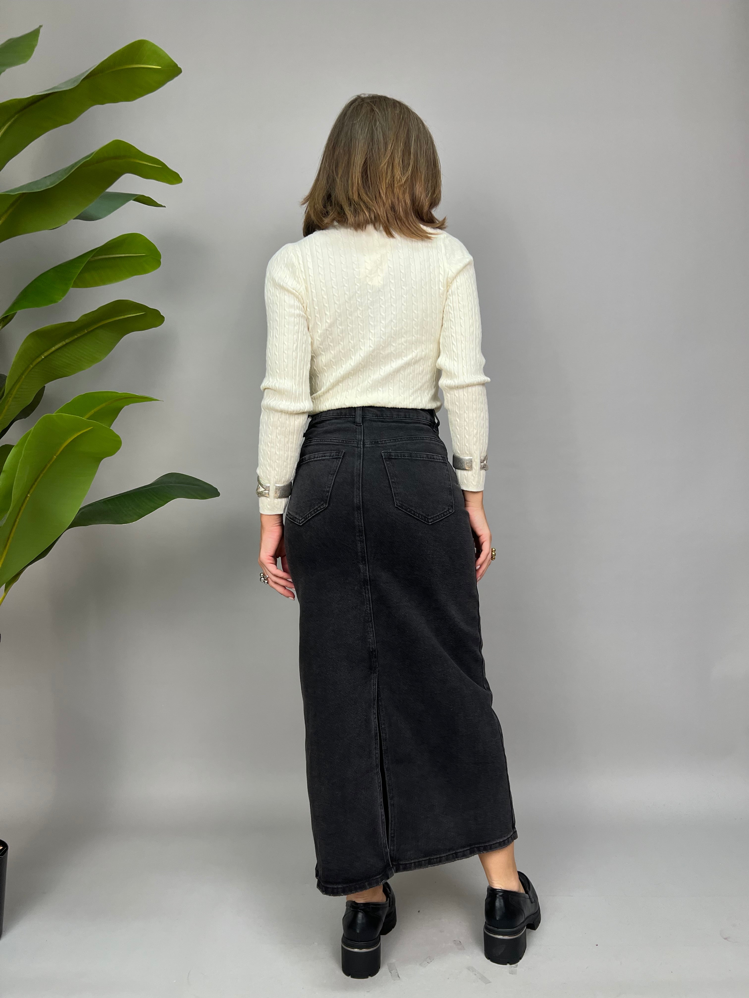 Gonna in jeans elasticizzato modello longuette. Presenta uno spacco sul retro e veste una taglia in più.