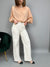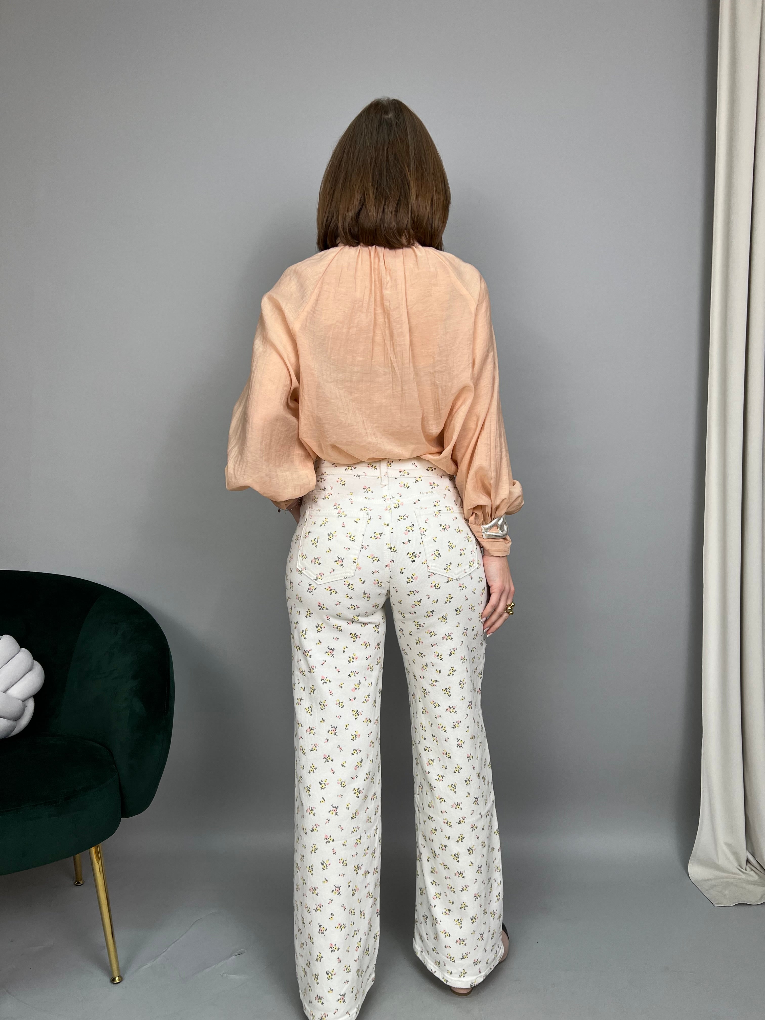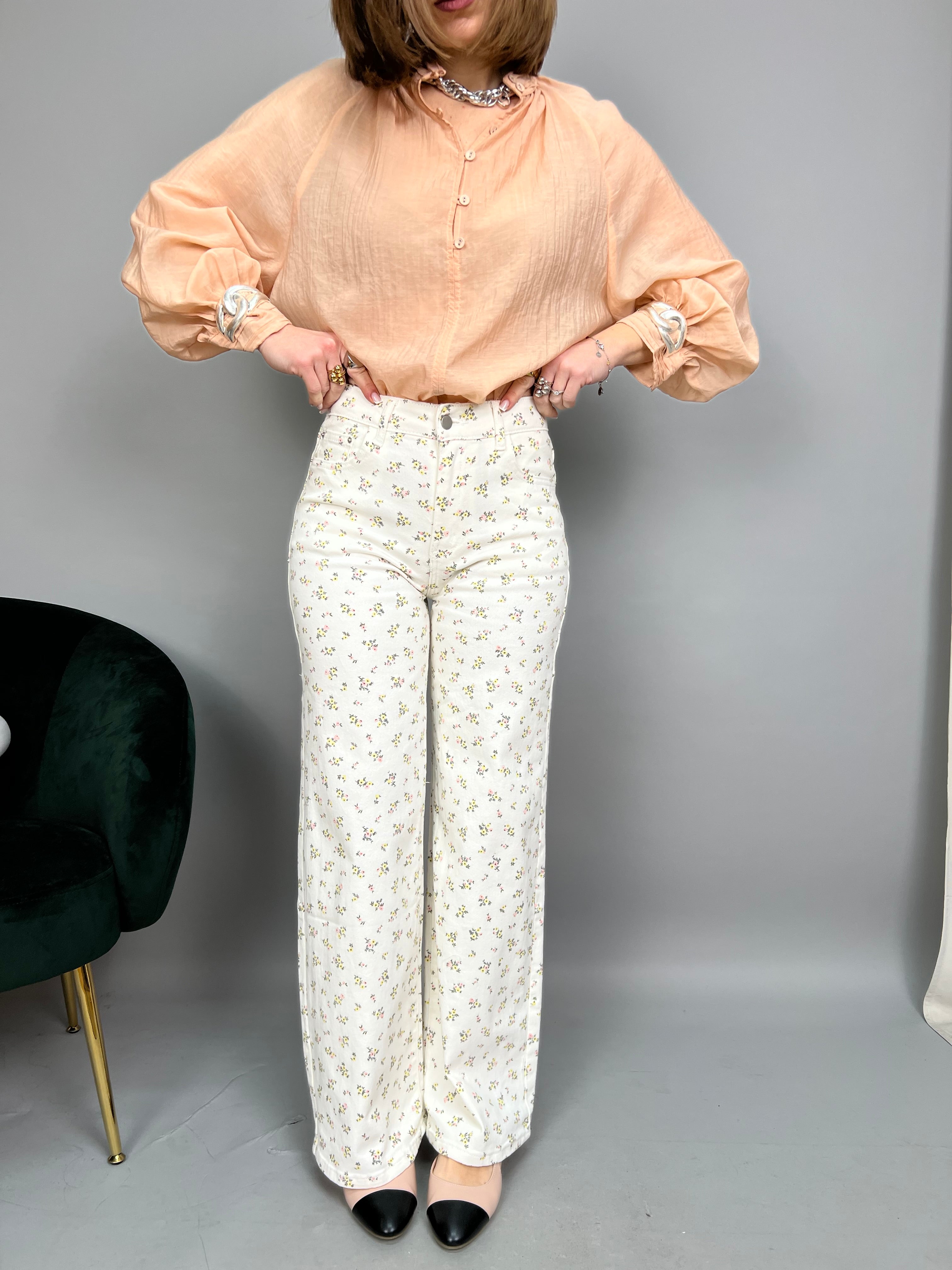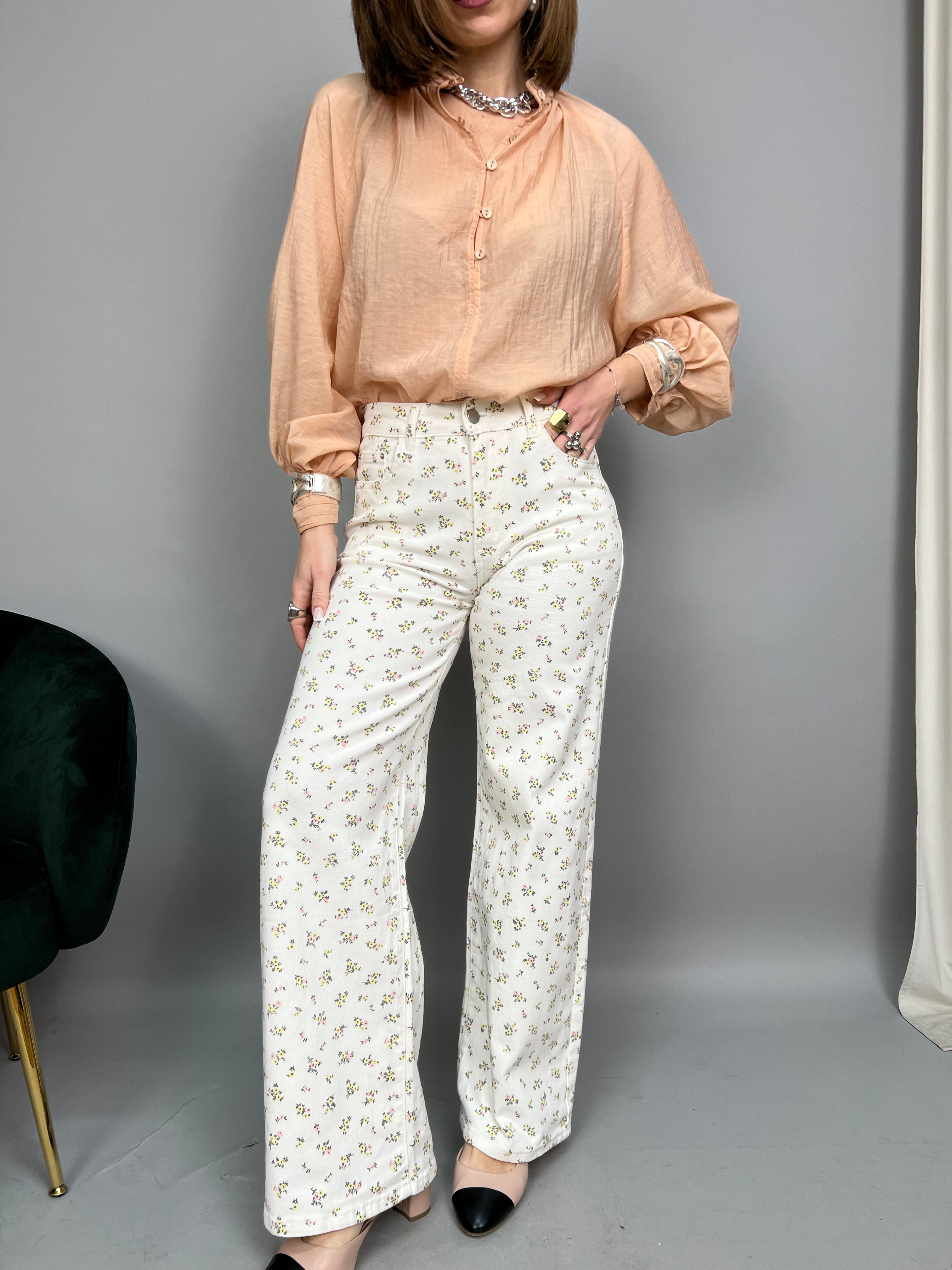 Jeans modello "palazzo" dalla gamba dritta e a vita media. La tela è leggermente elasticizzata, e presenta una fantasia floreale a contrasto su tutto il modello.
