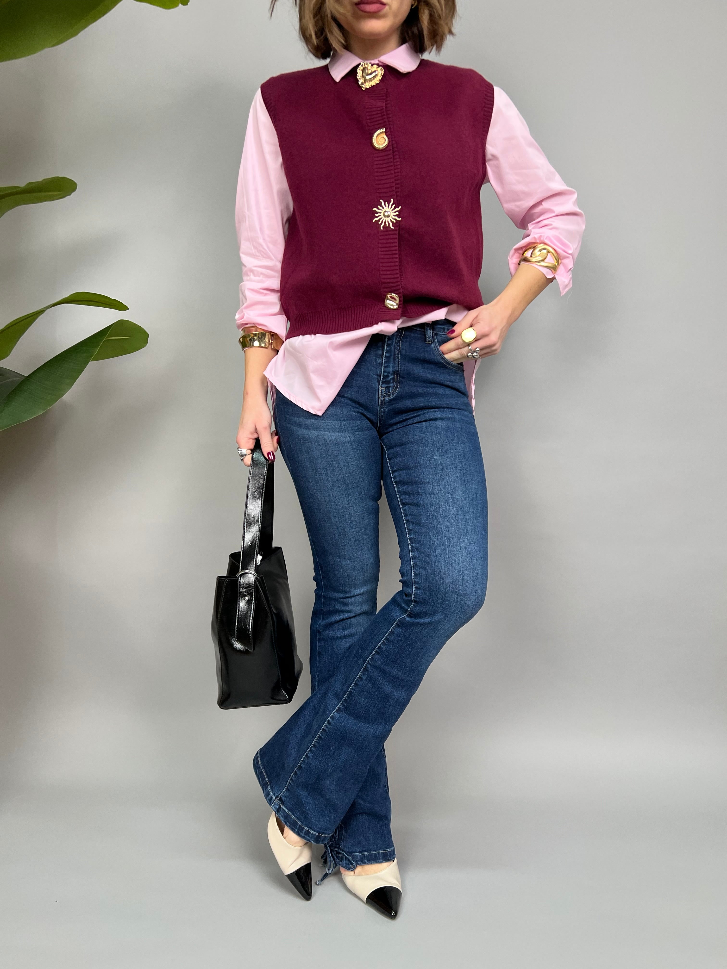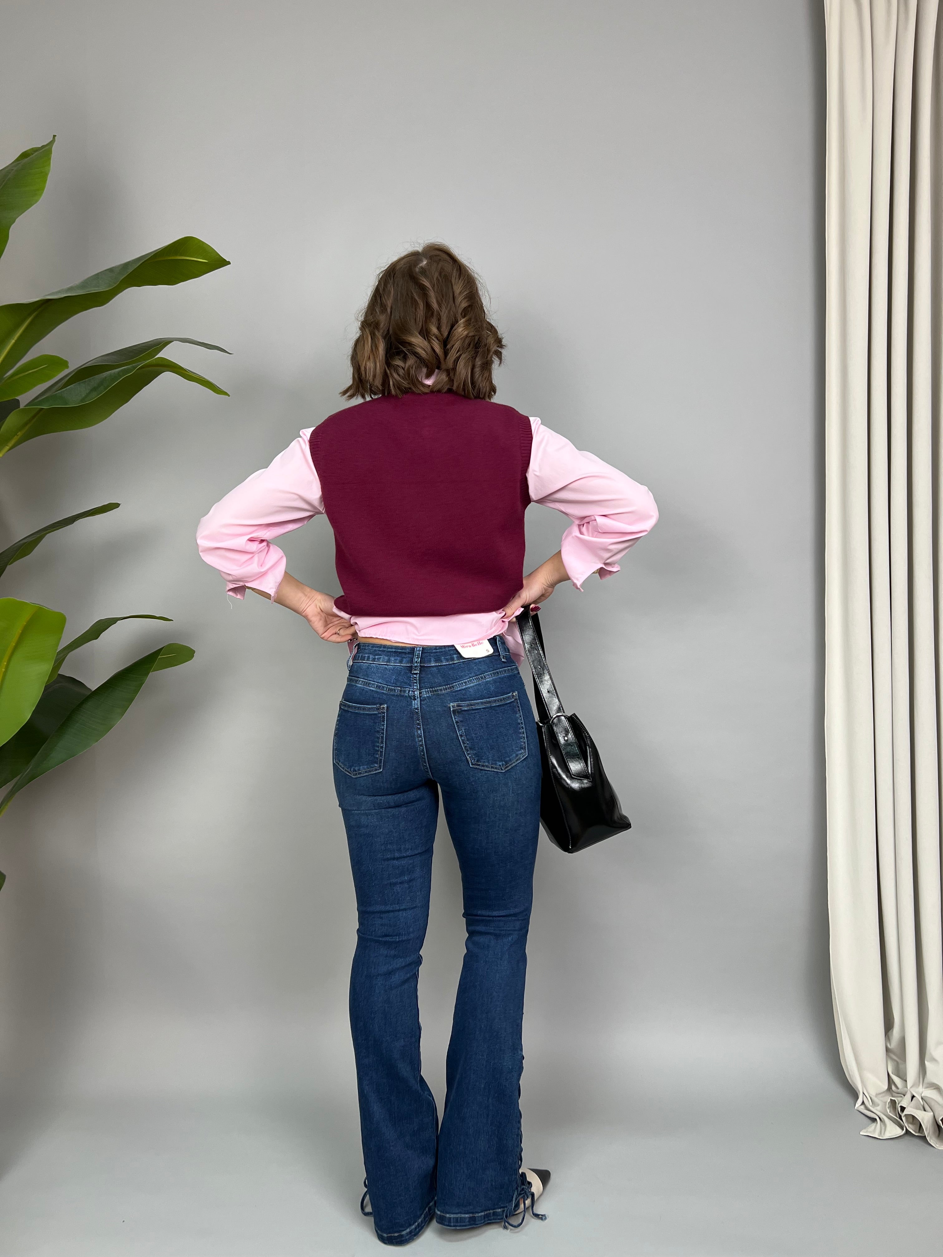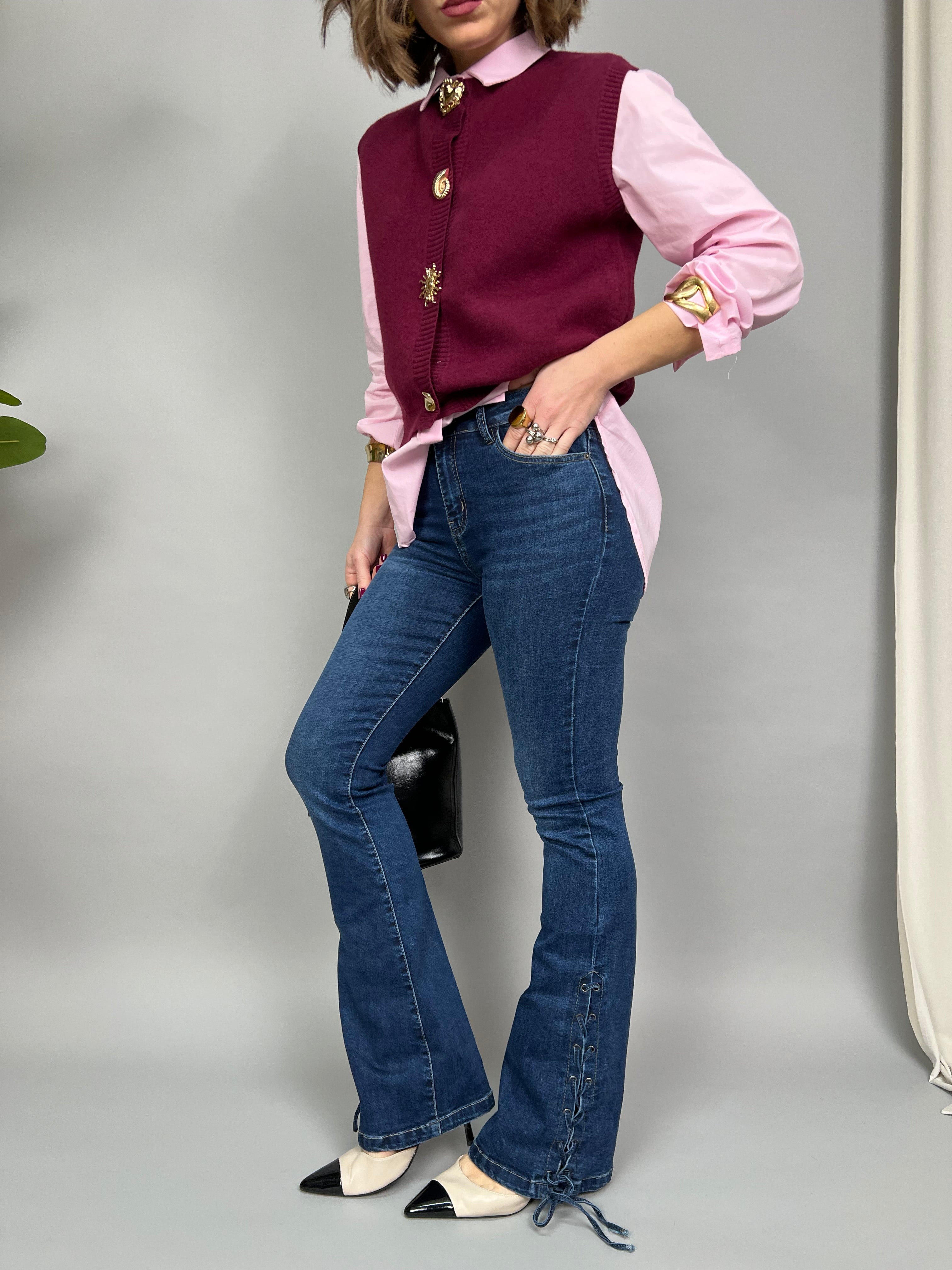 Jeans modello bootcut, scampanato sulla lunghezza. La tela è elasticizzata ed il jeans ha una vita media. Il modello è caratterizzato da una treccia sulla parte finale della lunghezza.