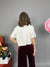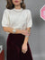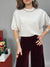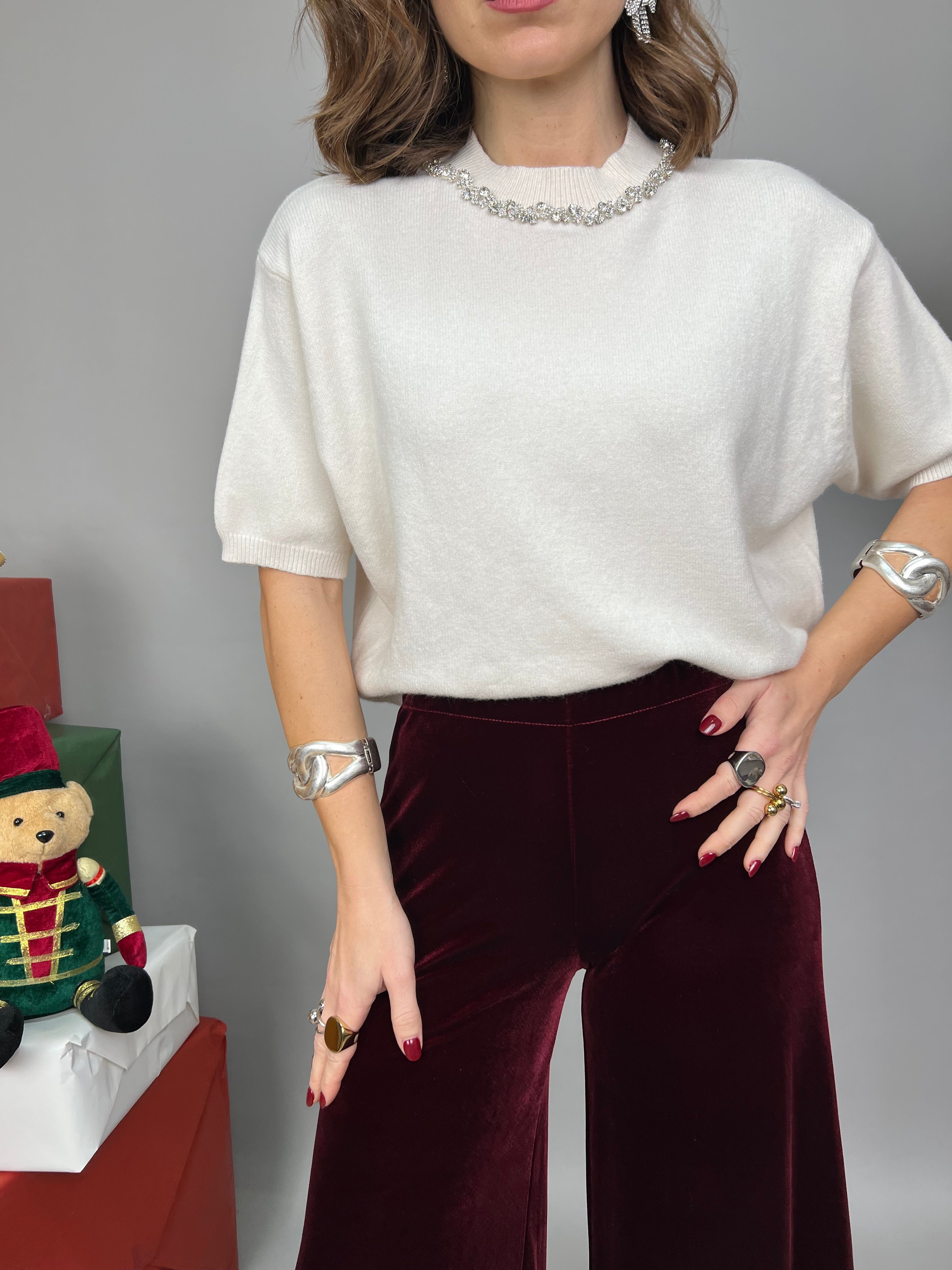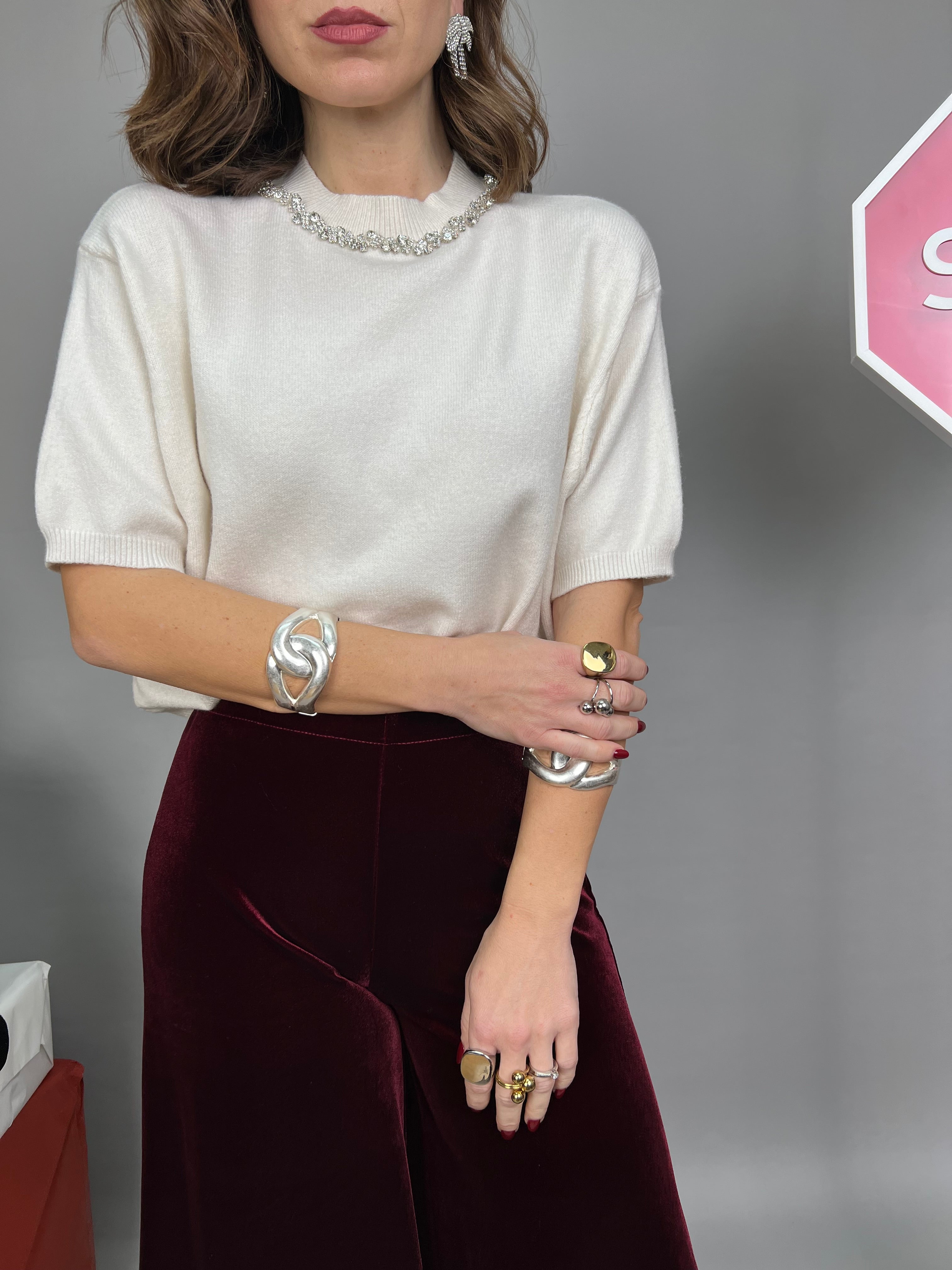 Maglioncino collo medio, impreziosito da un girocollo effetto "collana di diamanti". Il modello è in maglia calda, manica corta ampia leggermente a palloncino. La vestibilità è comoda e il tessuto è morbido.