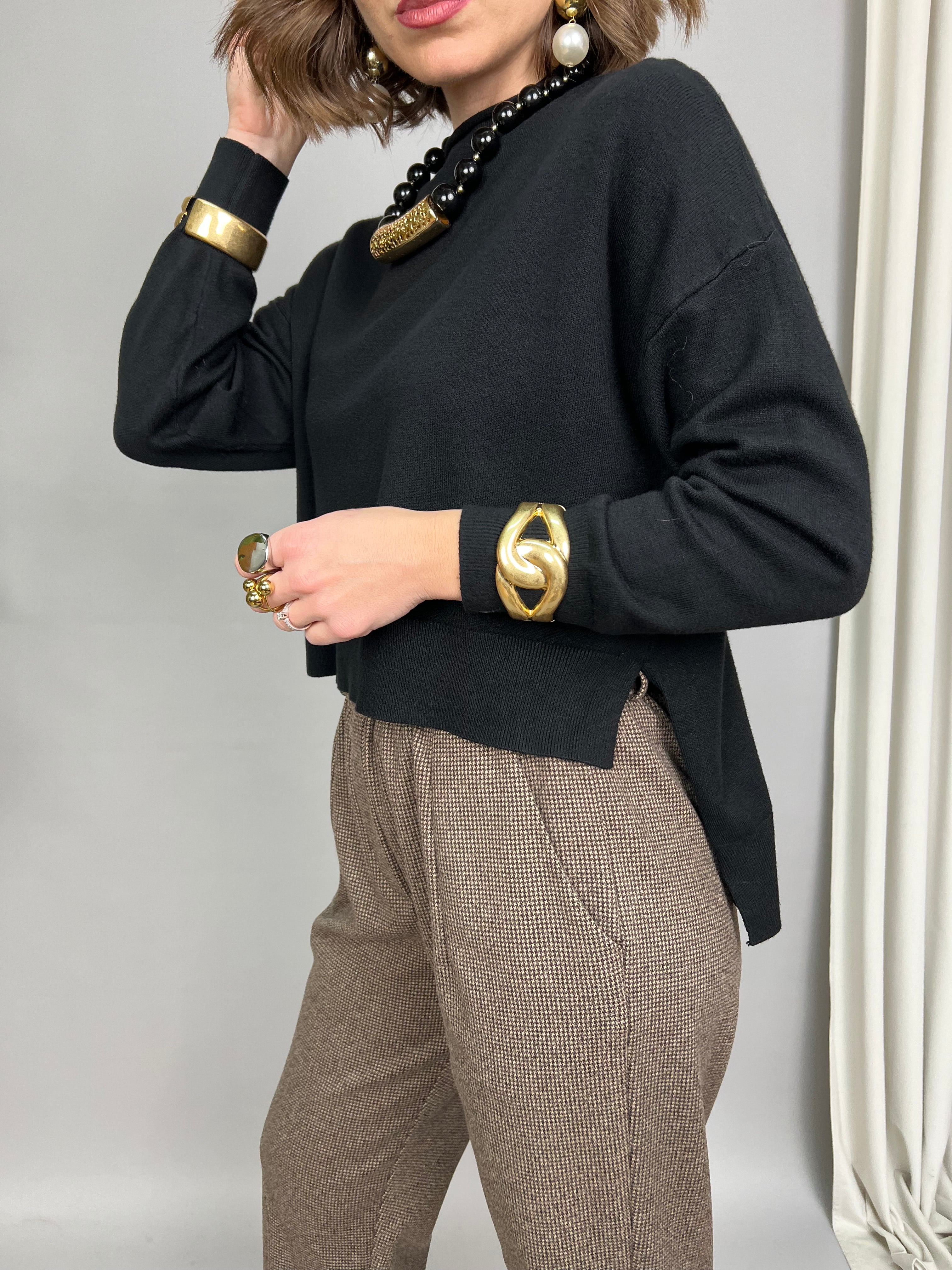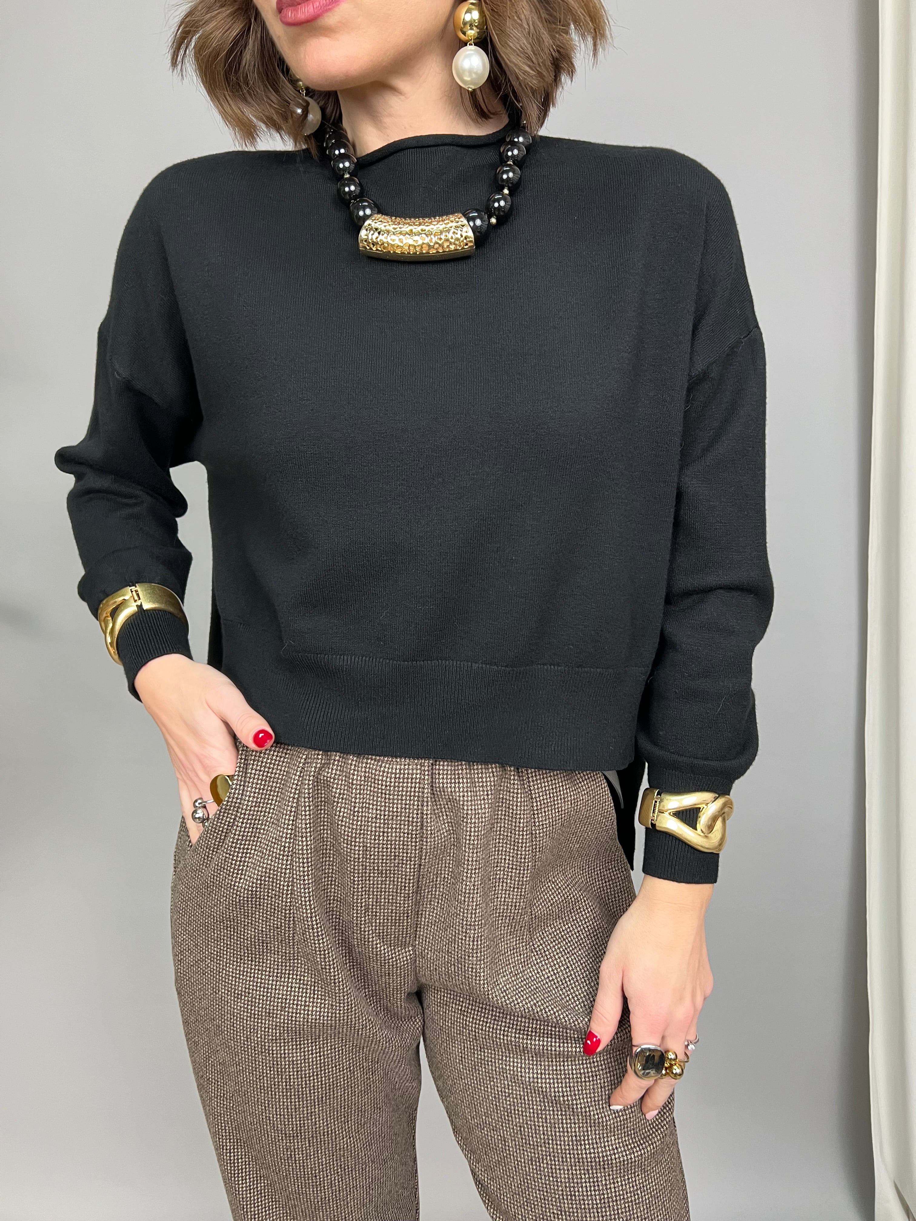 Maglioncino con collo medio, in tessuto morbido e dalla vestibilità molto comoda. Il modello ha due spacchi laterali, ed è più corto sul davanti, rispetto al retro che rimane più lungo.