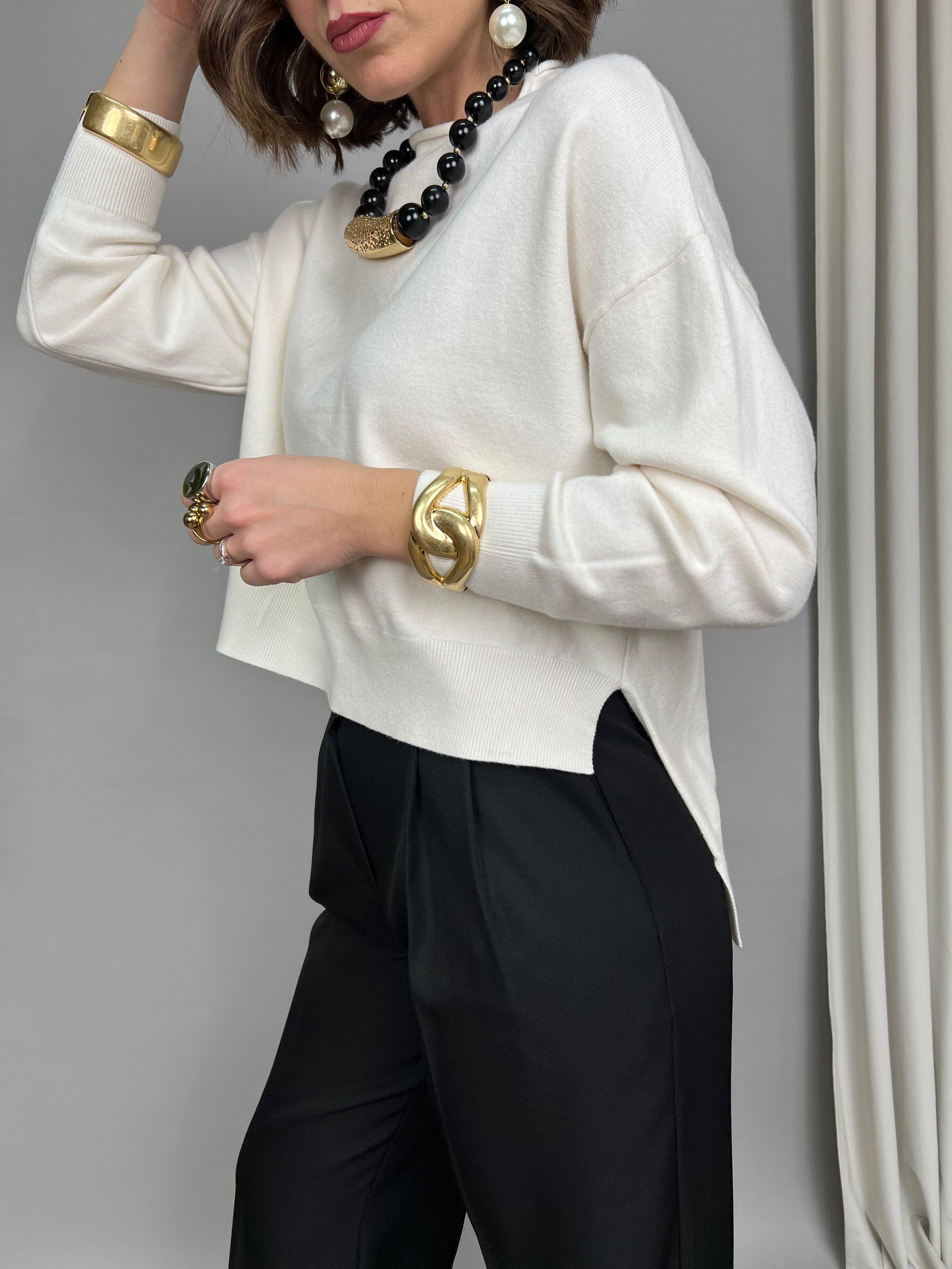 Maglioncino con collo medio, in tessuto morbido e dalla vestibilità molto comoda. Il modello ha due spacchi laterali, ed è più corto sul davanti, rispetto al retro che rimane più lungo.