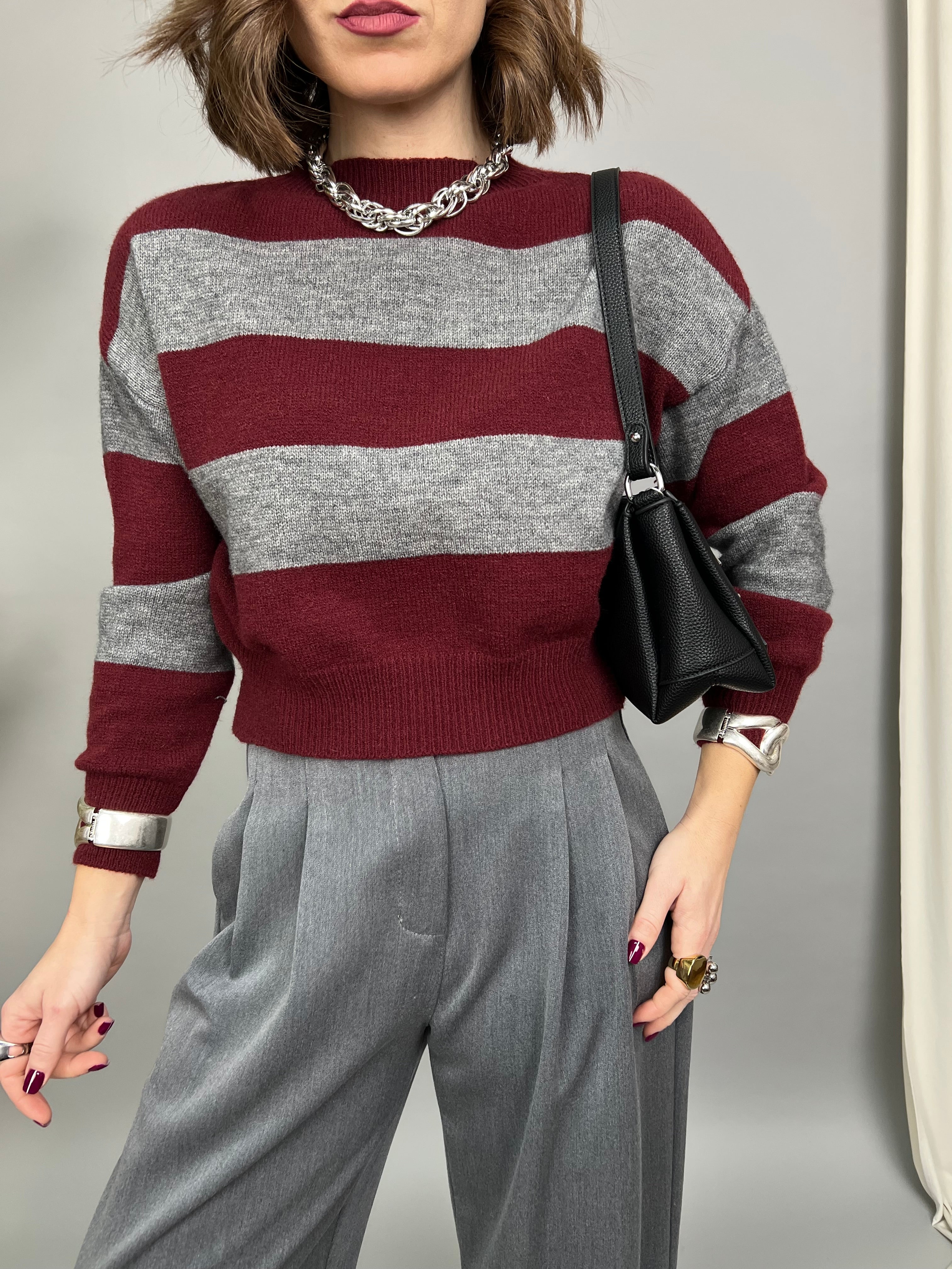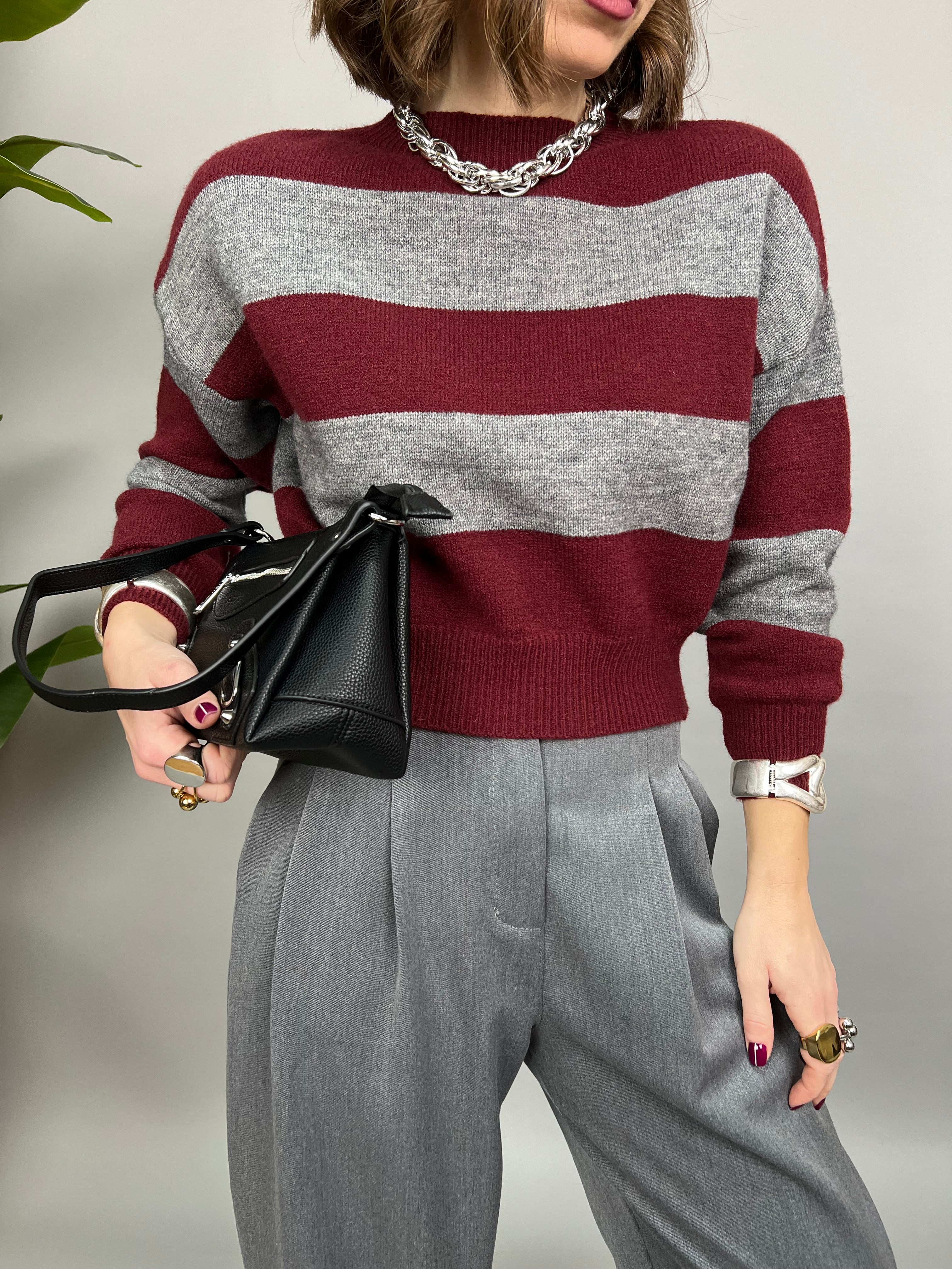 Maglioncino collo tondo, dal tessuto morbido e caldo. La vestibilità è comoda. Presenta una fantasia con fasce orizzontali a contrasto su tutto il modello.