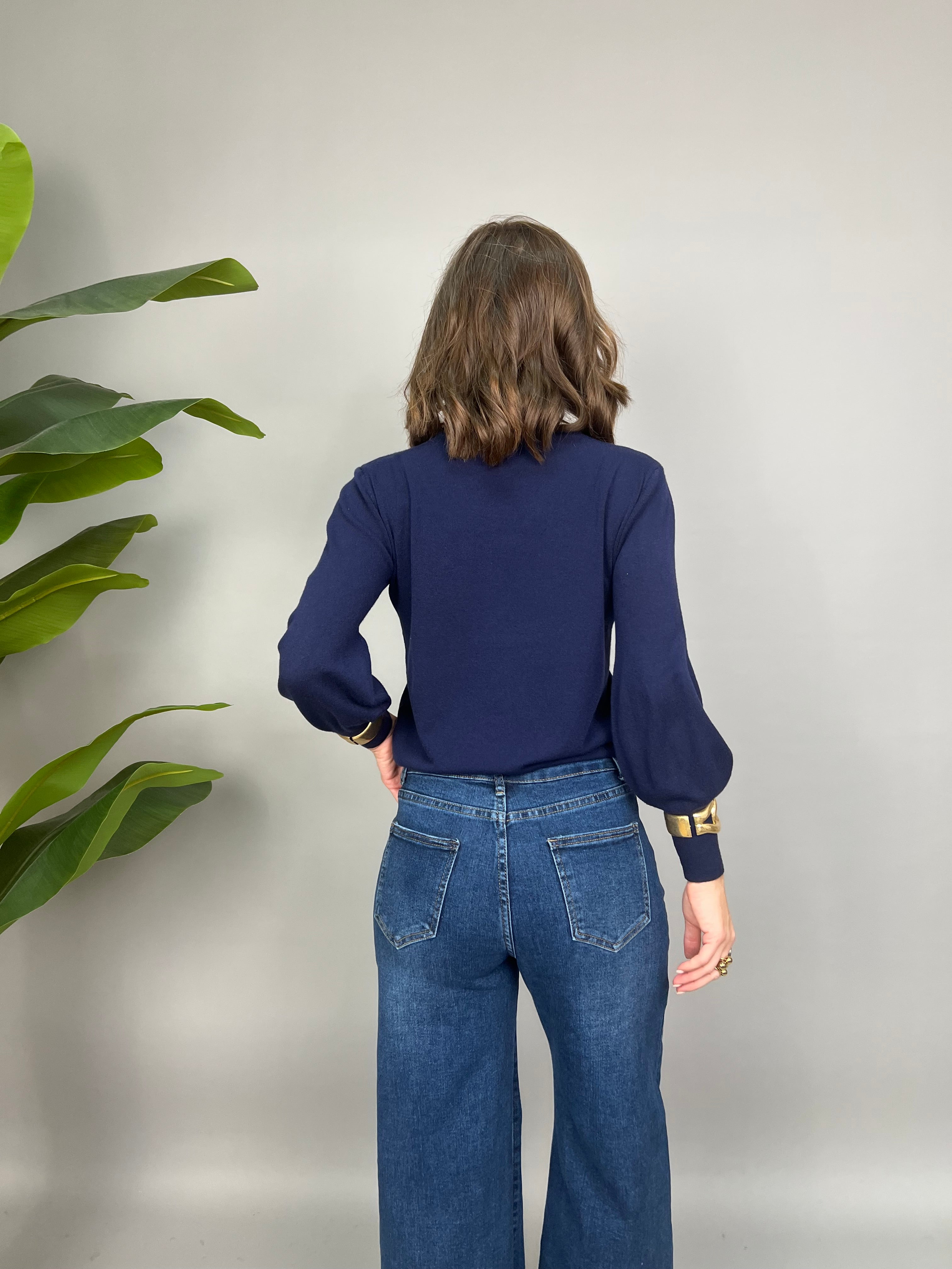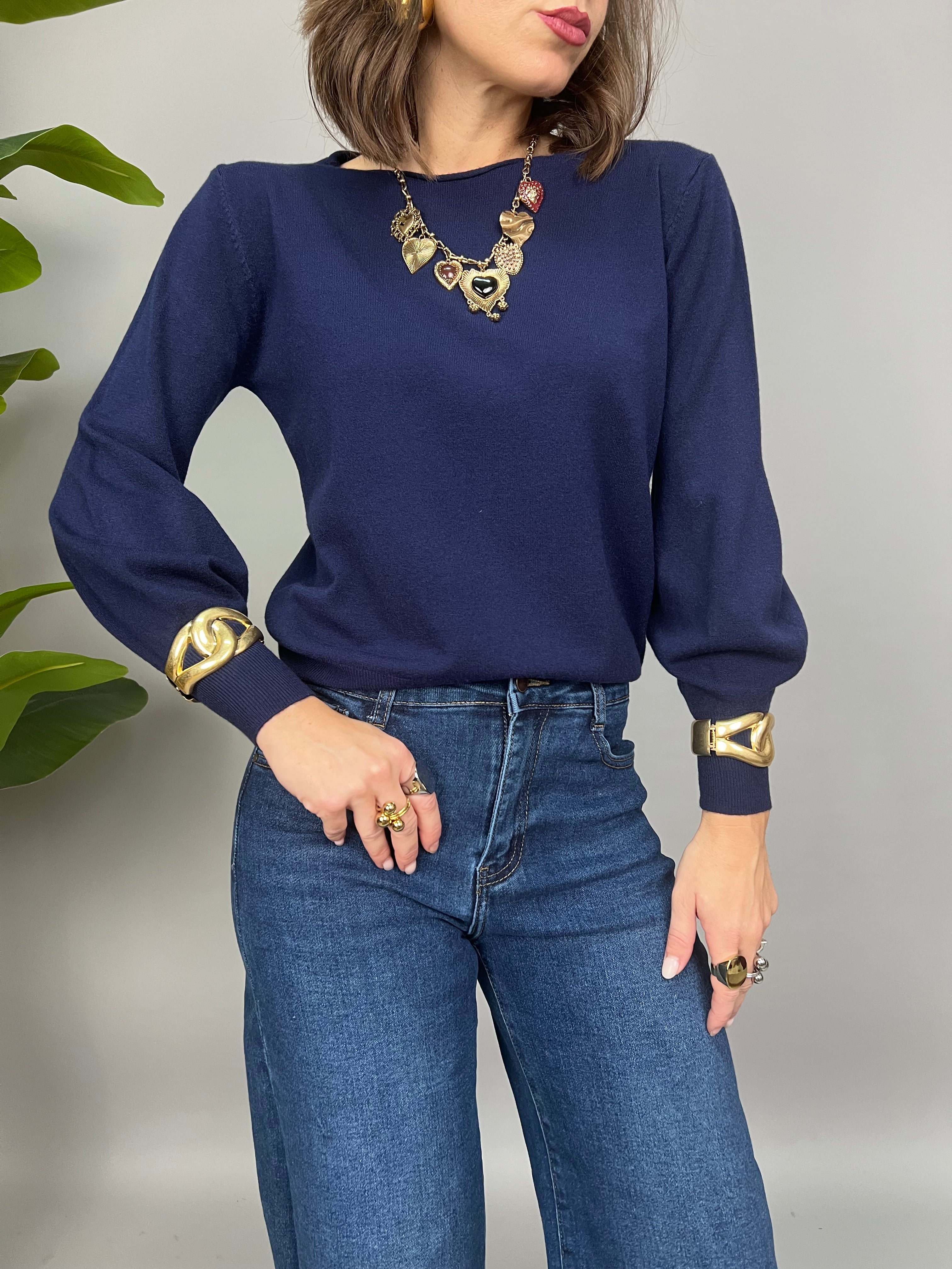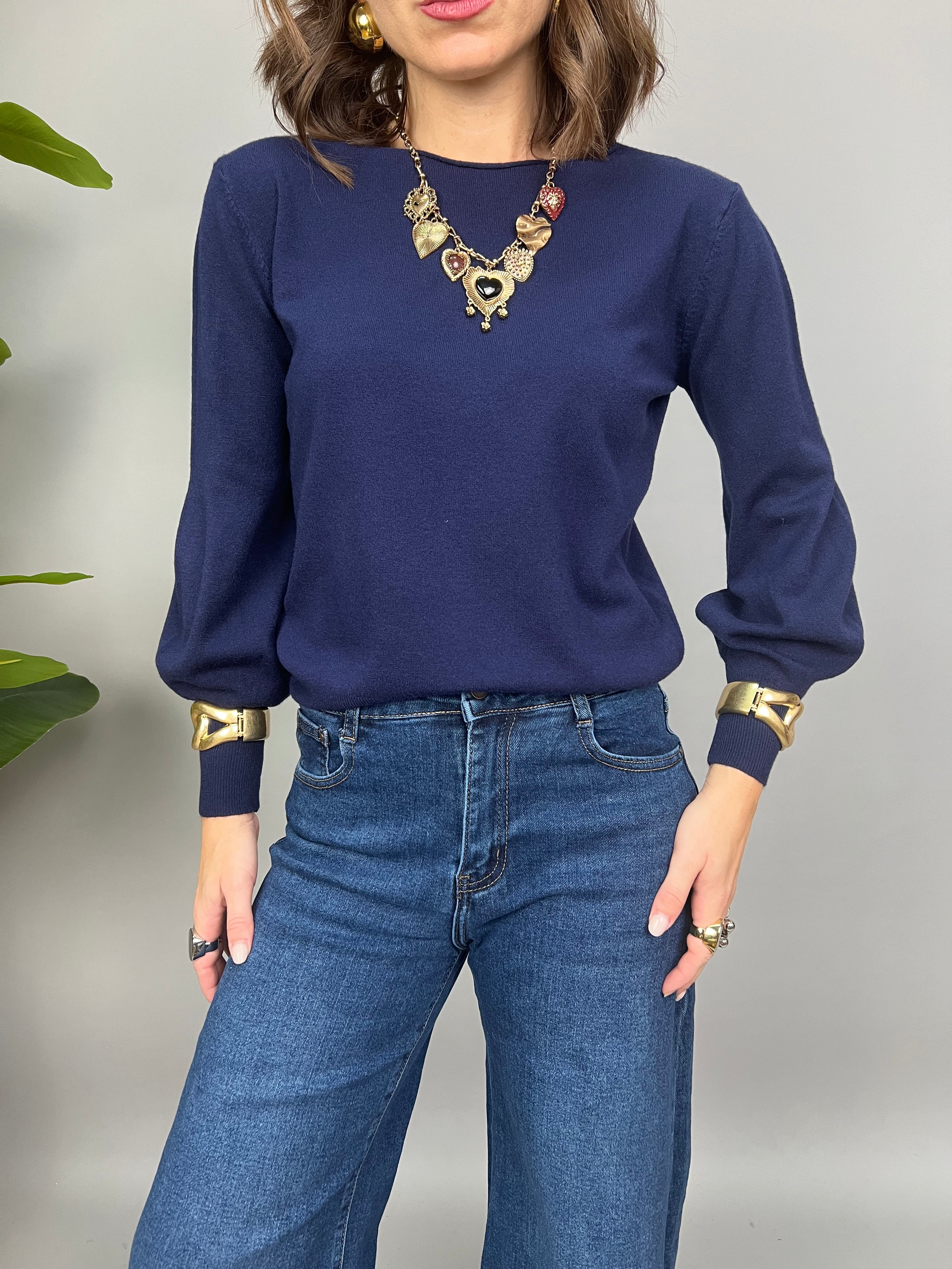 Maglioncino fino con scollatura leggermente a barca e maniche a palloncino sulla lunghezza.