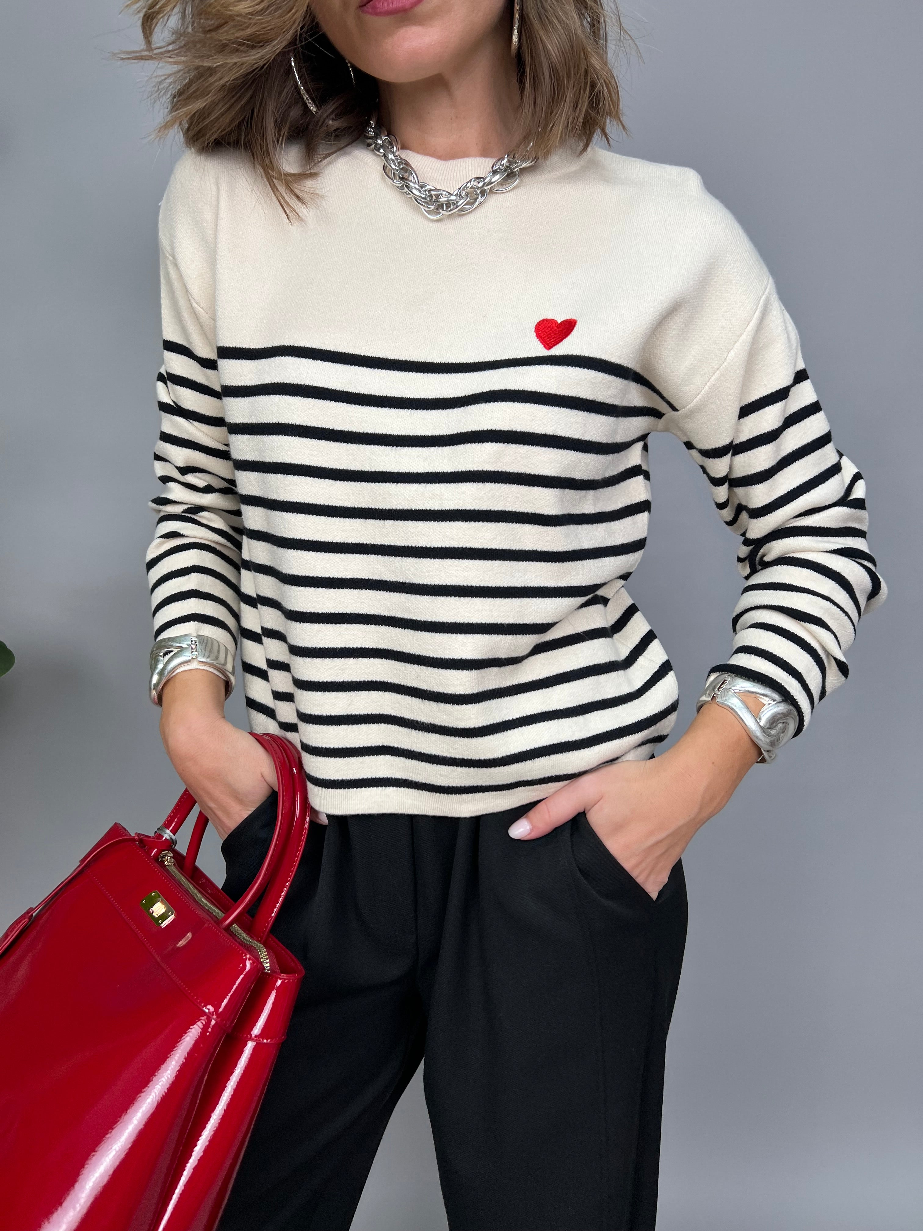Maglione comodo dal design a scatoletta. LA maglia è semi doppia e presenta un cuore ricamato frontale.
