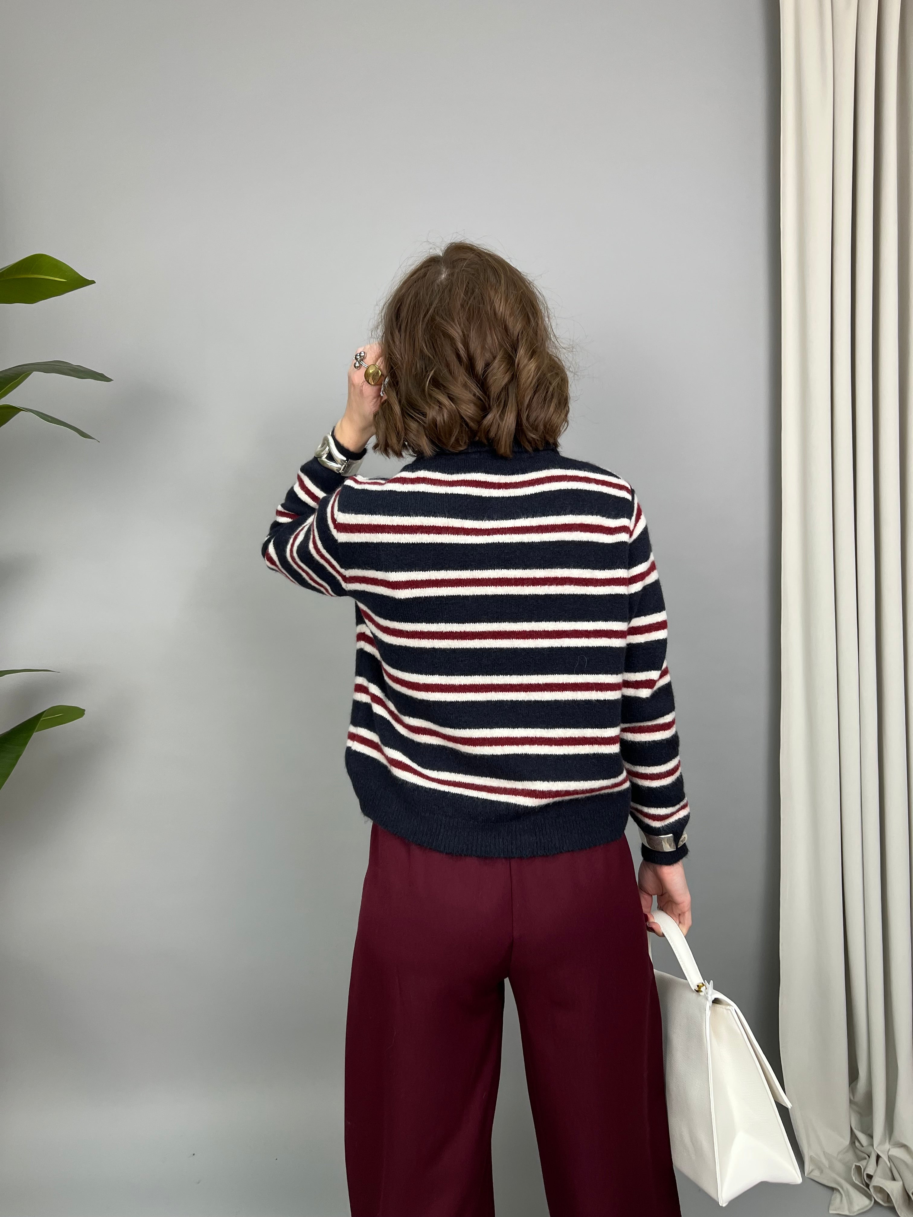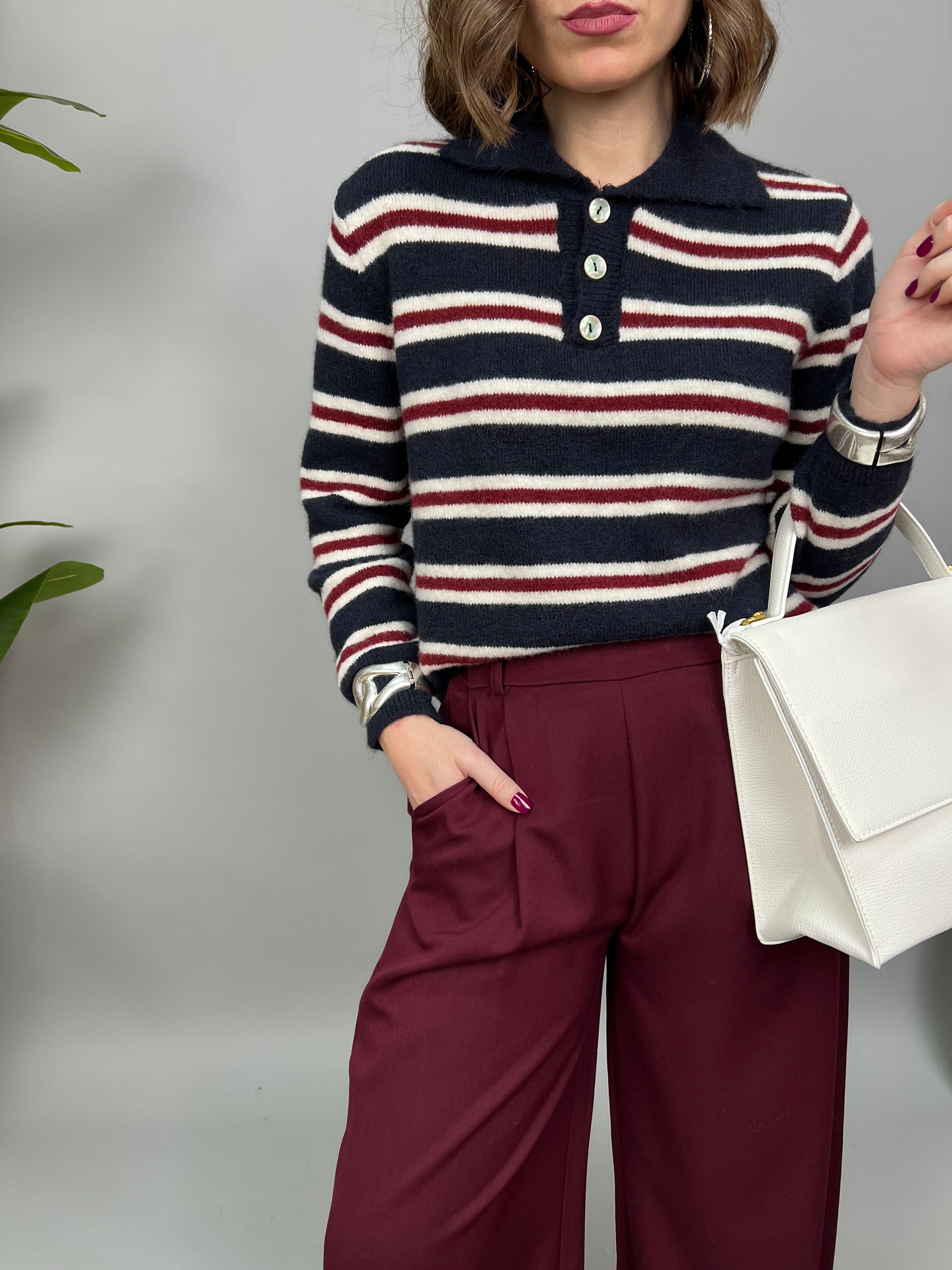 Maglione modello "polo" con colletto e bottoncini sullo scollo. Un modello in filato morbido e dalla vestibilità comoda. Presenta una fantasia a righe a contrasto su tutto il modello.