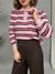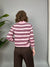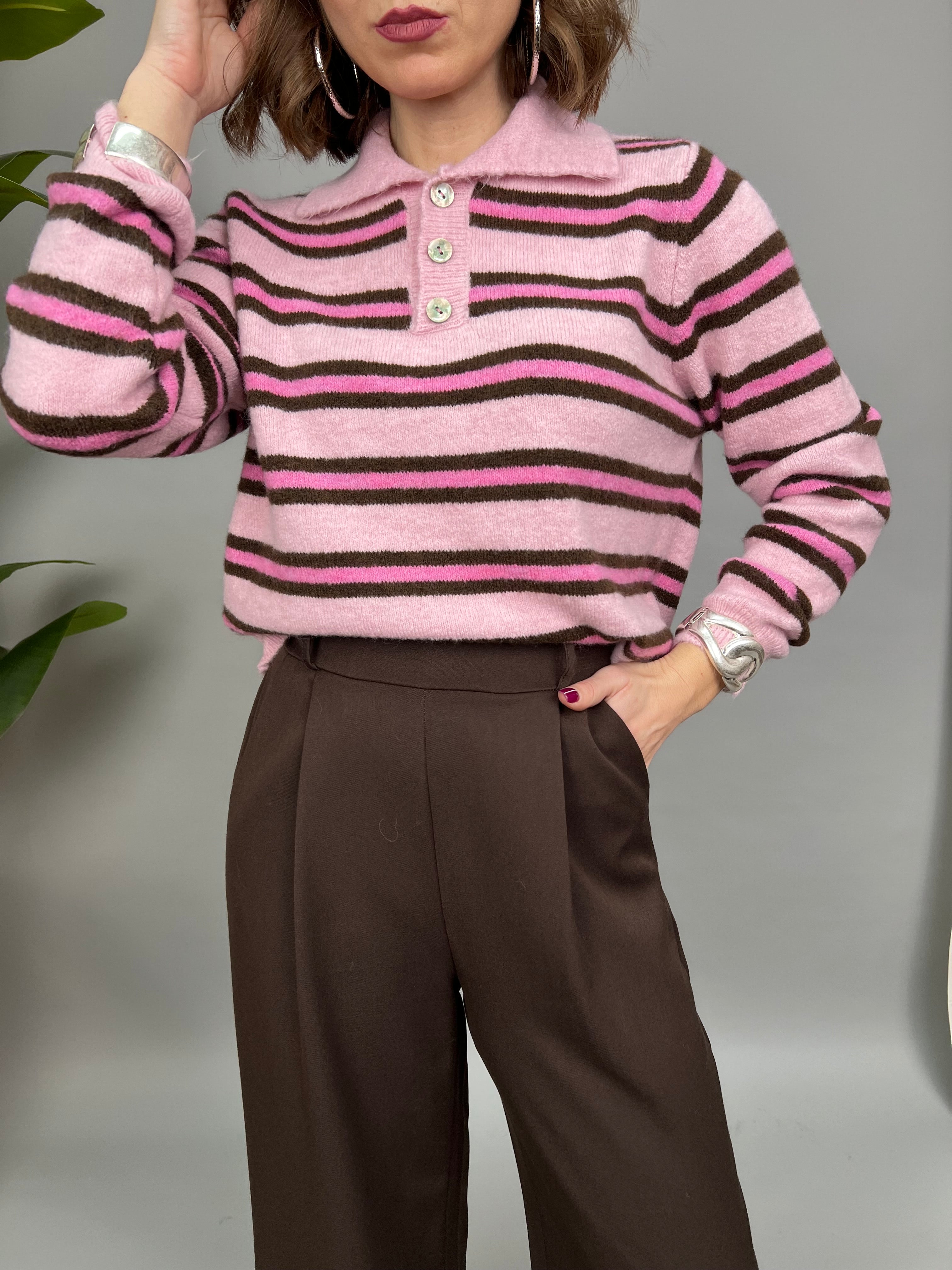 Maglione modello "polo" con colletto e bottoncini sullo scollo. Un modello in filato morbido e dalla vestibilità comoda. Presenta una fantasia a righe a contrasto su tutto il modello.