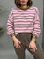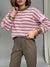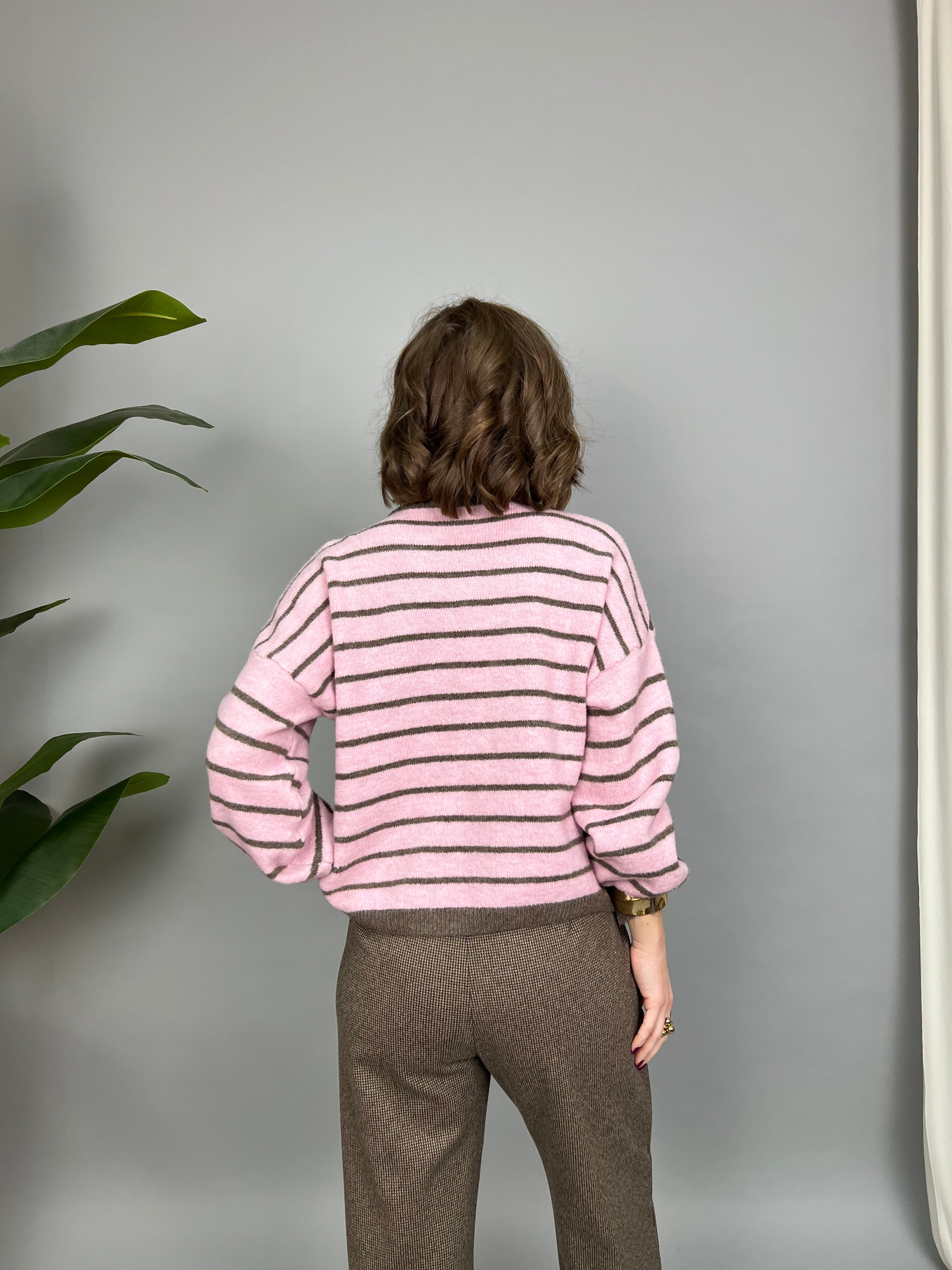 Maglione con collo tondo, manica a palloncino. Realizzato in un filato morbido e caldo. La vestibilità è molto comoda. Il modello presenta una fantasia a righe a contrasto su tutto il modello.