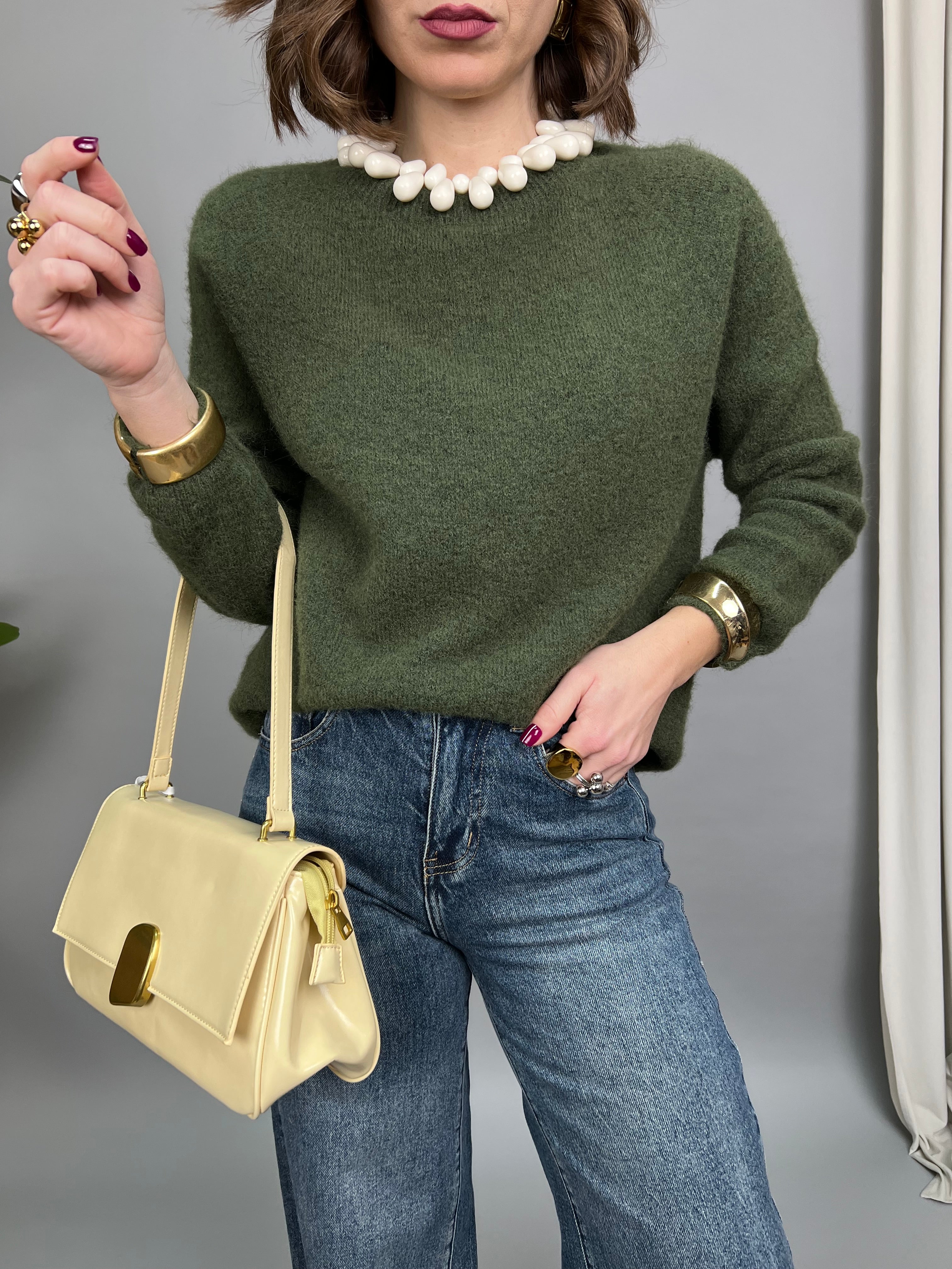 Maglione collo tondo, maniche raglan, dal tessuto morbido, caldo e soffice. La vestibilità è comoda.