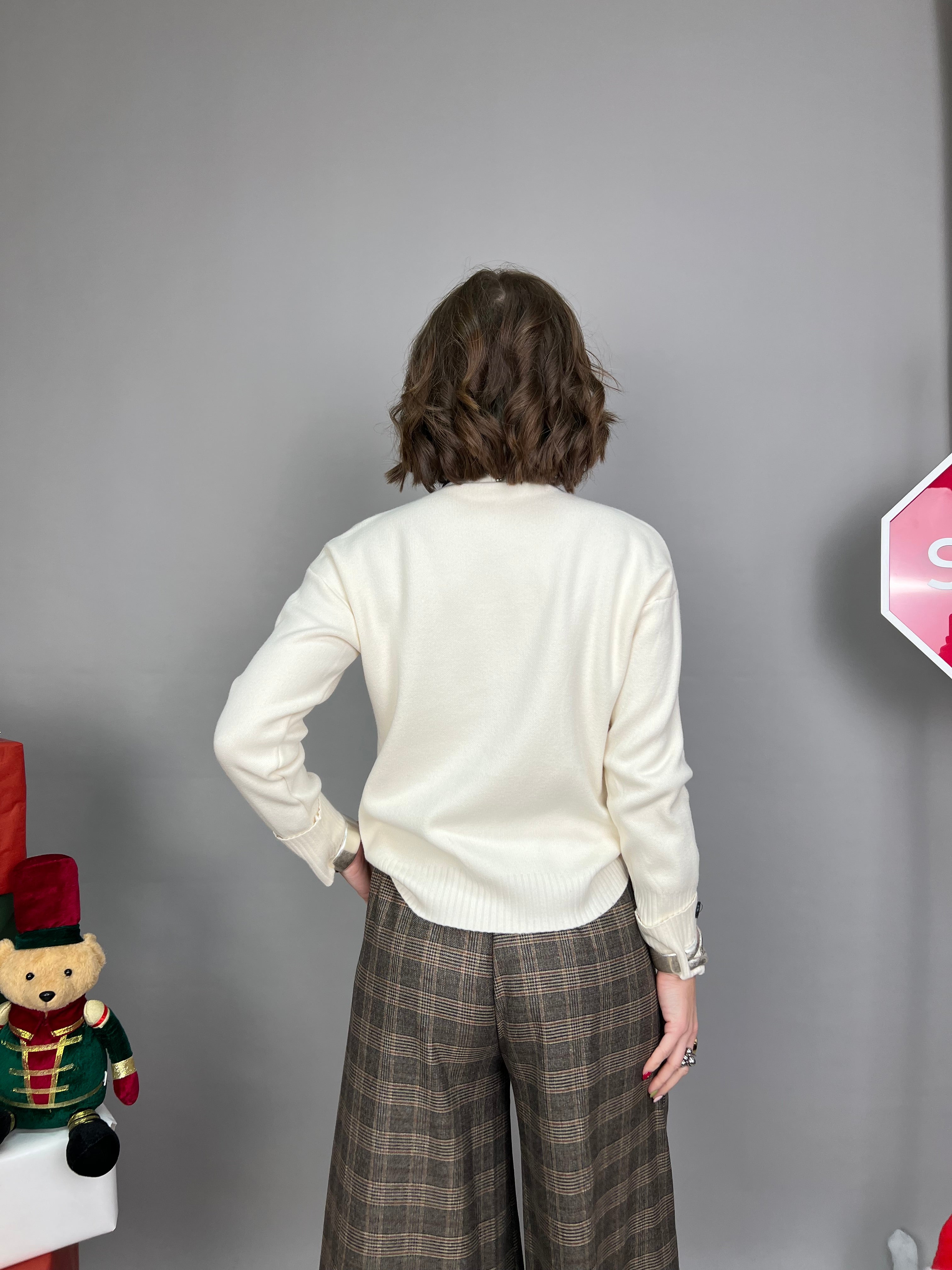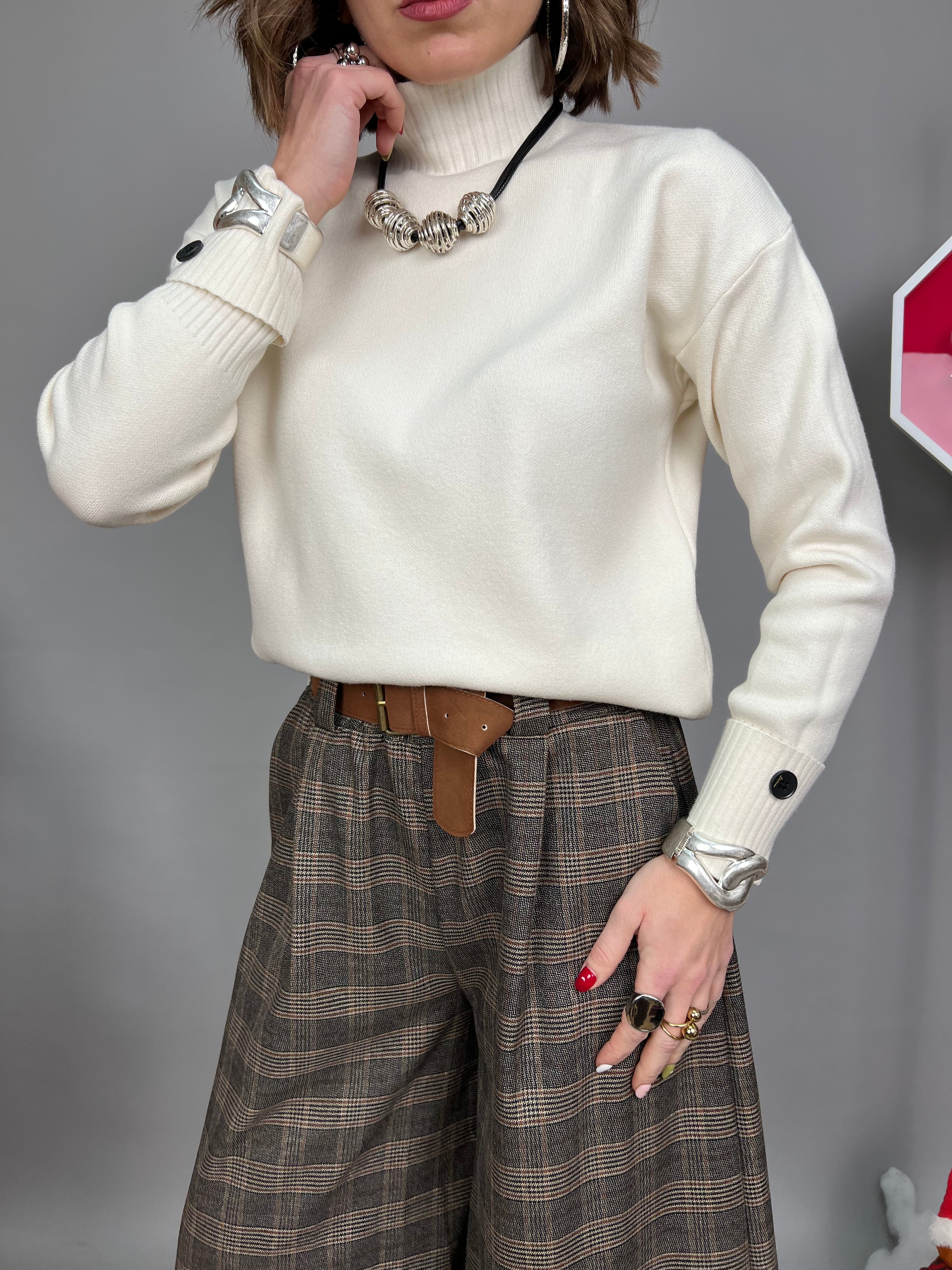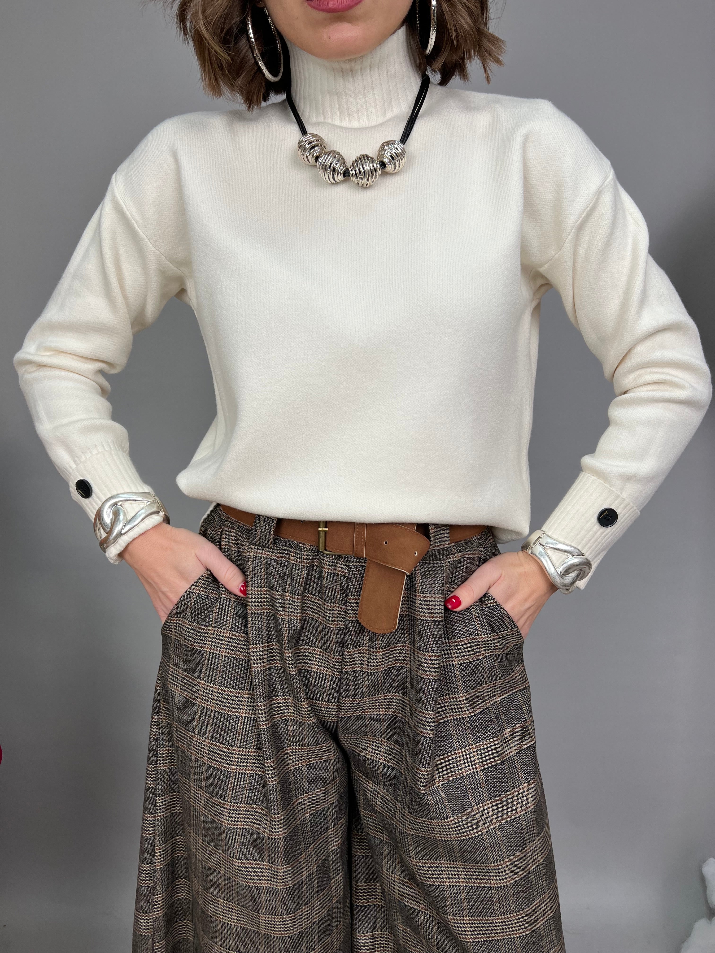 Maglione con collo medio, in tessuto morbido e dalla vestibilità comoda. Il modello è caratterizzato da un risvolto sui polsini. I bordi di collo, polsini e lunghezza, presentano una lavorazione a coste verticali.