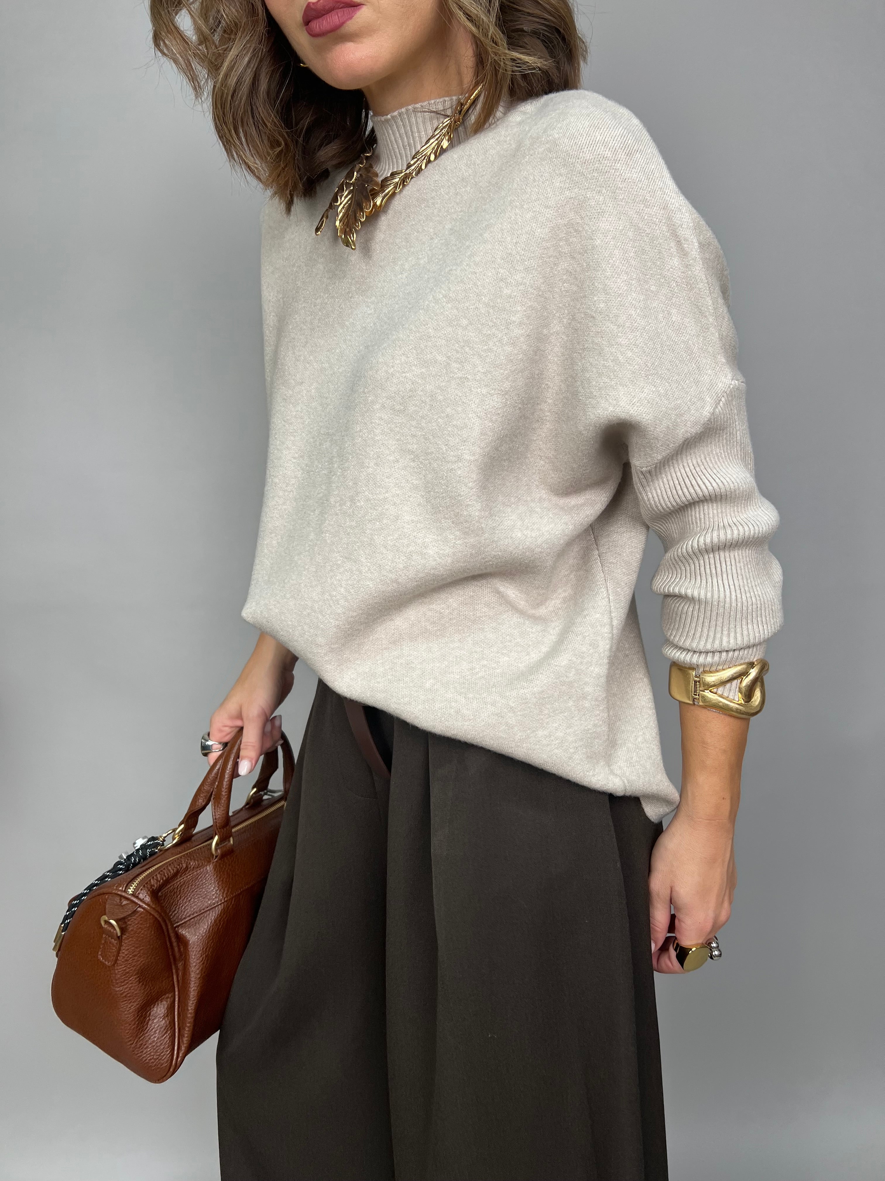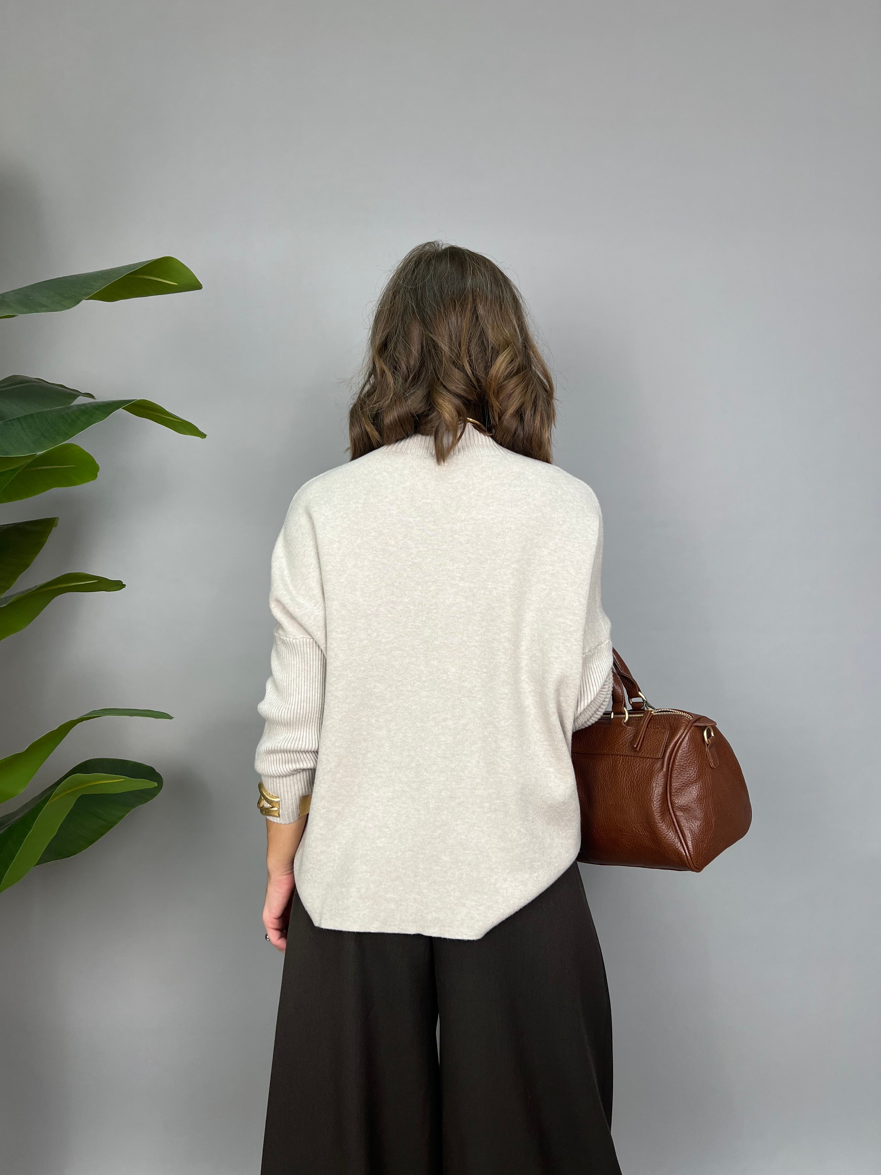 Maglione dalla vestibilità molto comoda con collo medio e maniche strette.