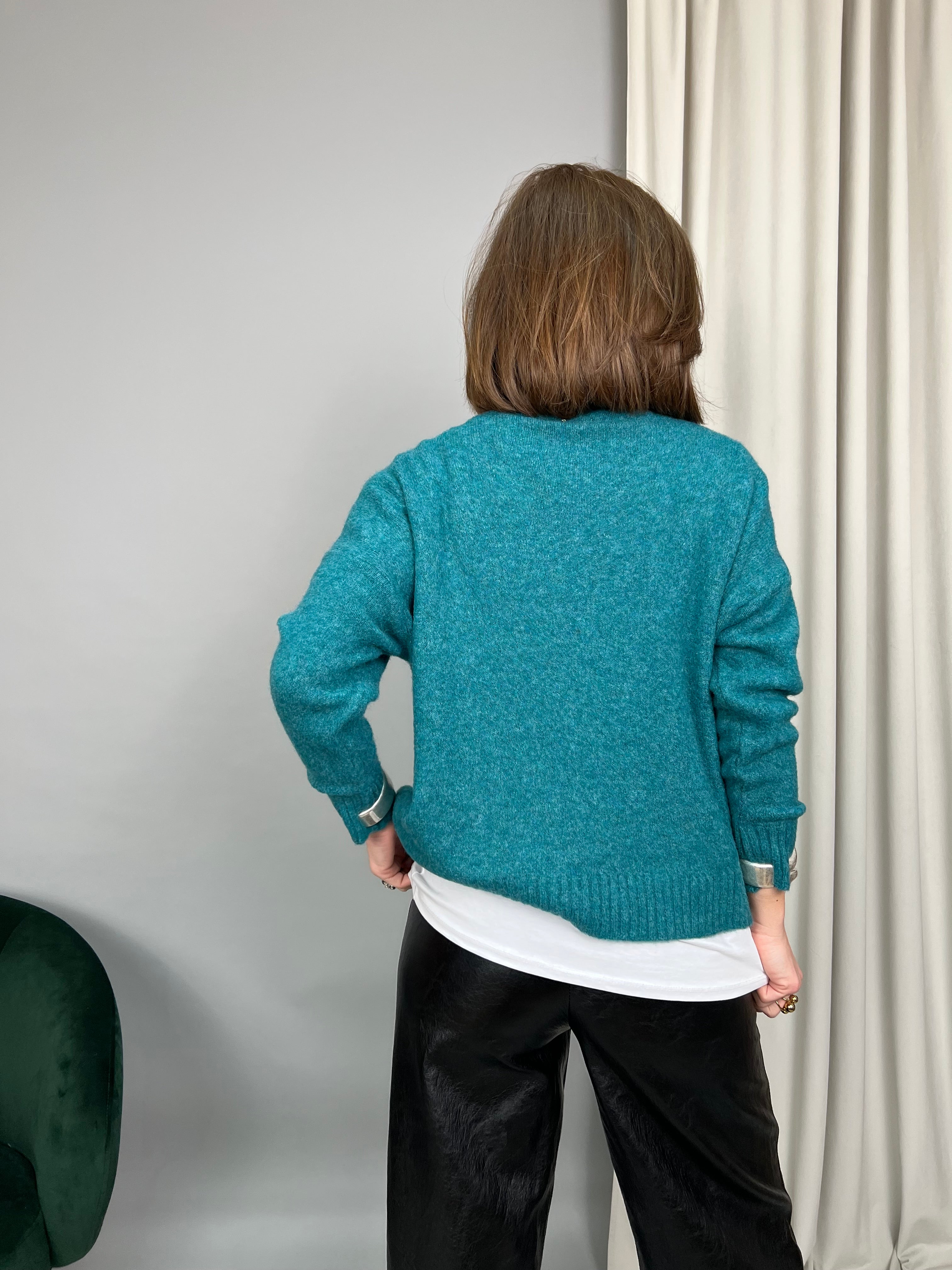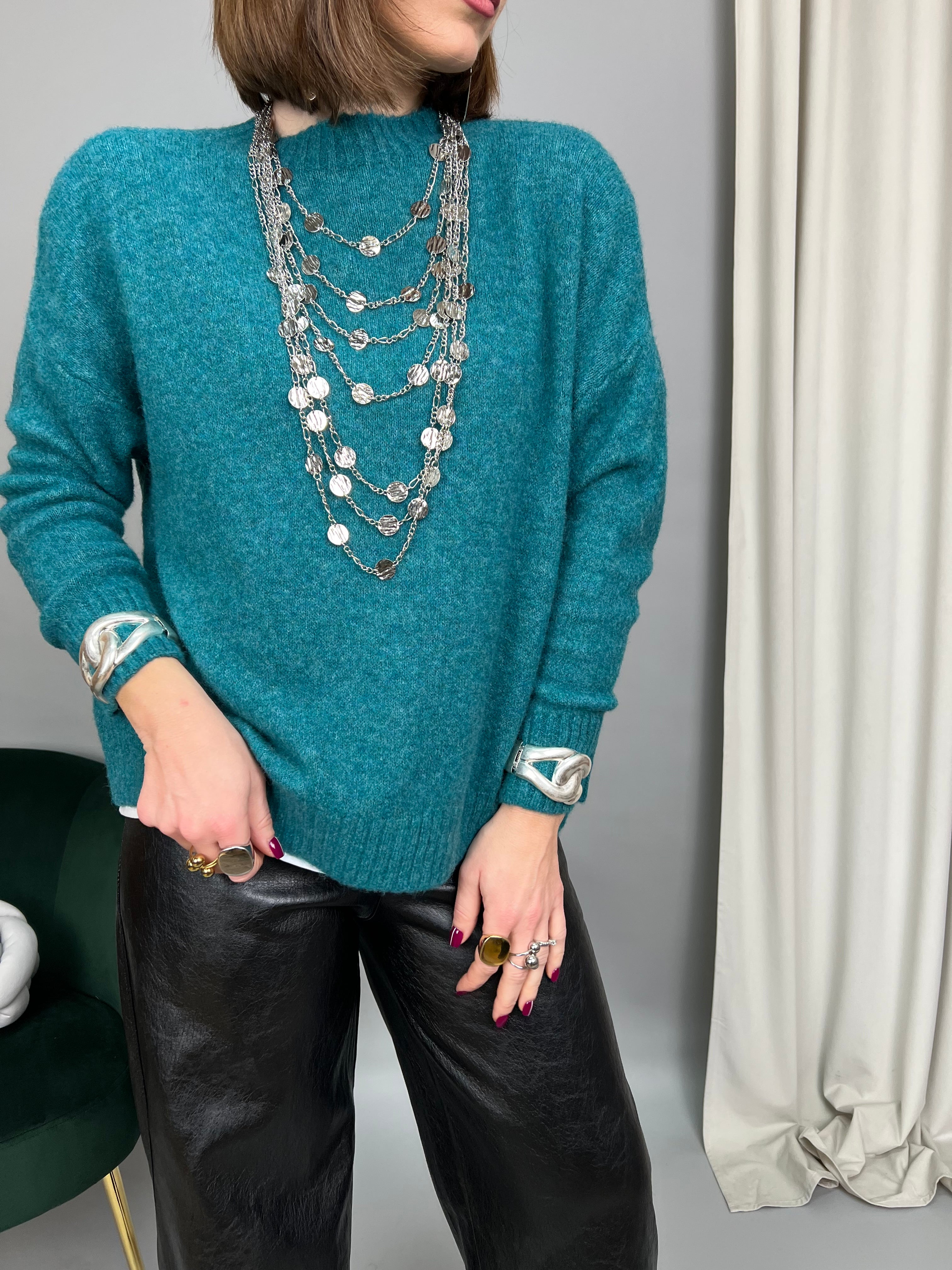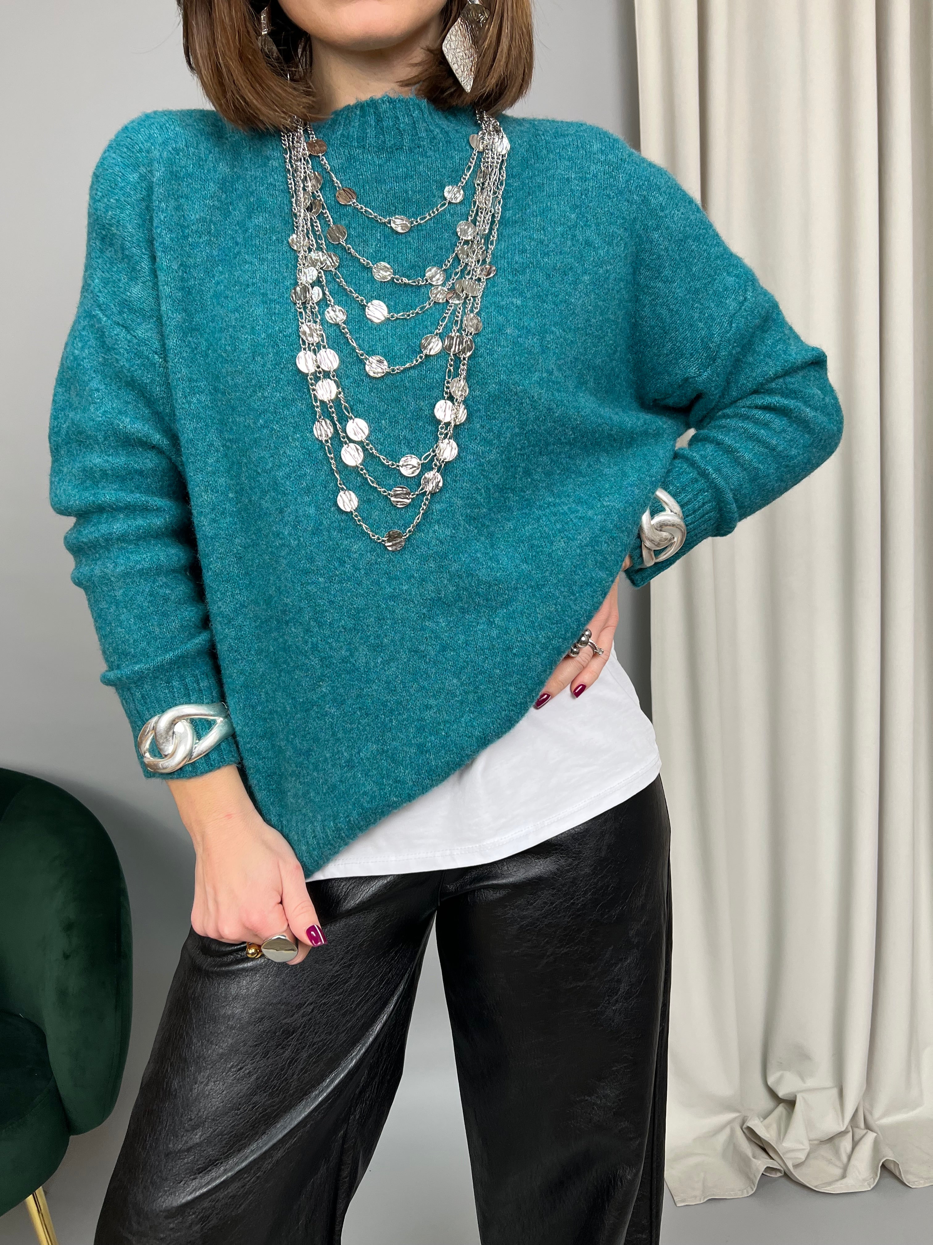 Maglione collo tondo accollato, taglio over dalla vestibilità molto comoda. Realizzato in maglia soffice, morbida e calda.