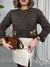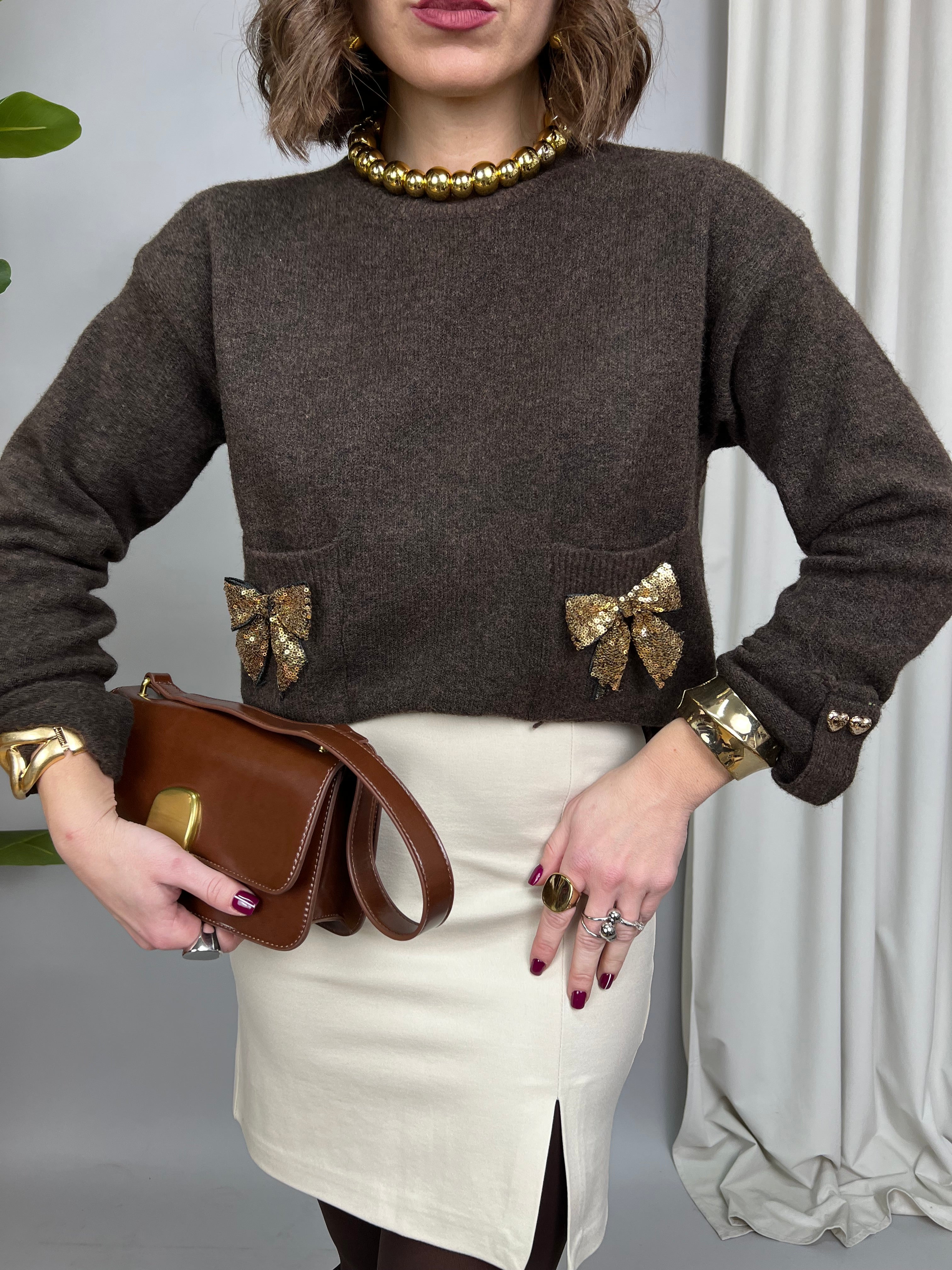 Maglione collo tondo, in tessuto caldo e morbido. Il modello presenta due taschine frontali, su ognuna è applicato un fiocco dorato in paillettes. Le maniche presentano un risvolto, impreziosite da due bottoncini dorati a forma di cuore.