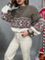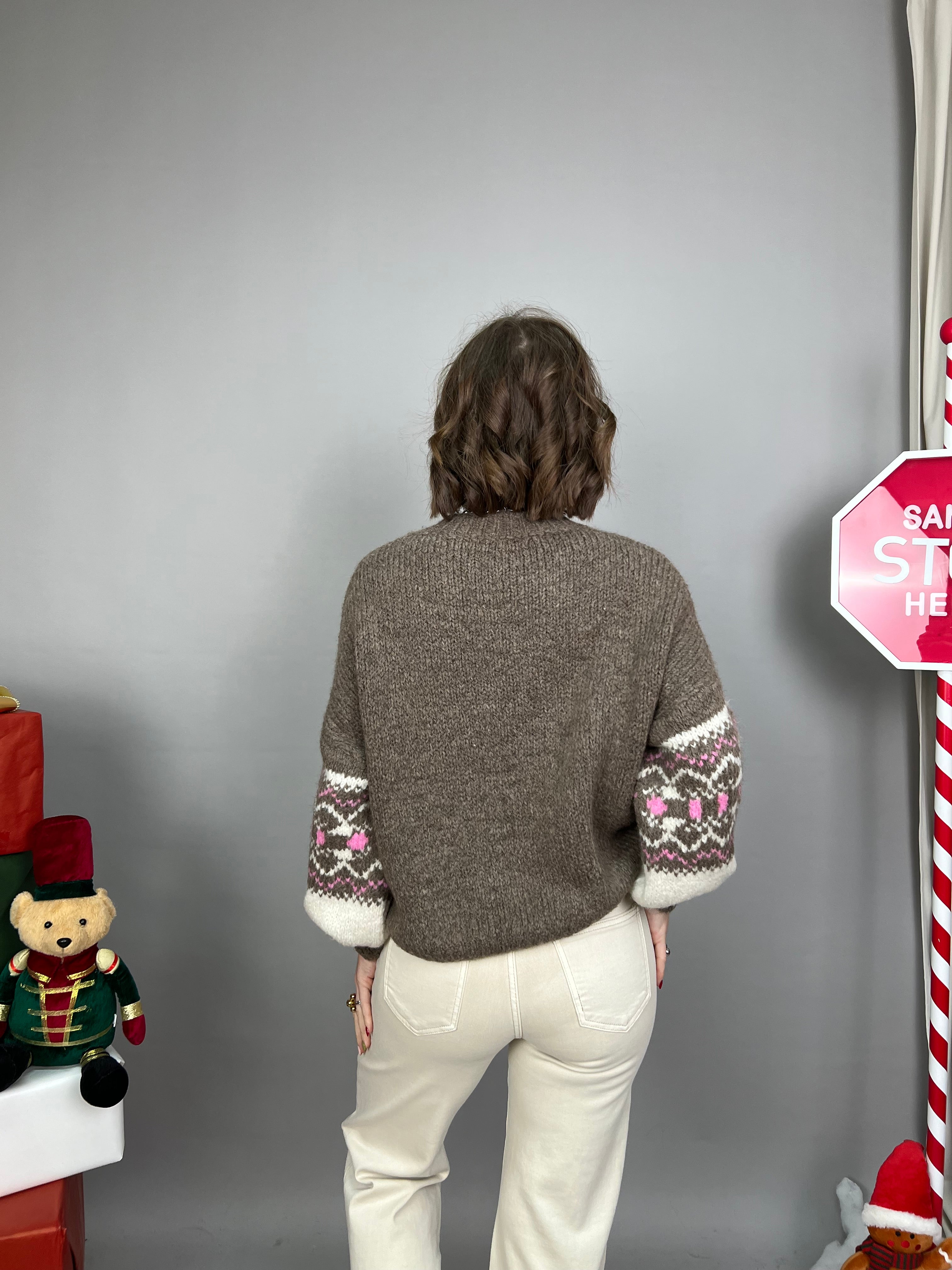 Maglione collo tondo e maniche a palloncino, dal taglio over. Un modello in filato morbido e dalla vestibilità molto comoda. Presenta una fantasia a contrasto sulla parte frontale di busto e maniche.