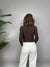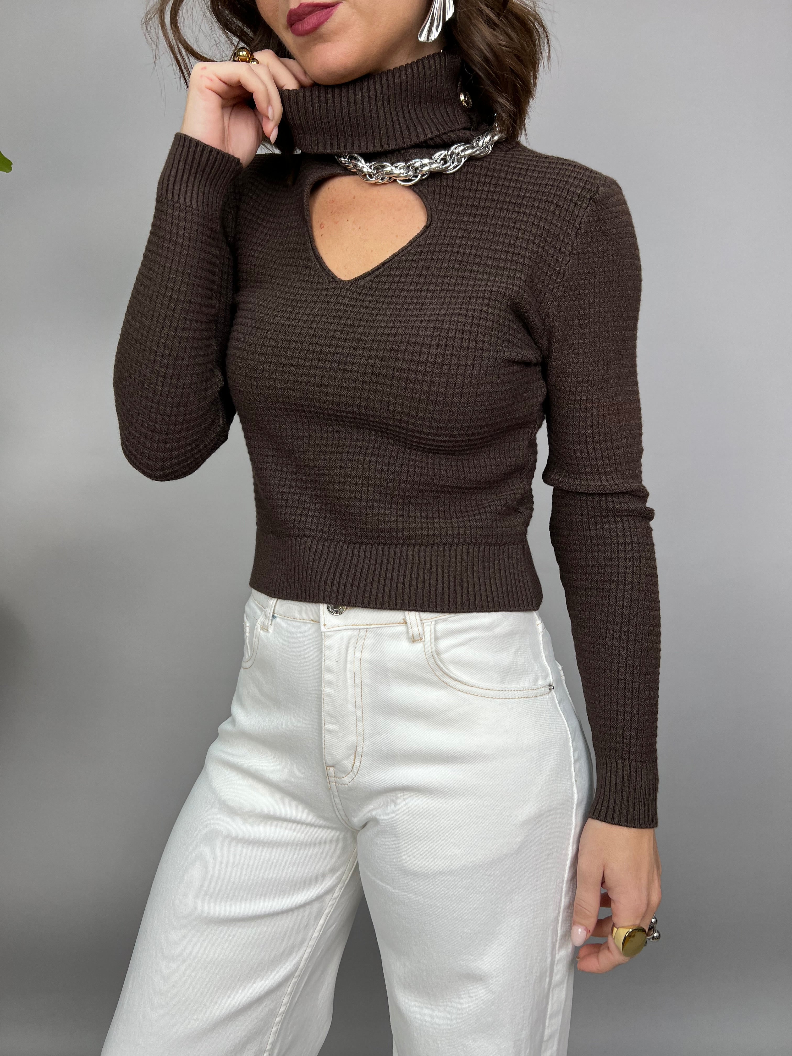 Maglioncino con collo alto comodo decorato da bottoncini laterali. Il modello presenta un'apertura frontale e la lunghezza è cropped