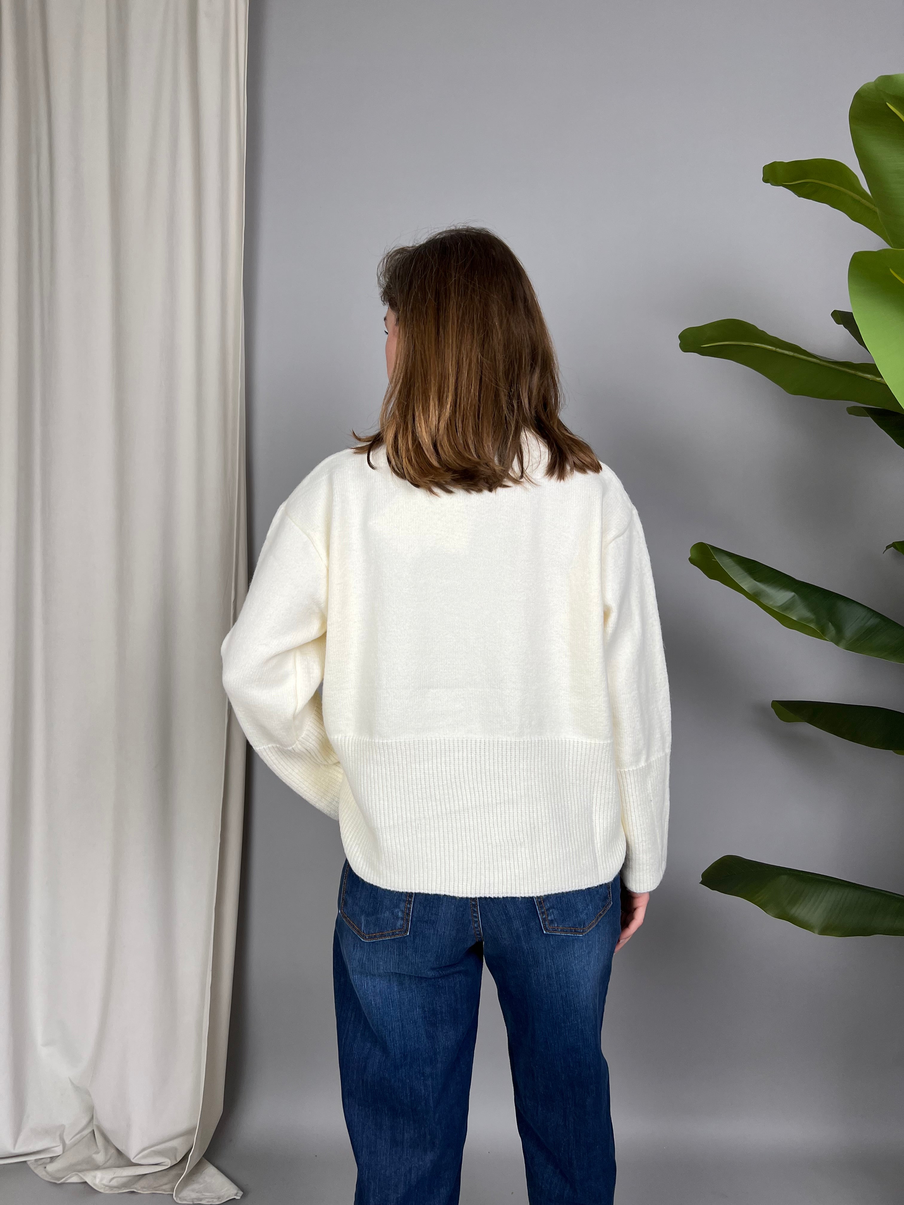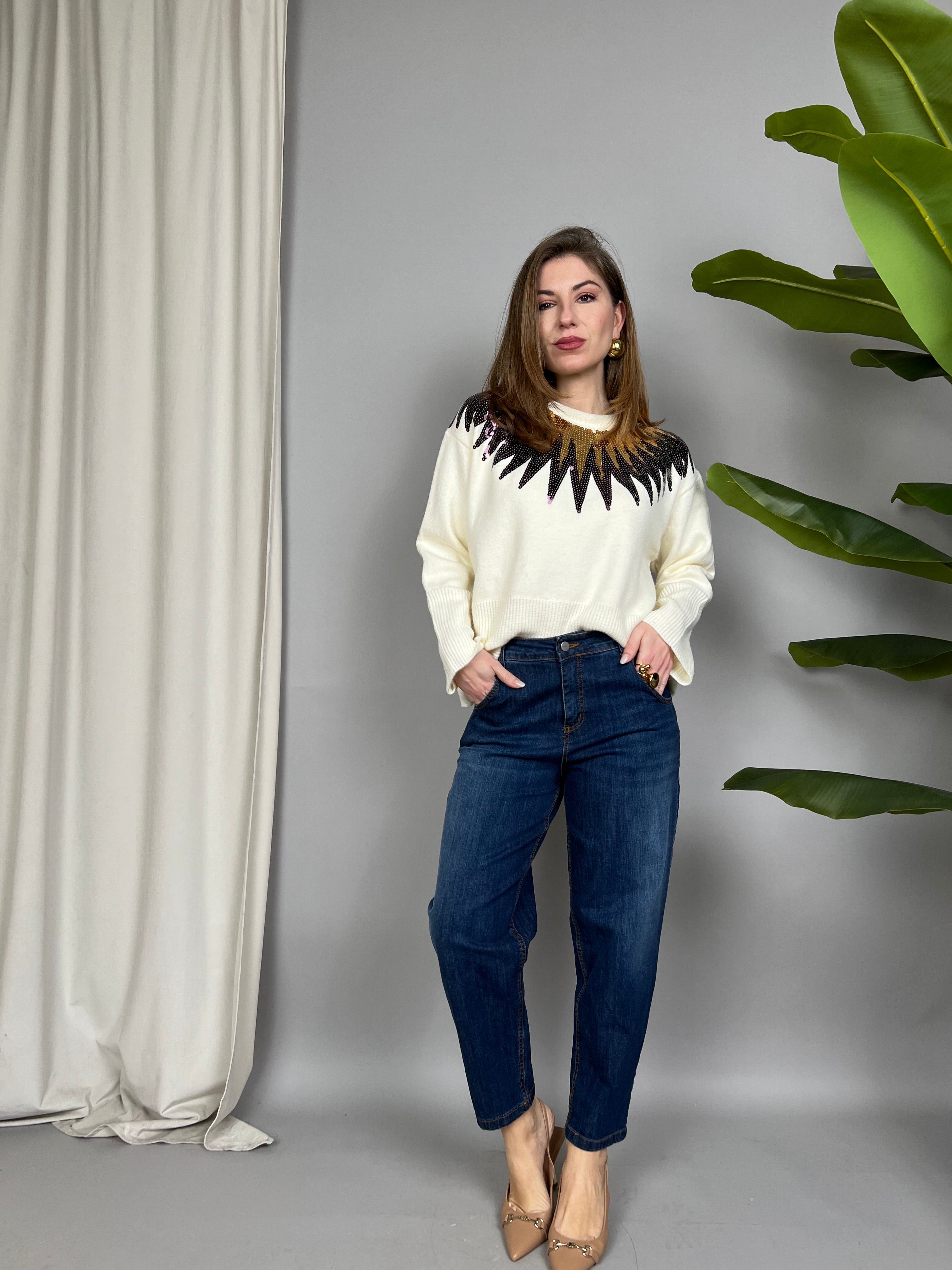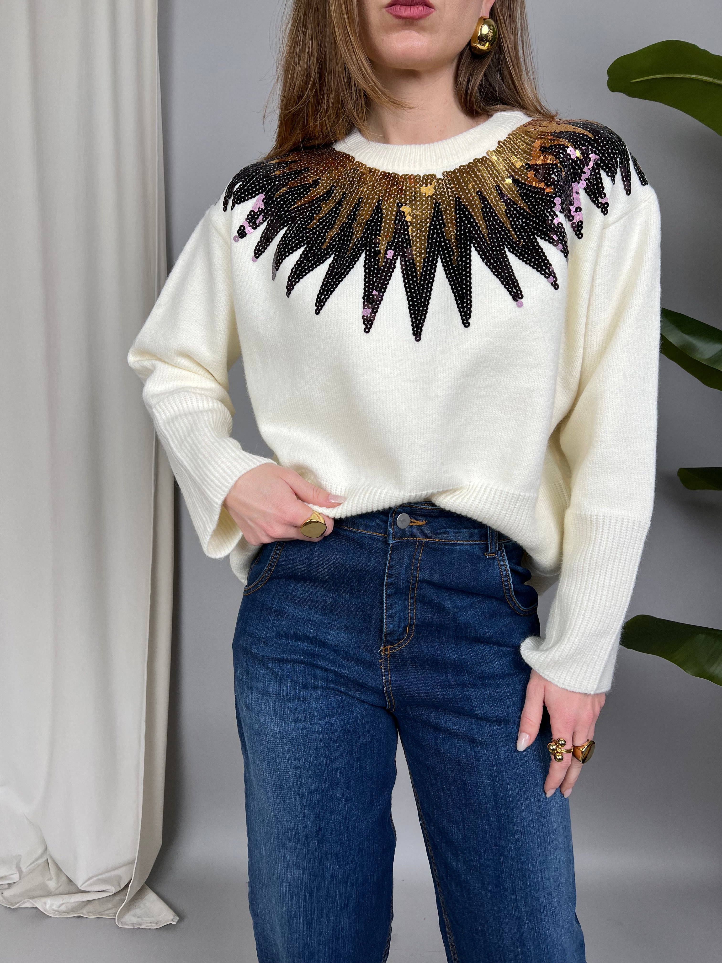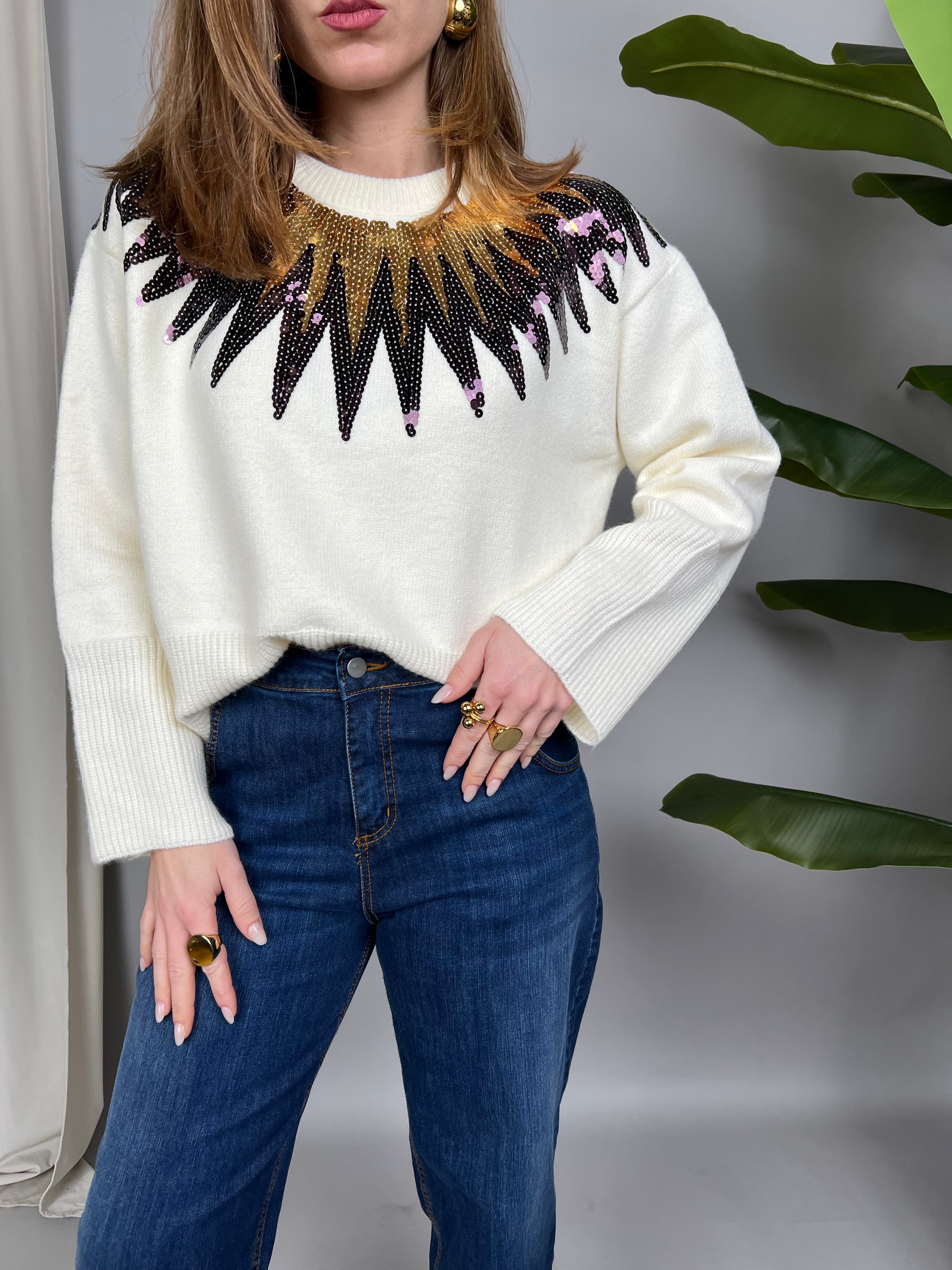 Maglione con collo tondo e paillettes sulla parte superiore. La vestibilità è comoda