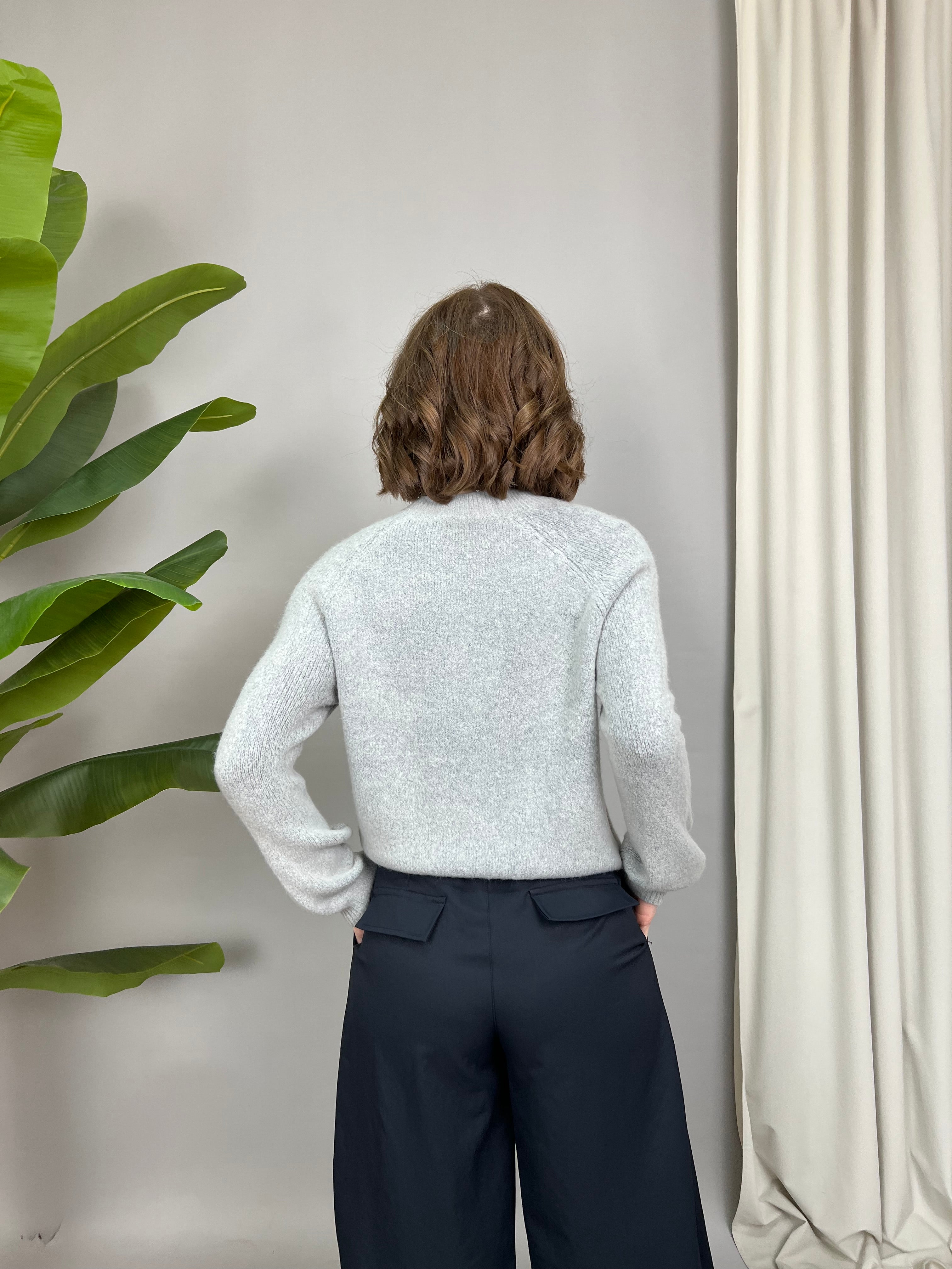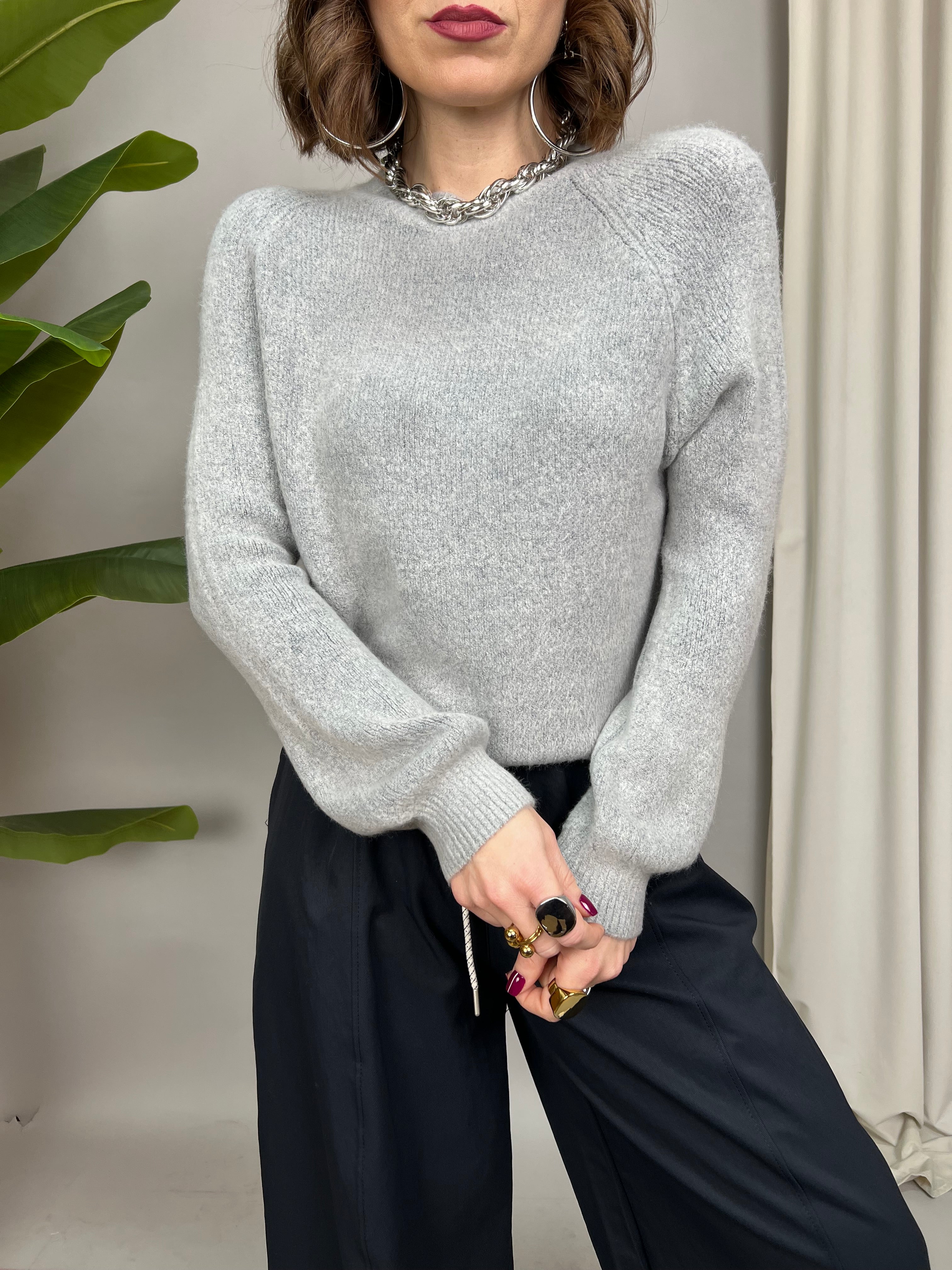 Maglione collo tondo e maniche raglan, dal tessuto morbido, soffice e caldo. La vestibilità è comoda. Il modello presenta la lunghezza di busto e maniche leggermente a palloncino.