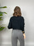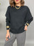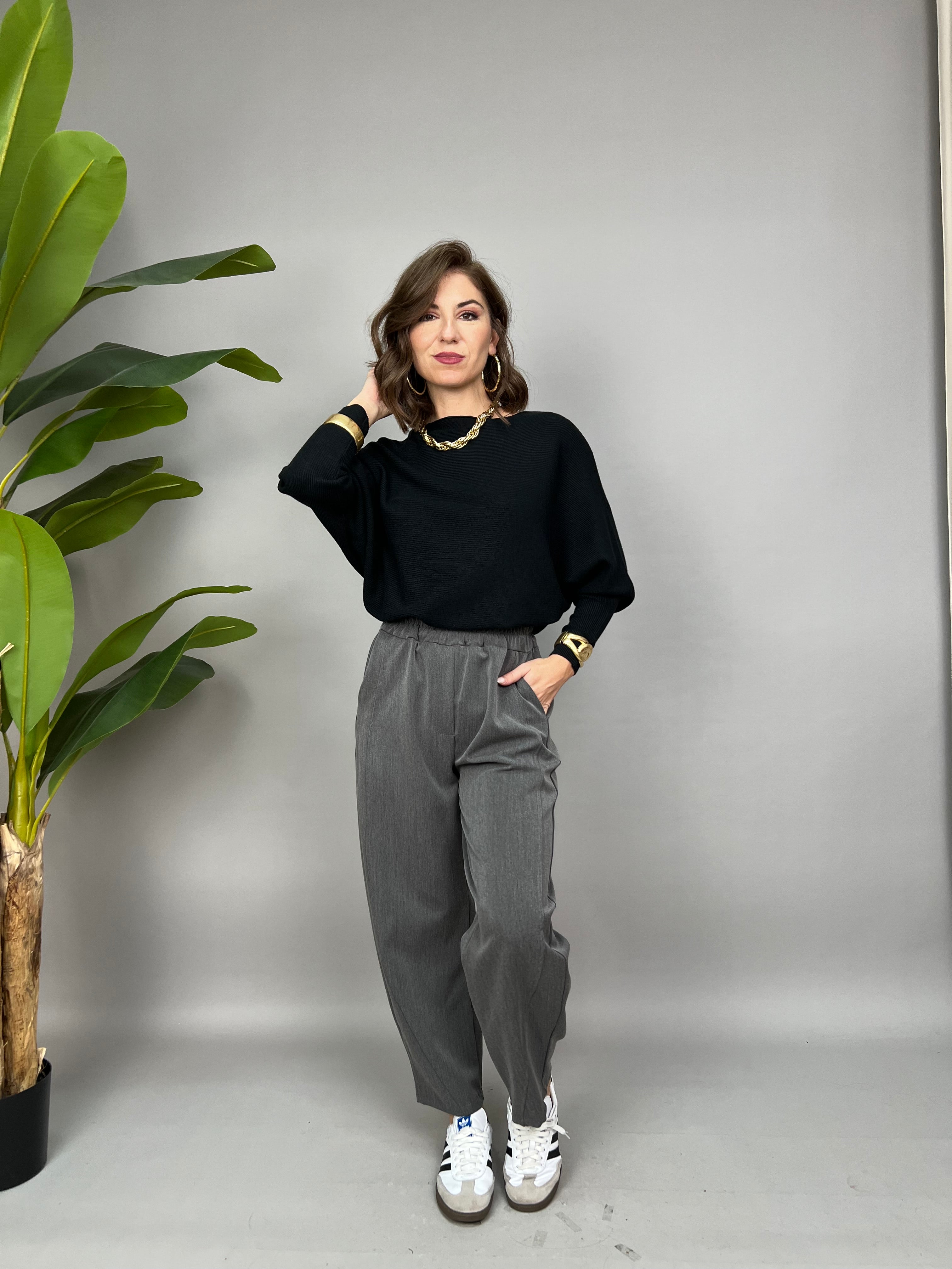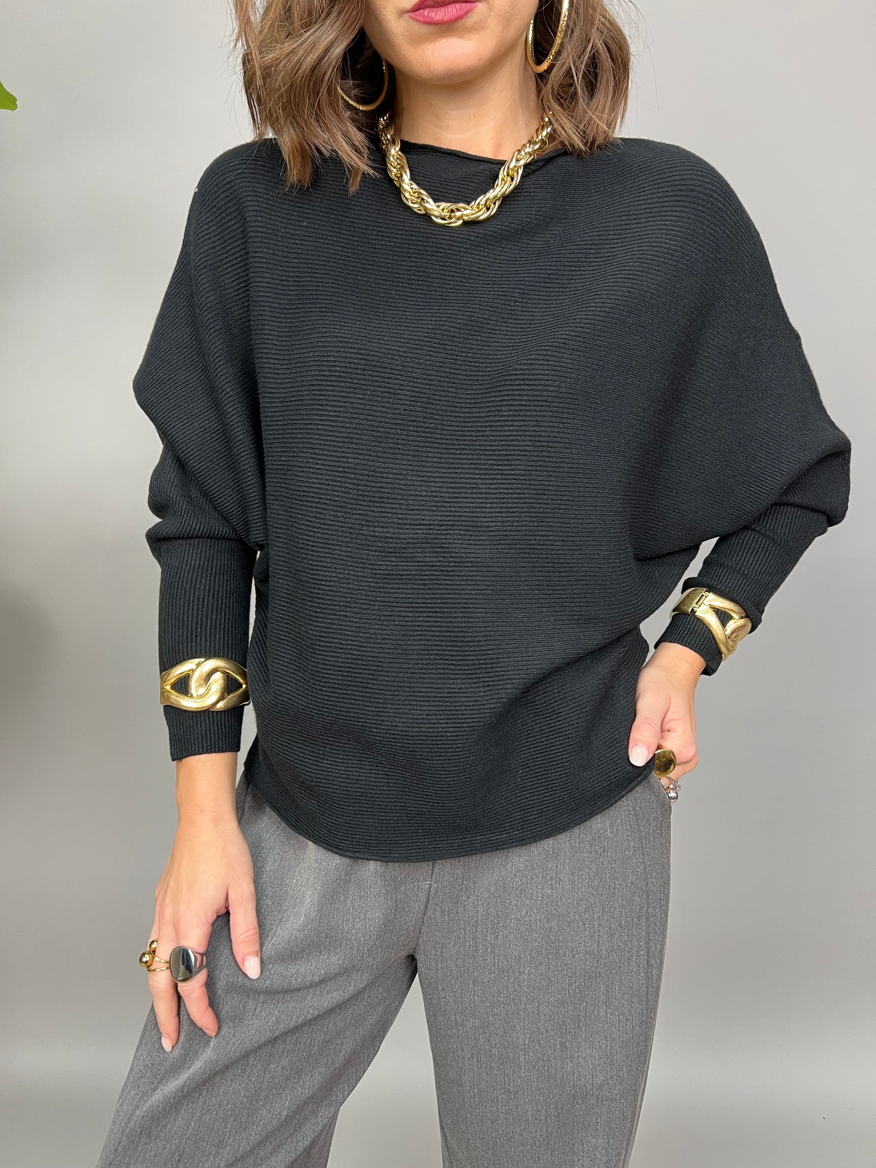 Maglioncino con collo a barca e con maniche a pipistrello. Il tessuto è a costine orizzontali e la lunghezza regolare.