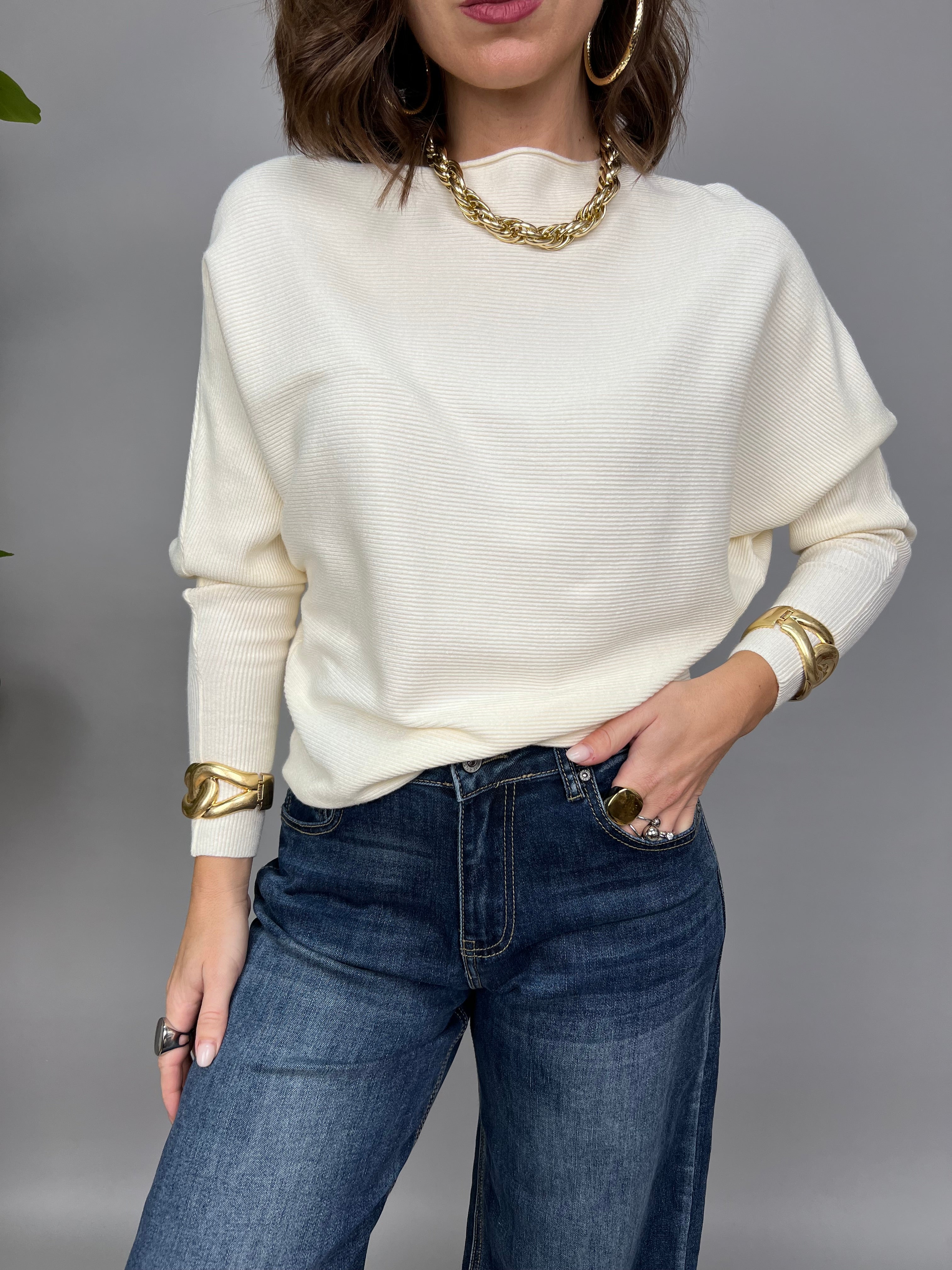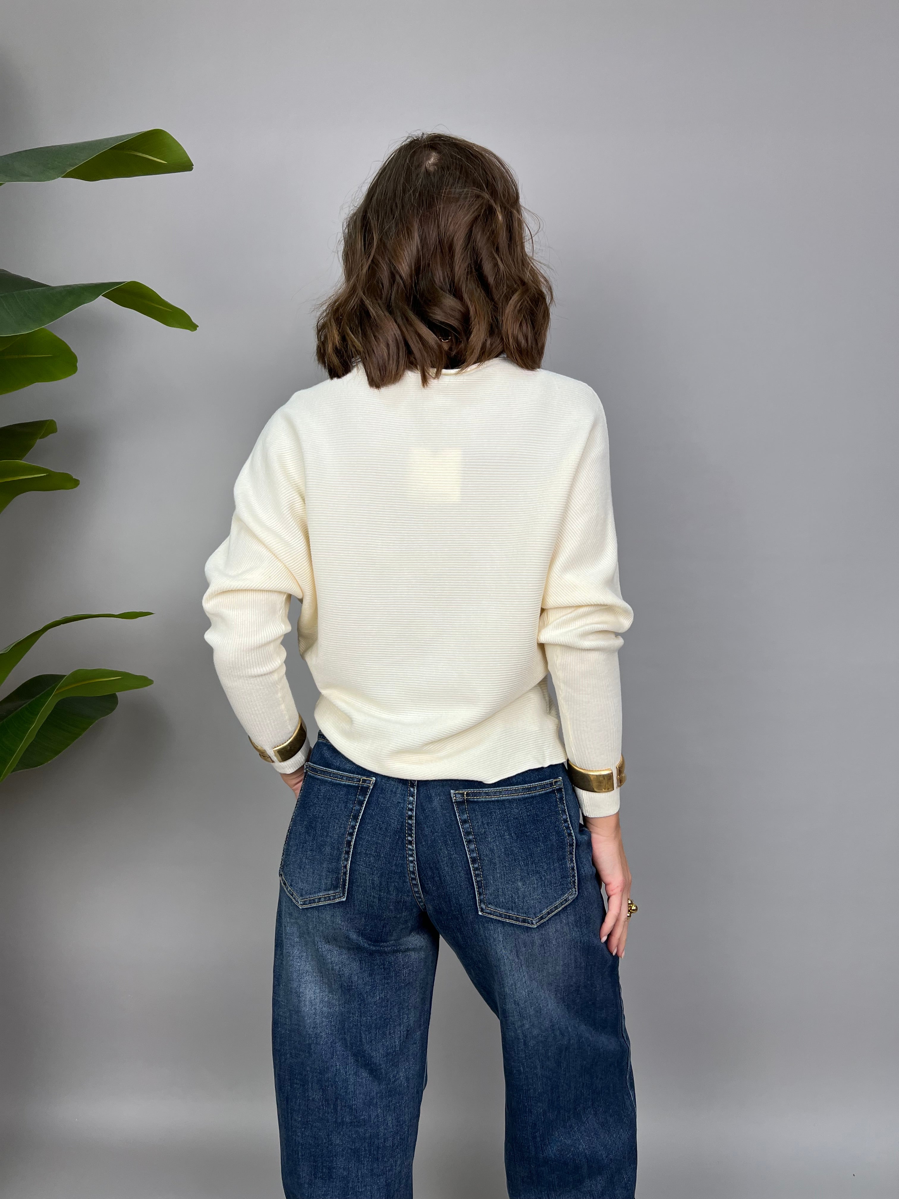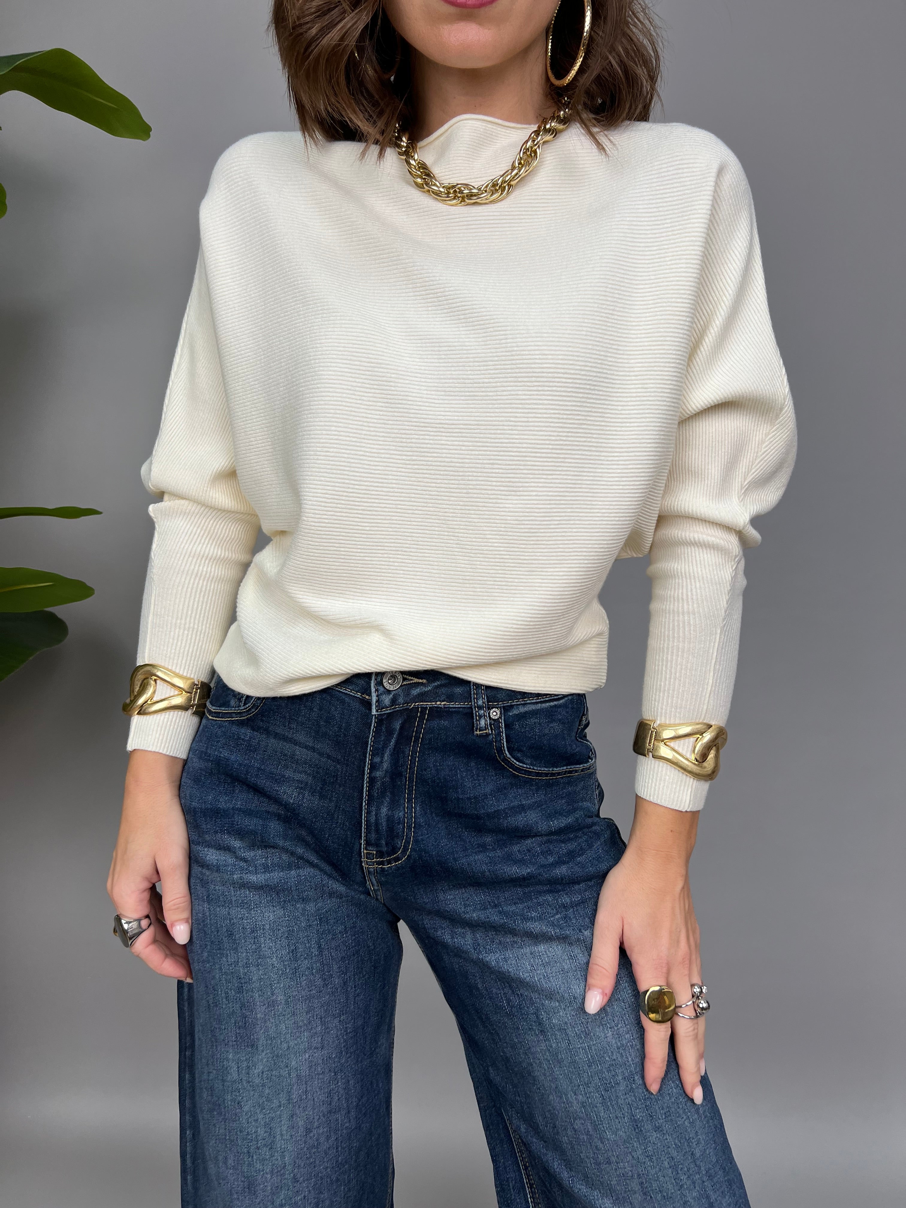 Maglioncino con collo a barca e con maniche a pipistrello. Il tessuto è a costine orizzontali e la lunghezza regolare.